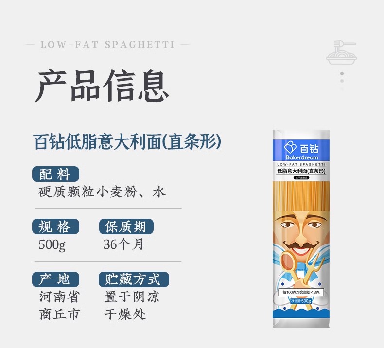 500g 百钻 低脂意大利面(直条型)意大利直面 轻食意粉意面条