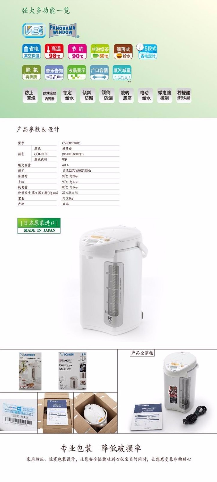 ZOJIRUSHI/象印 日本原装VE真空保温电热水瓶 CV-DDH40C-WP 4LJPY带授权招加盟代理