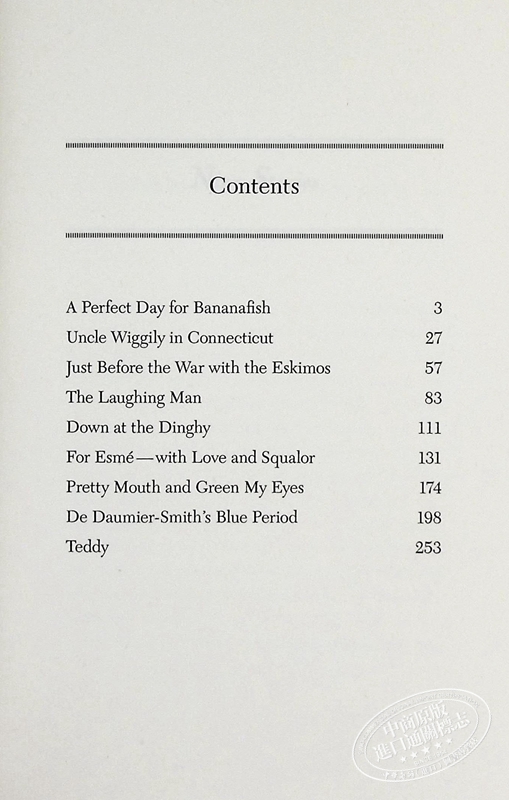 故事:《香蕉鱼的一天》、《威吉利叔叔在康涅狄格》、《就在与爱斯基摩人的战争之前》、《笑面人》、《在小艇下》、《为了艾斯米——带着爱和肮脏》、《美丽的嘴巴和绿色的眼睛》、《杜米埃-史密斯的蓝色时期》和《泰迪》。