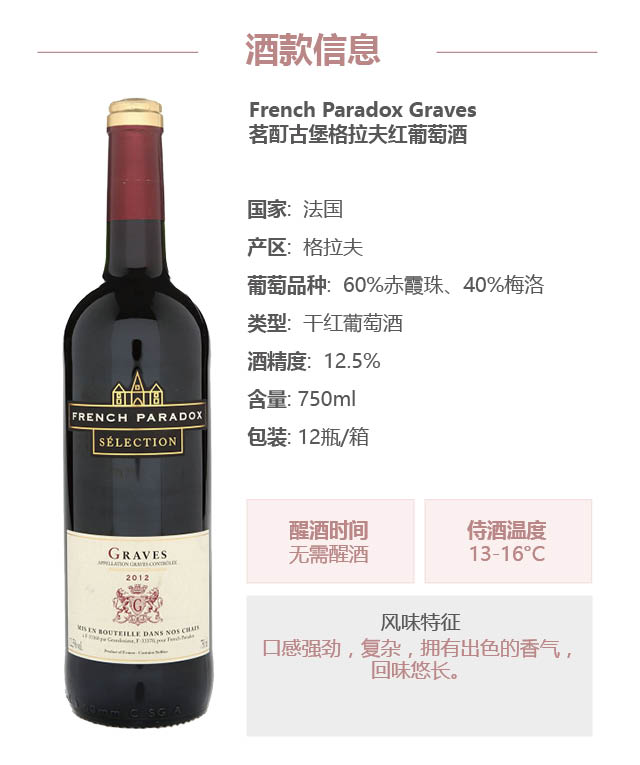 【双瓶优惠】茗酊古堡-格拉夫红葡萄酒 French Paradox Graves 2*750ml