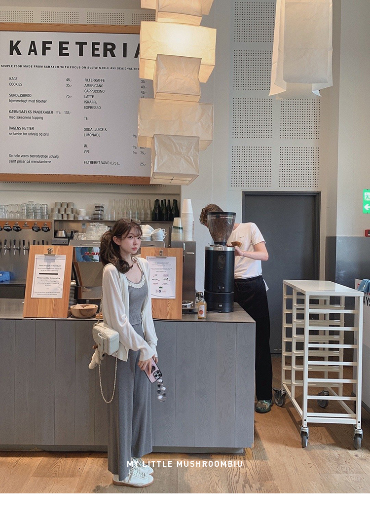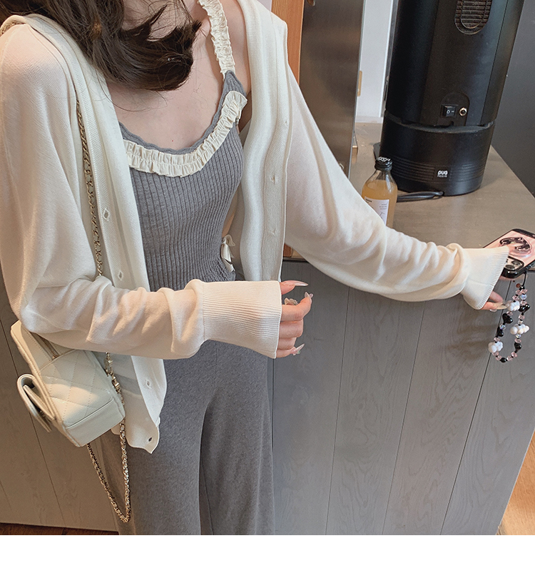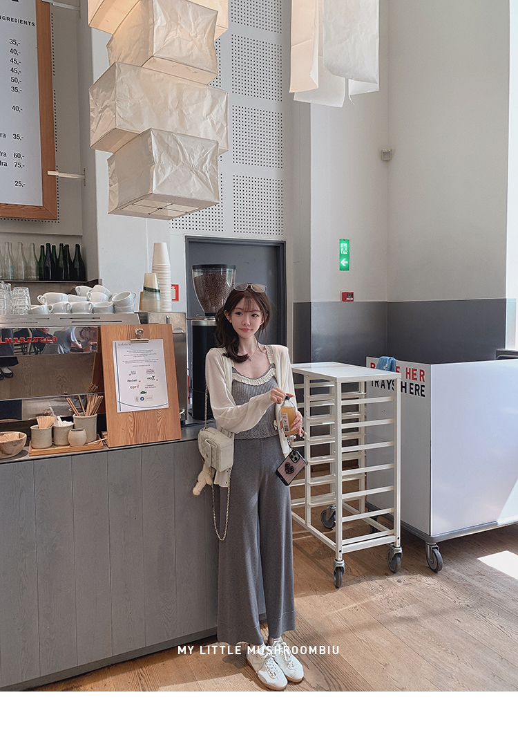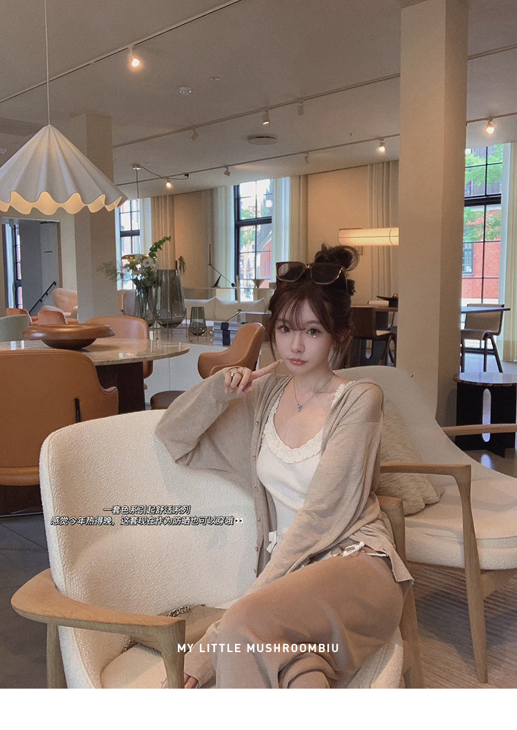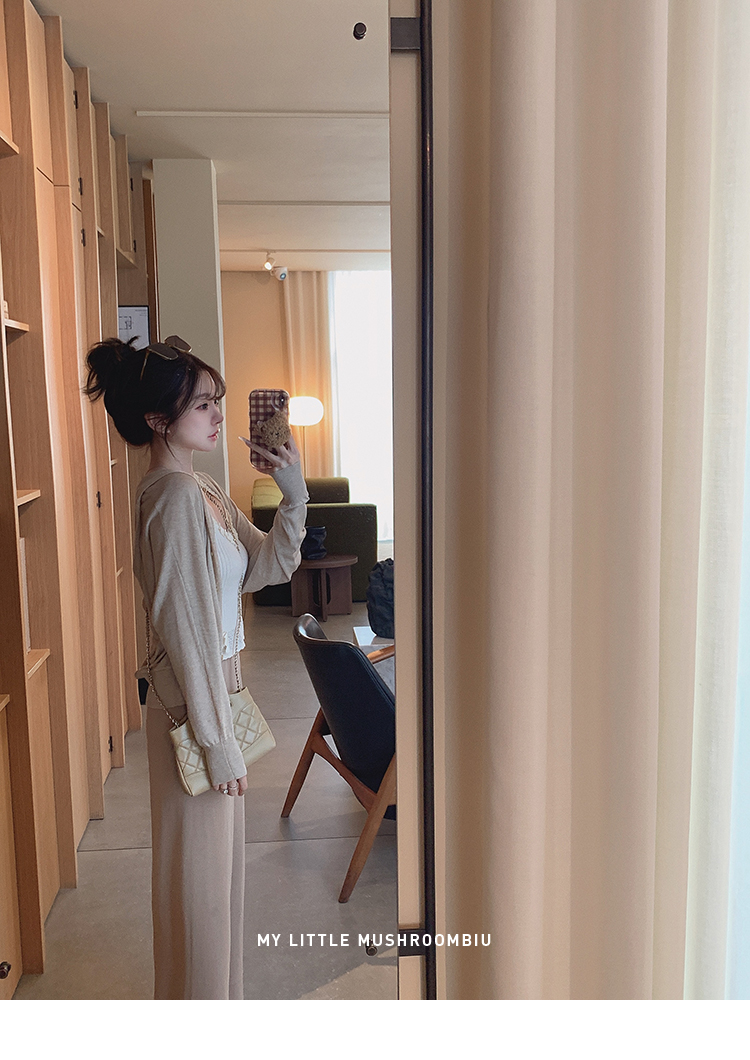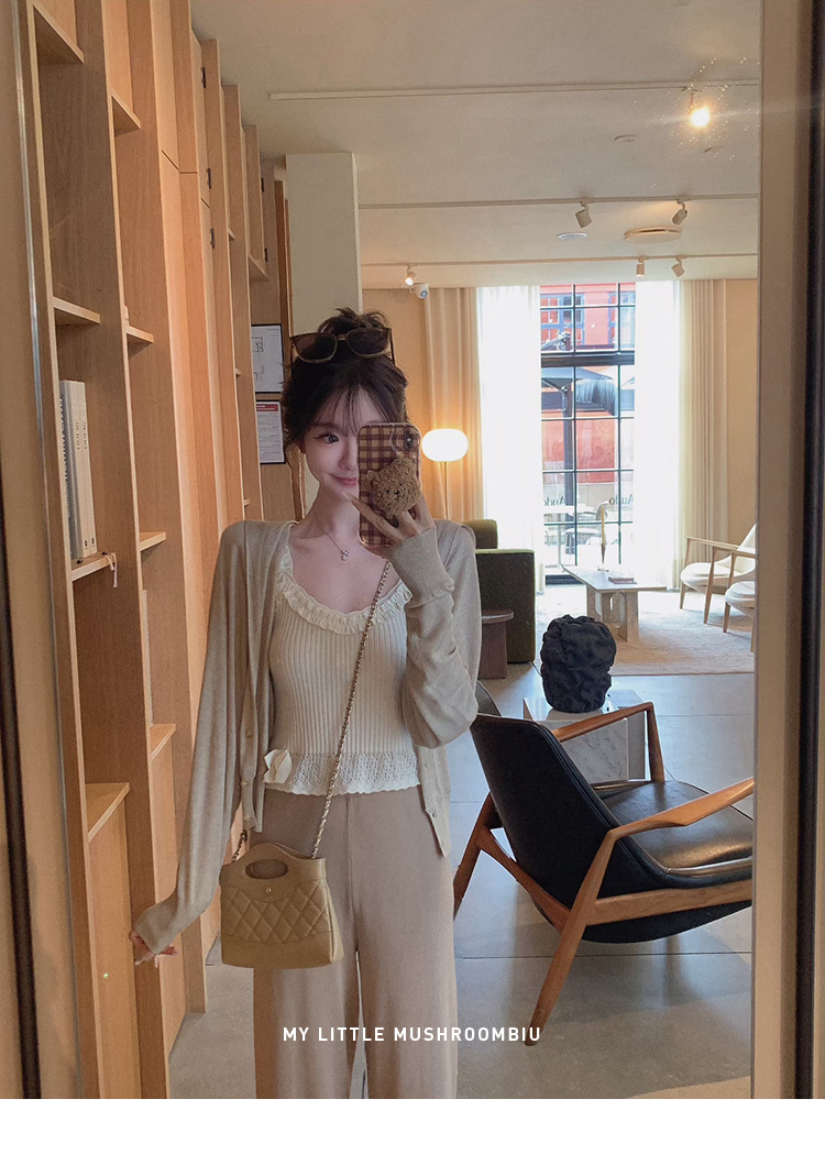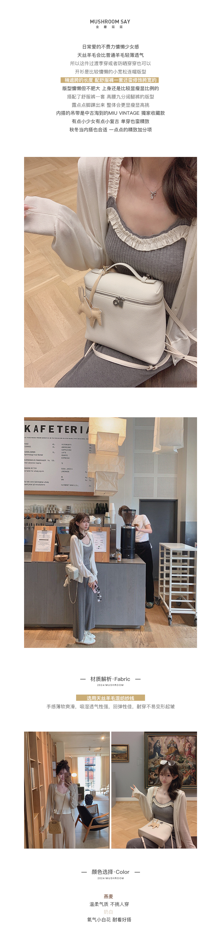 材质:吊带:55%锦纶20%聚酯纤维16%腈纶 9%羊毛开衫:85%莱赛尔15%羊毛针织衫:86.9%莱赛尔 13.1%绵羊毛