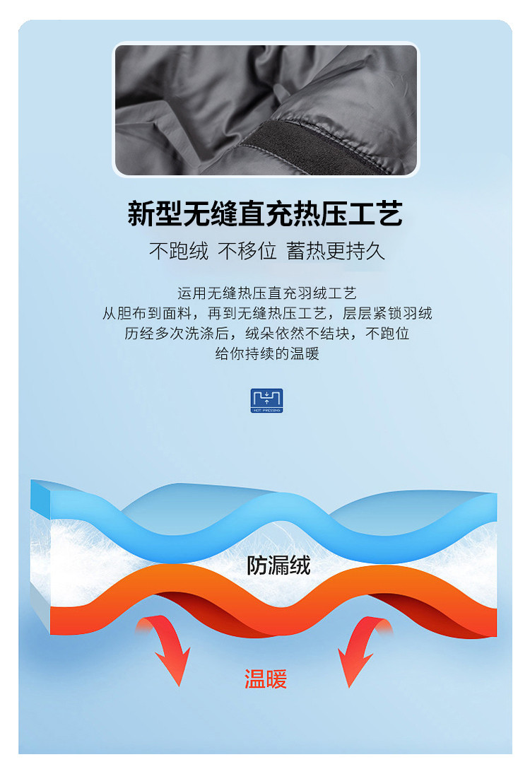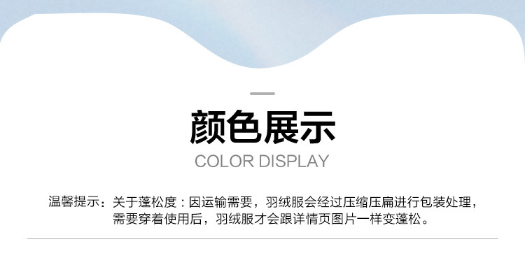 面料:95.7%聚酯纤维 4.3%氨纶 (含胶) 胆料:100%聚酯纤维 里料:100%聚酯纤维 毛领:100%聚酯纤维 填充物:白鸭绒(绒子含量85%)