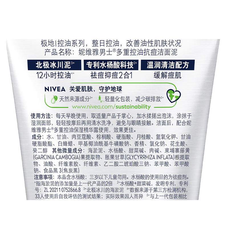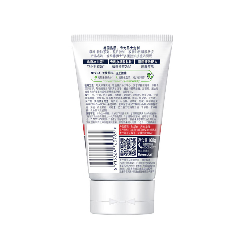 妮维雅男士多重控油抗痘洁面泥100g/瓶