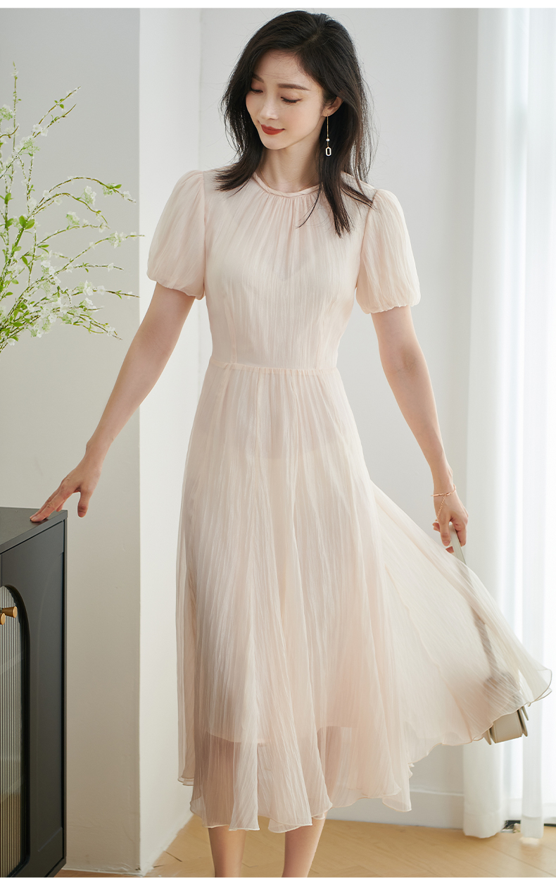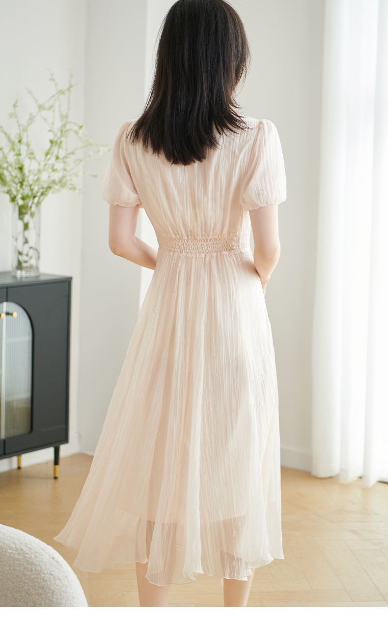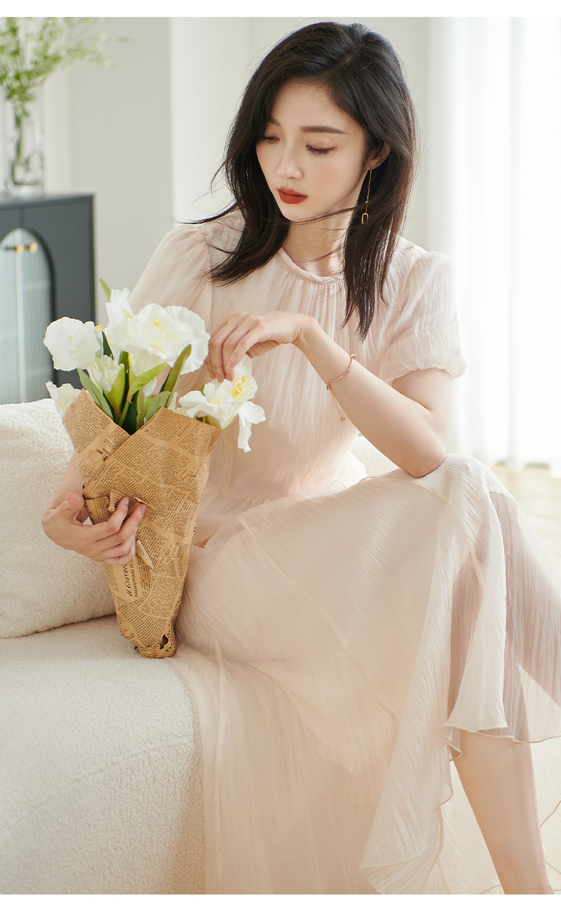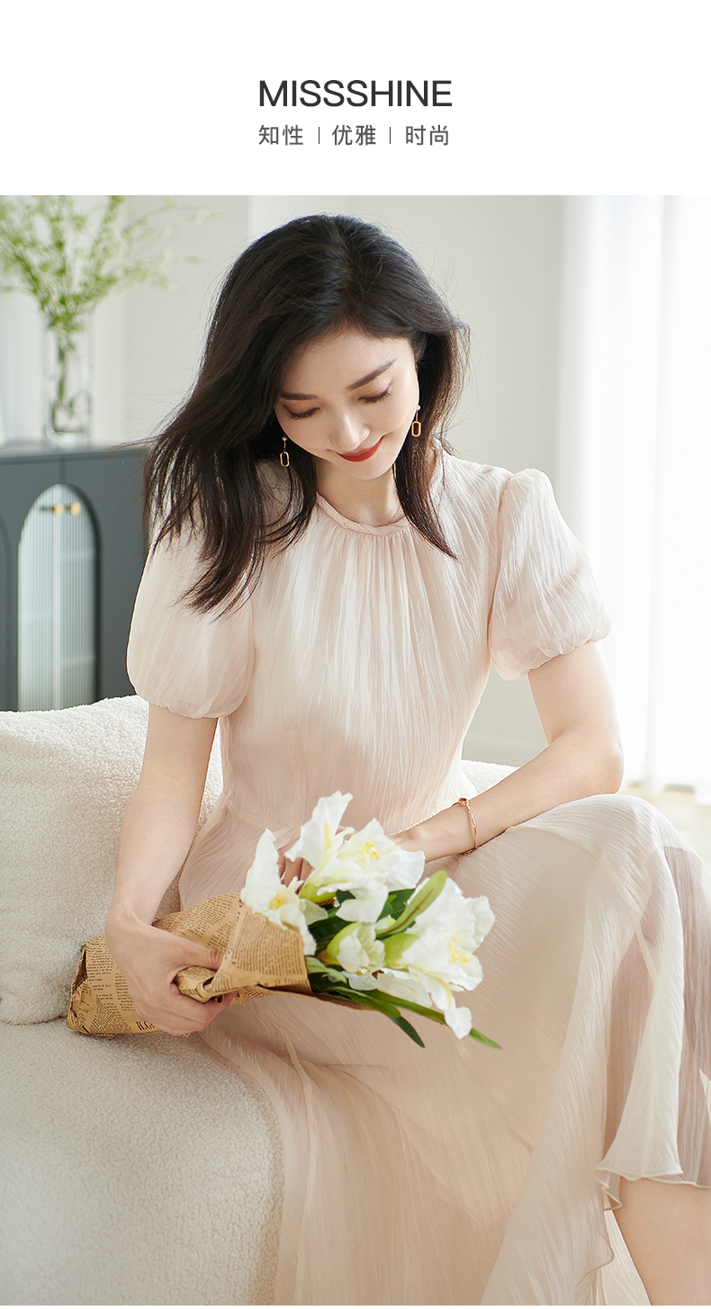 米思阳2025夏季新款优雅气质短袖连衣裙时尚褶皱泡泡袖仙女裙1643