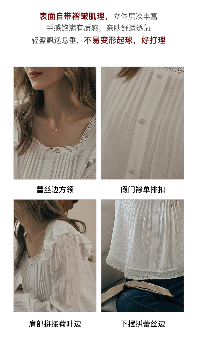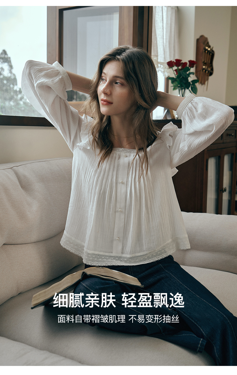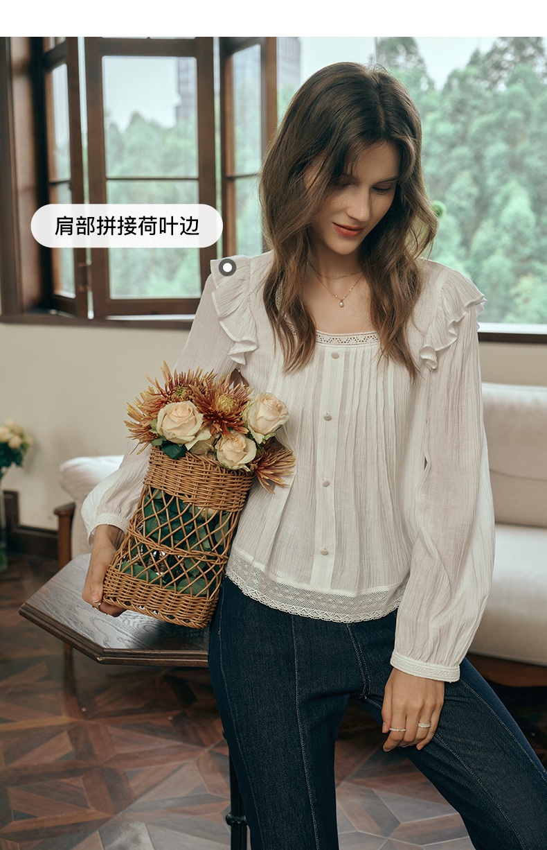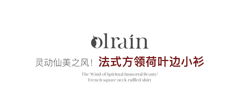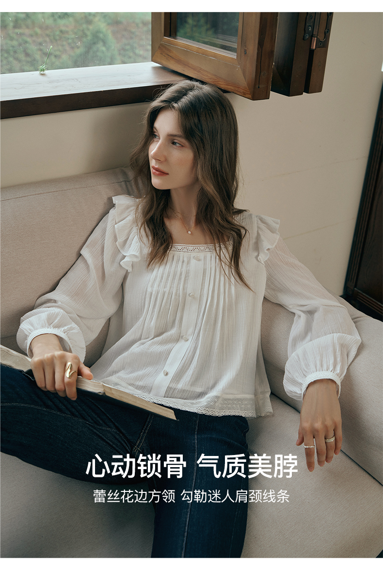 OLrain欧芮儿方领蕾丝雪纺衫女初秋2023年新款宽松褶皱荷叶边小衫