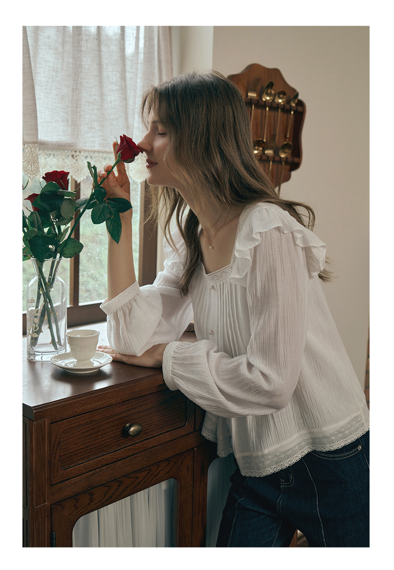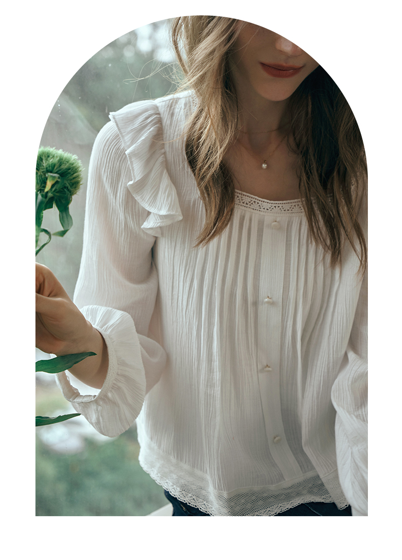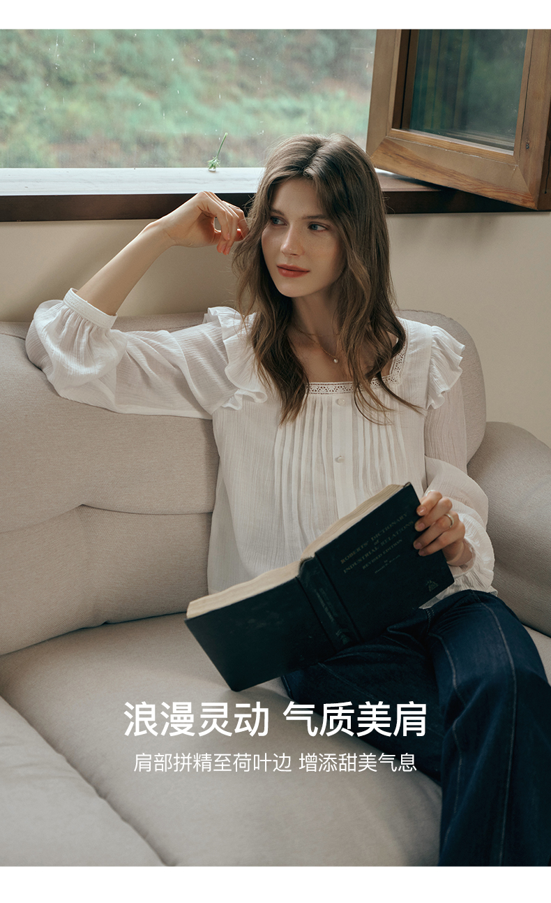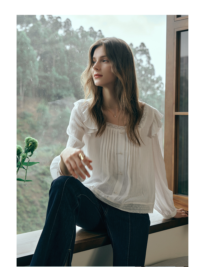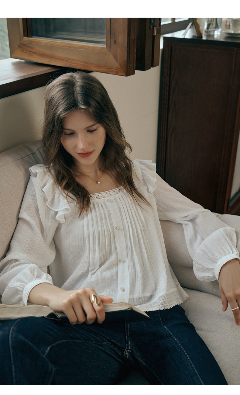 OLrain欧芮儿方领蕾丝雪纺衫女初秋2023年新款宽松褶皱荷叶边小衫