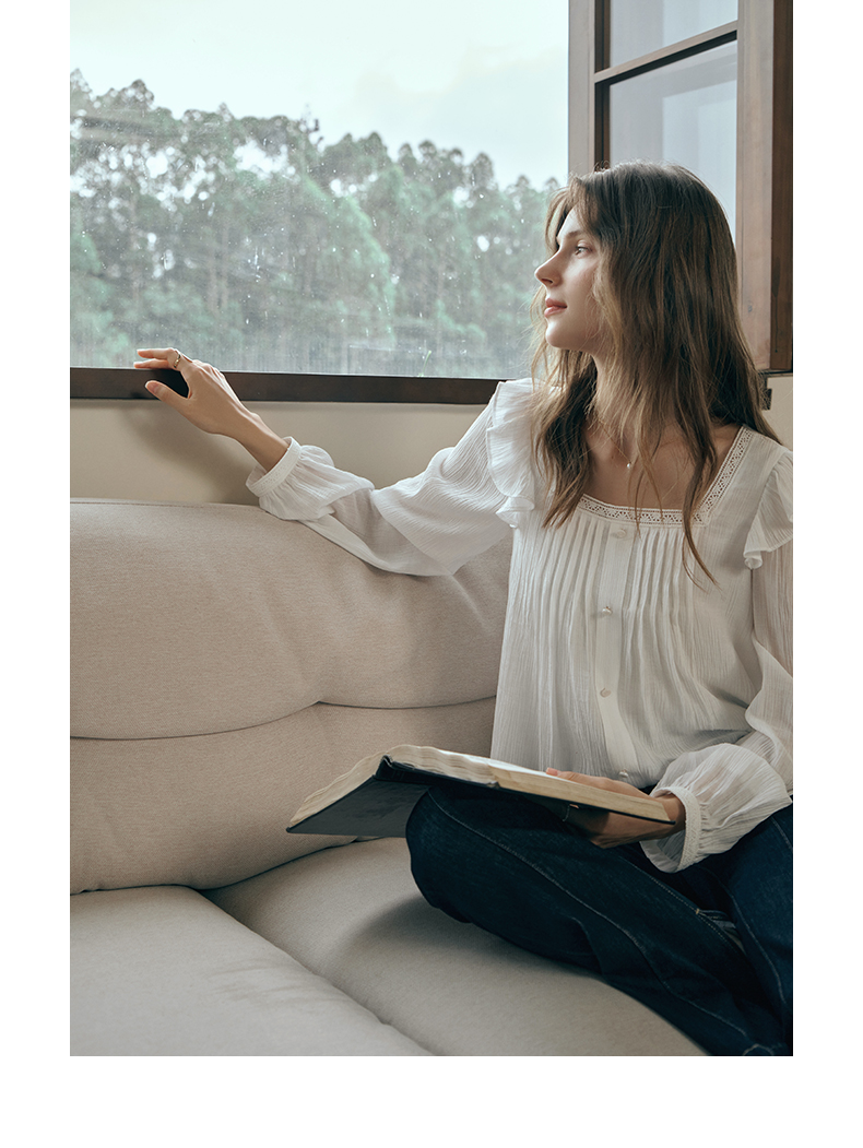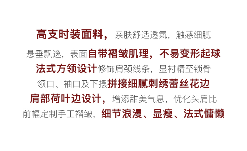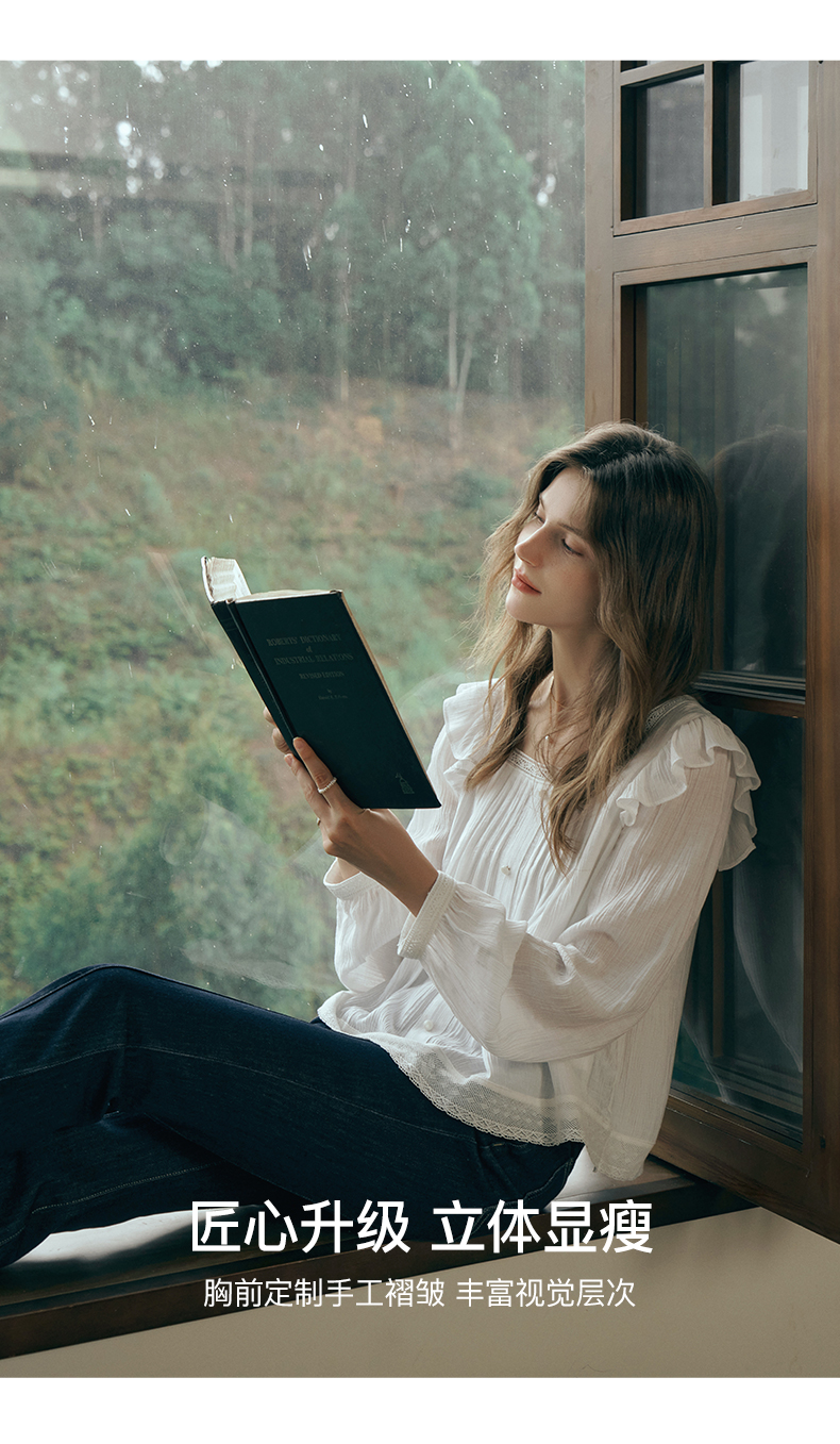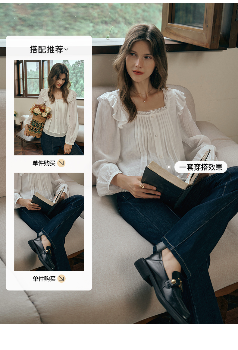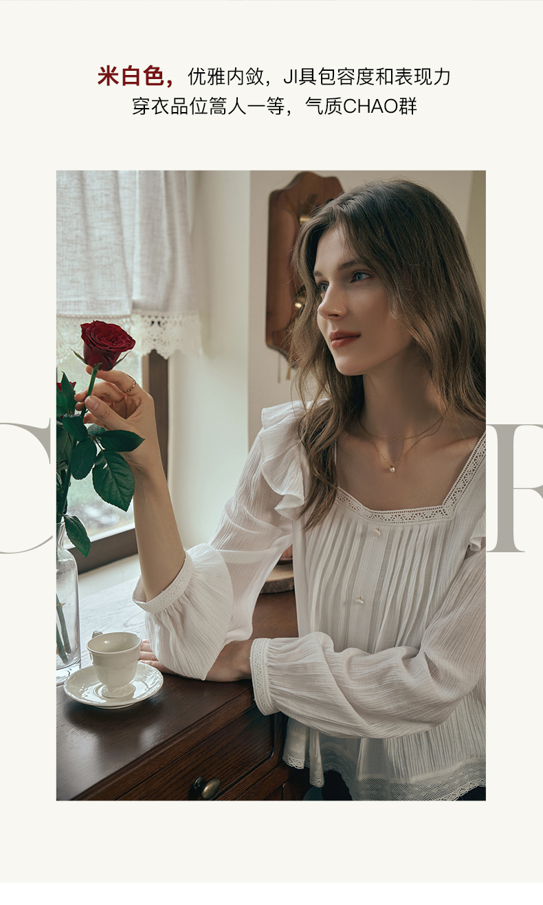 OLrain欧芮儿方领蕾丝雪纺衫女初秋2023年新款宽松褶皱荷叶边小衫