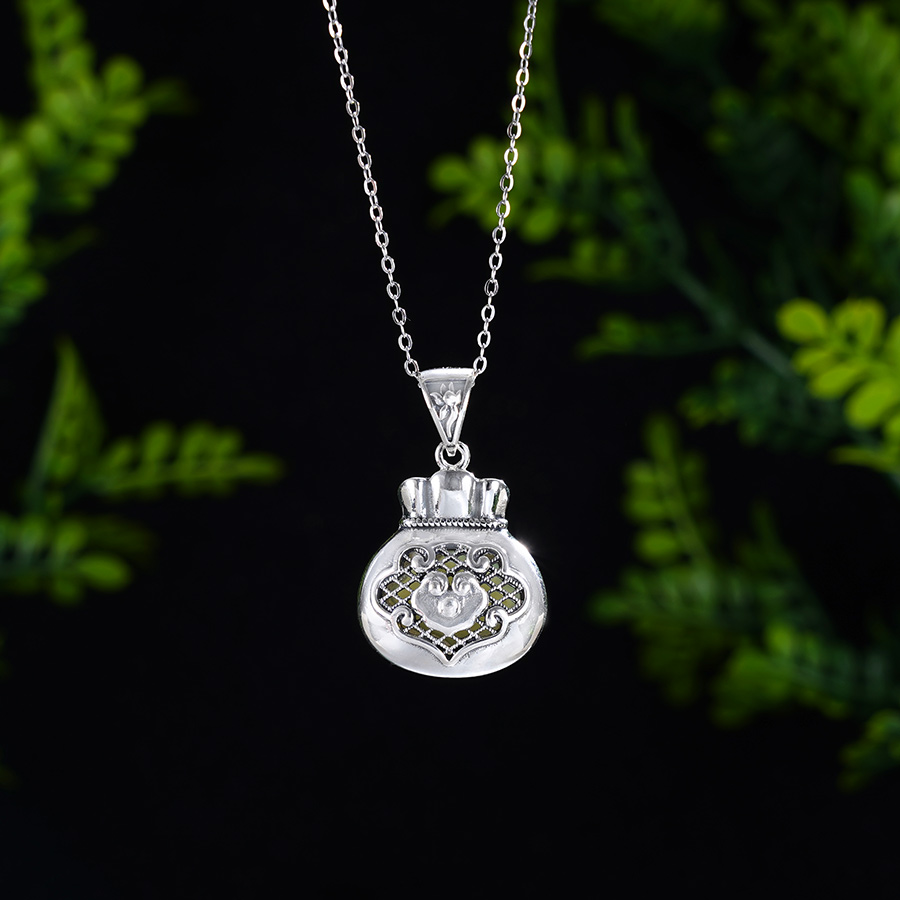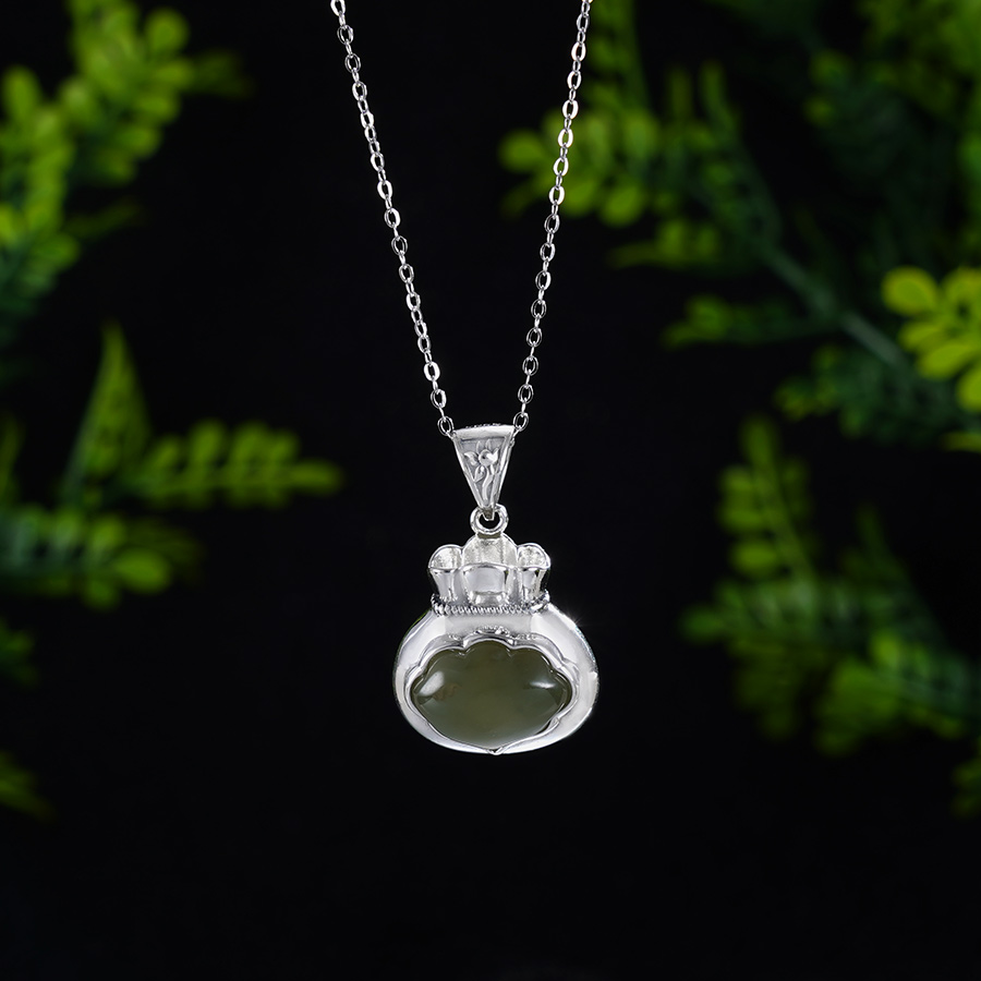【寓意】:福袋纳百财,财源滚滚来。整个吊坠以“福袋”为核心设计。纯银光芒与和田碧玉巧妙交融,倾洒出无尽的福泽。