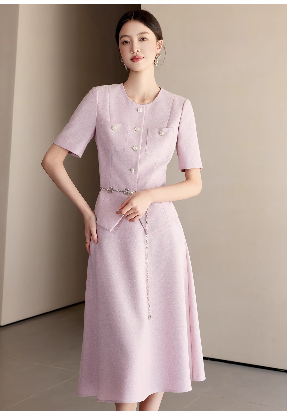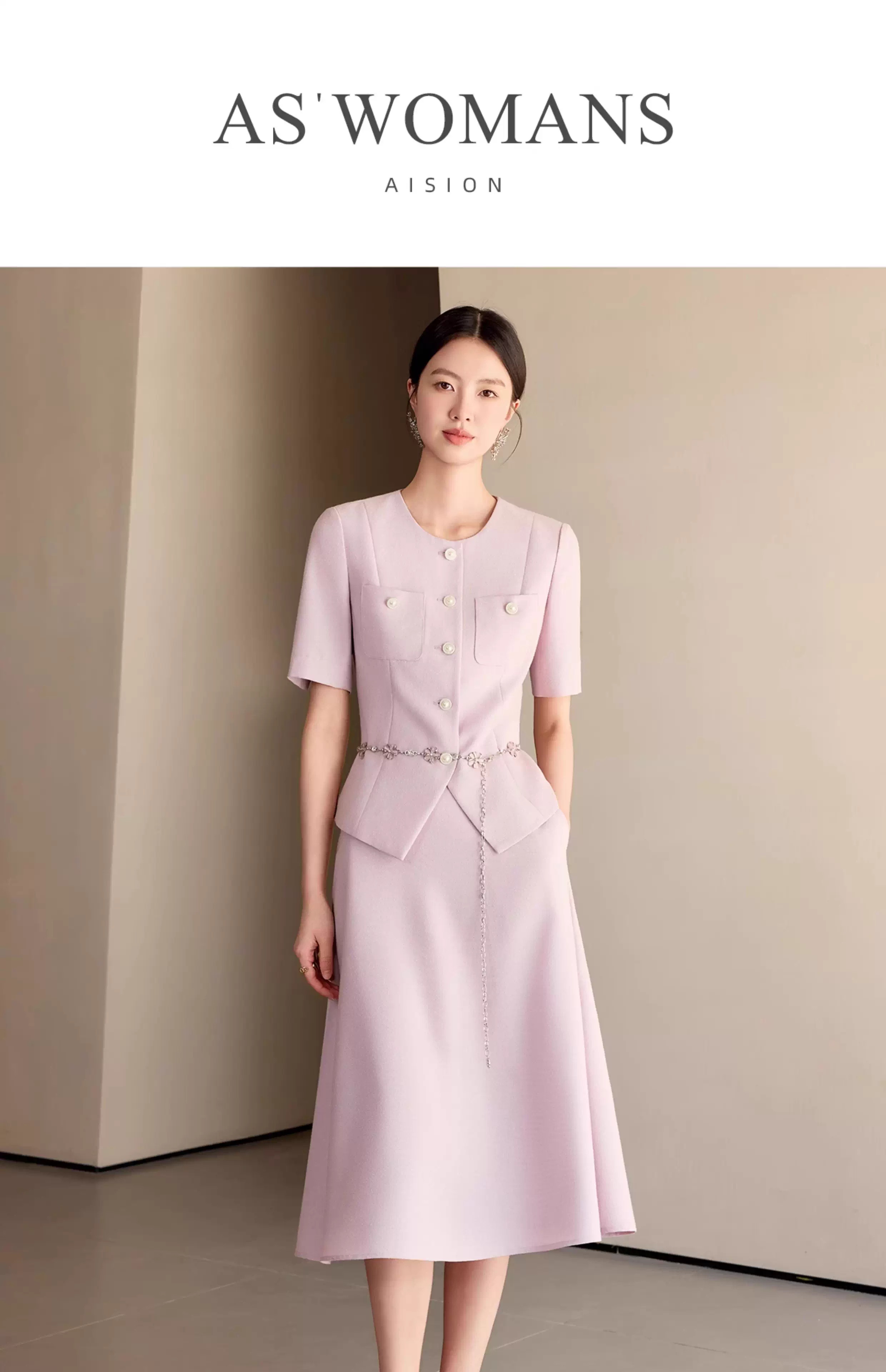 IWY/粉色气质优雅圆领小香风西装短外套伞裙时尚套装夏季WC163+WS165
