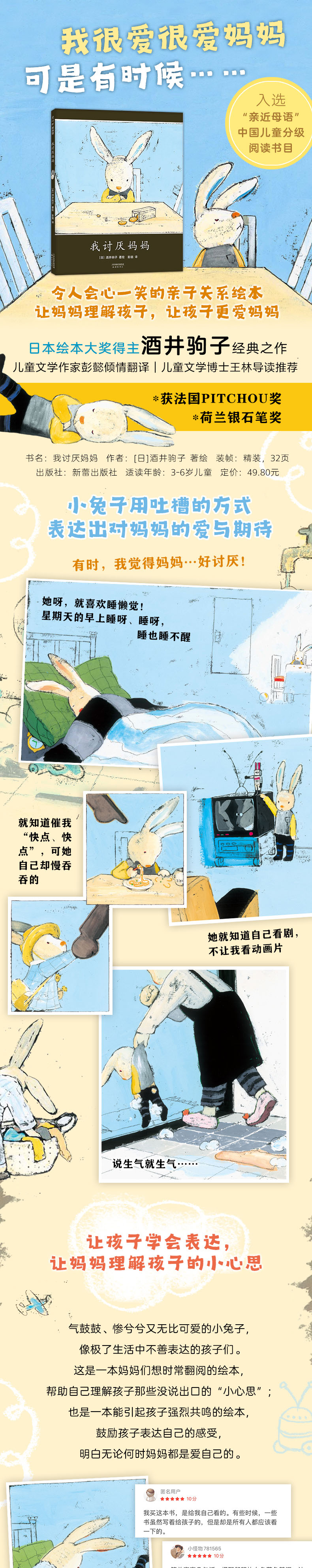 作者氵酉井驹子擅长油画,她通过淡雅的色彩搭配、丰富的纹理变化、细致的表情刻画,将孩子们细腻敏感的心理活动展现的淋漓尽致。书中这个气鼓鼓、惨兮兮又无比可爱的小兔子,像极了生活中不善表达的孩子们。这是一本妈妈们想时常翻阅的绘本,帮助自己理解孩子那些没说出口的“小心思”;也是一本能引起孩子强烈共鸣的绘本,让孩子们学会表达自己的情绪,明白无论何时妈妈都是爱自己的。