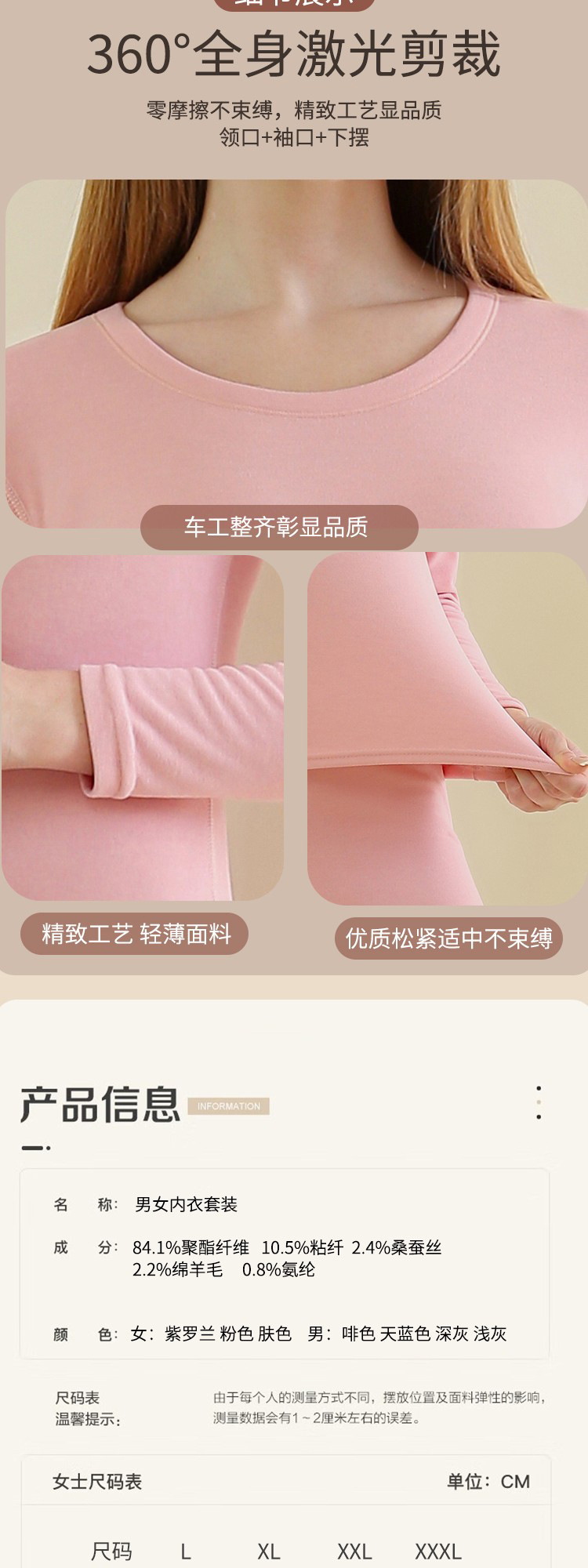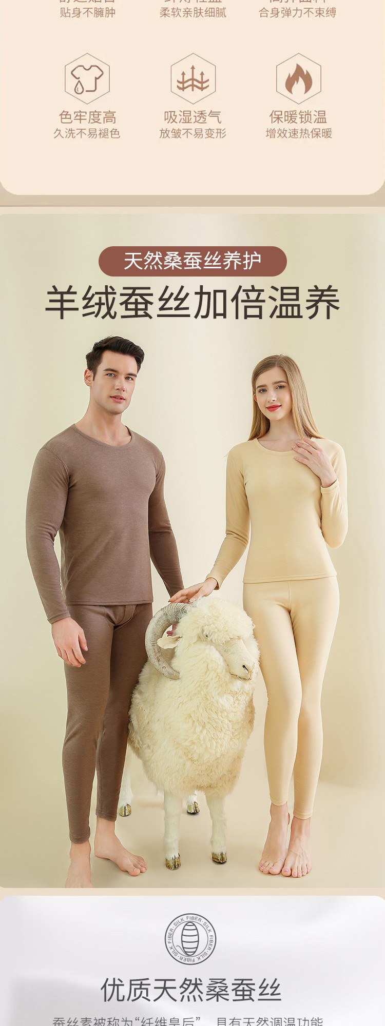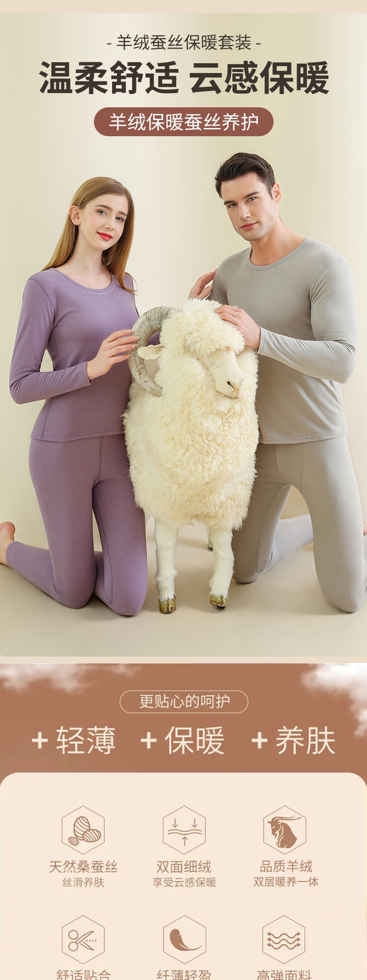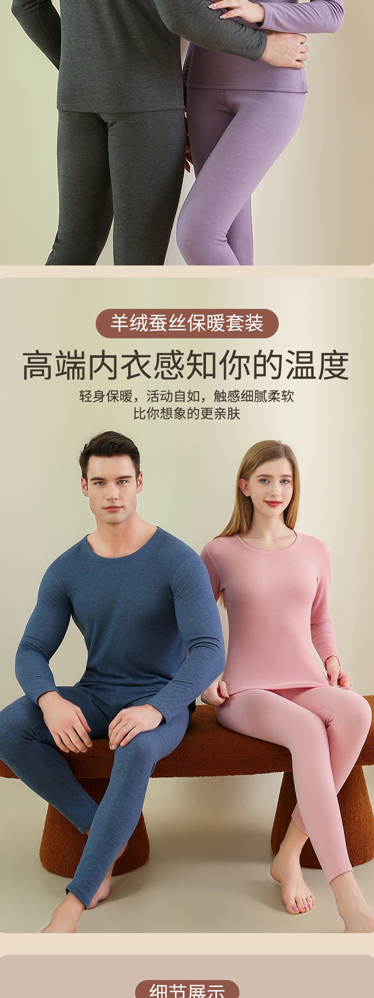 蚕丝羊毛男士女士保暖内衣新款圆领润肤柔软打底内穿秋衣秋裤套装