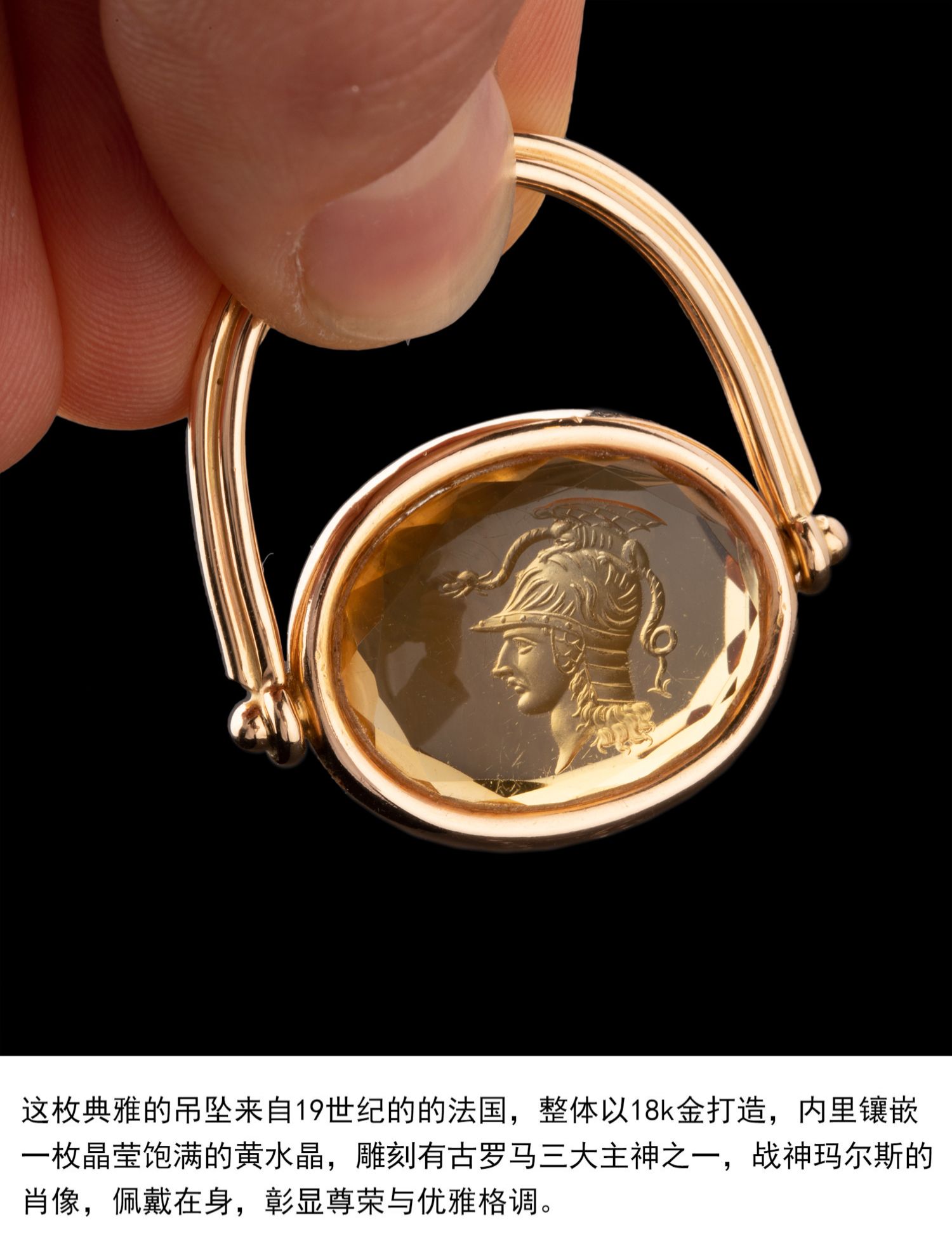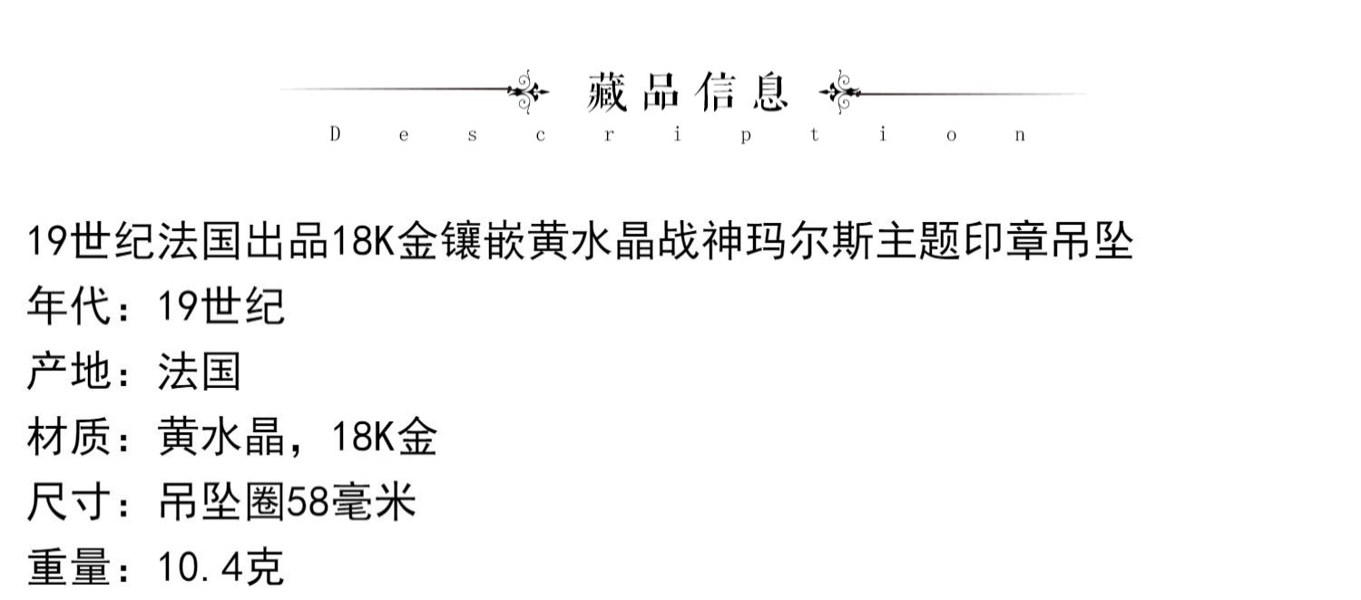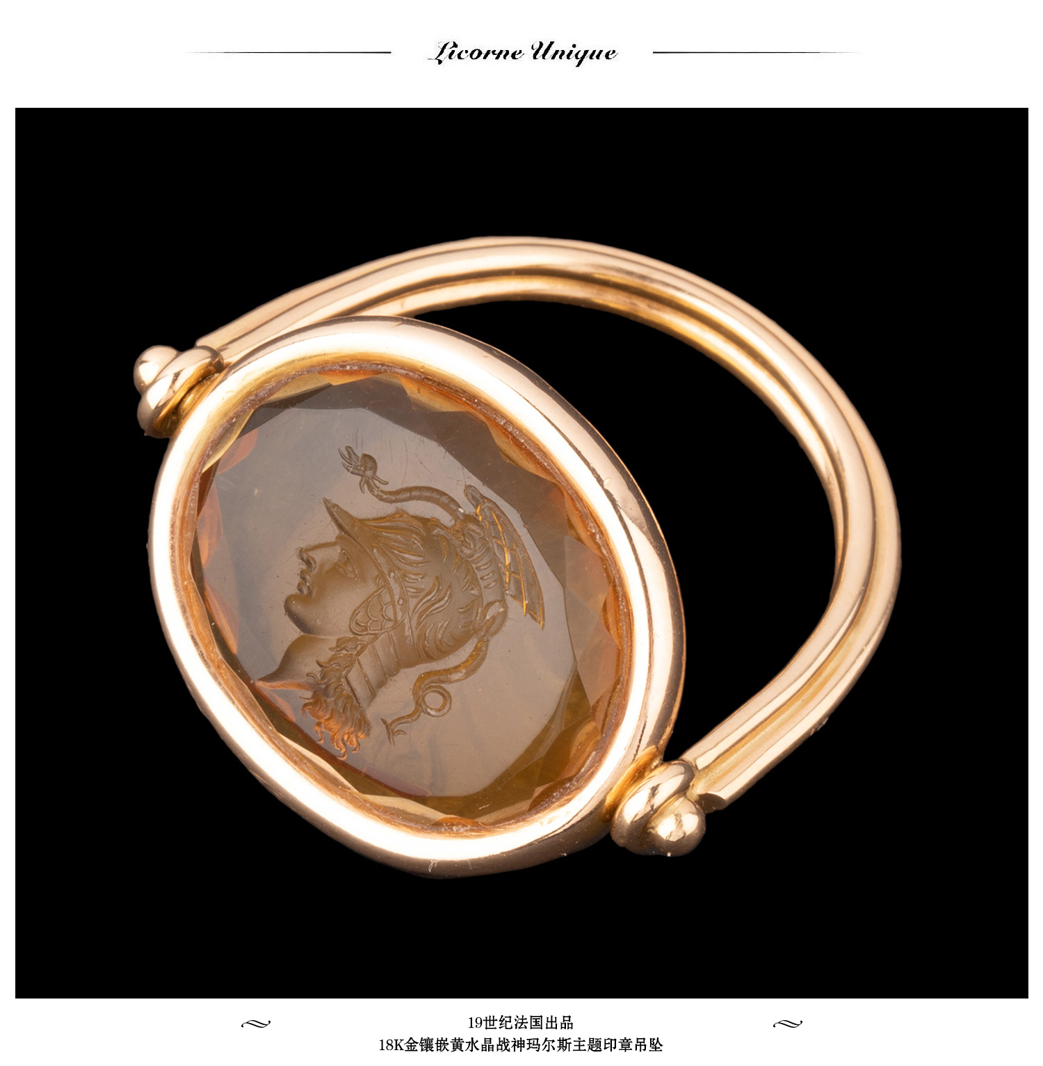 独角鹿西洋古董珠宝首饰18K金镶嵌黄水晶战神玛尔斯印章吊坠戒指