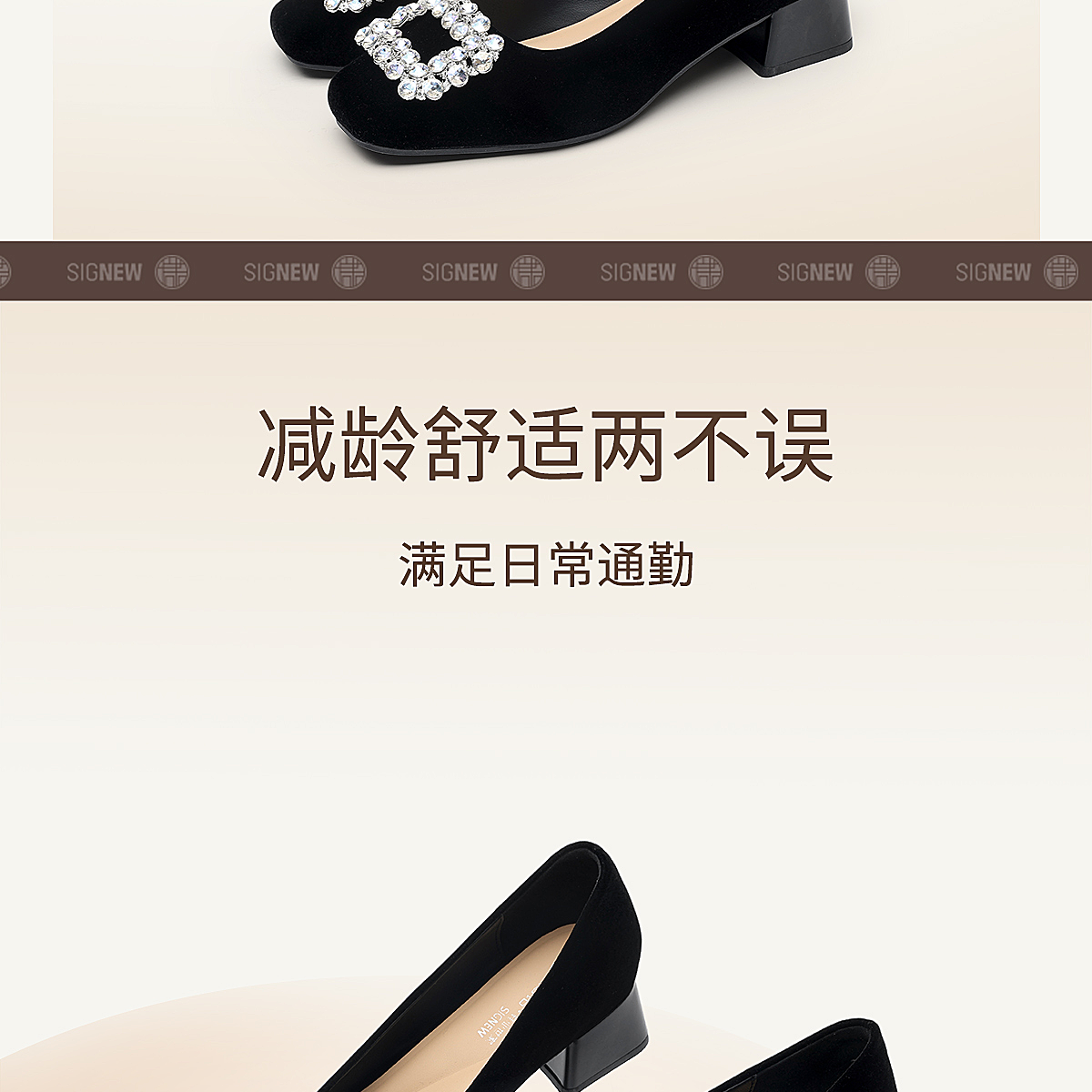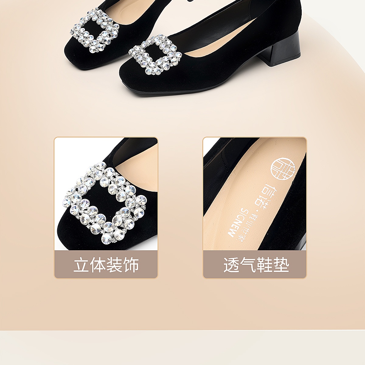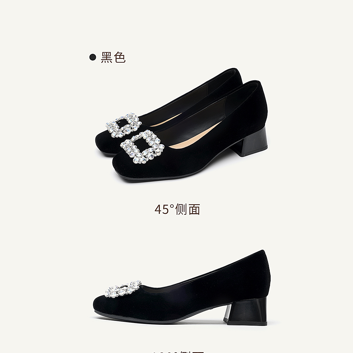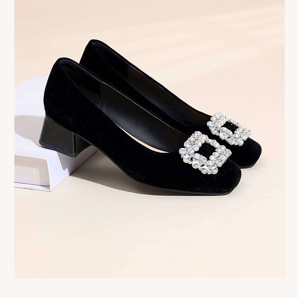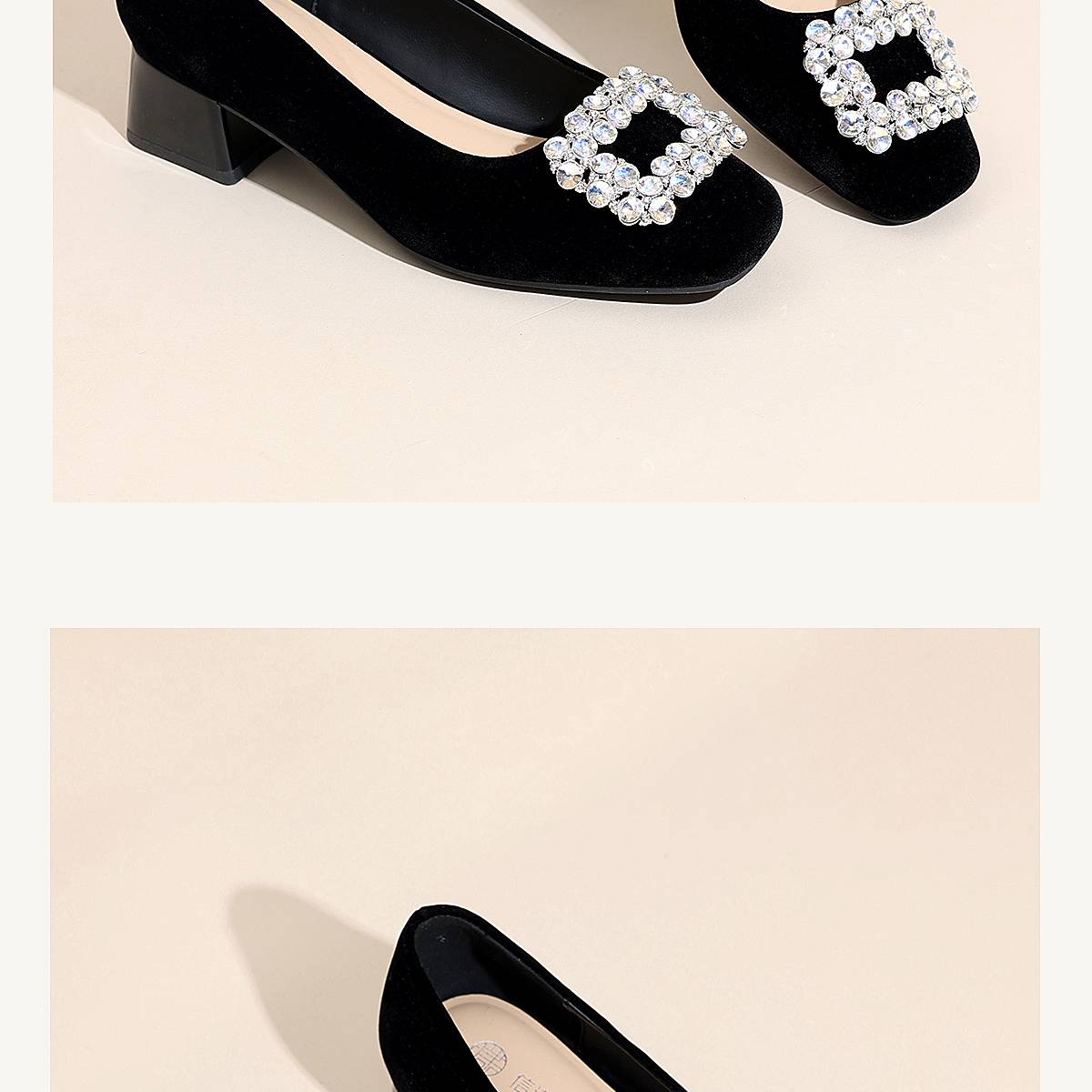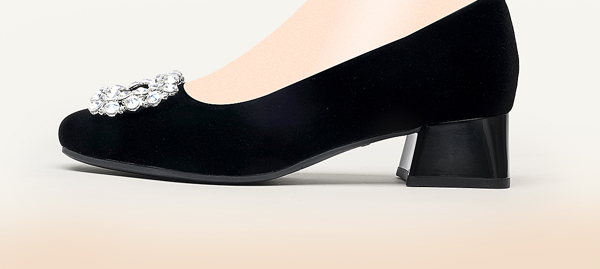 通勤风水钻方扣粗跟单鞋女黑色绒面浅口高跟鞋不累脚X6C159-08