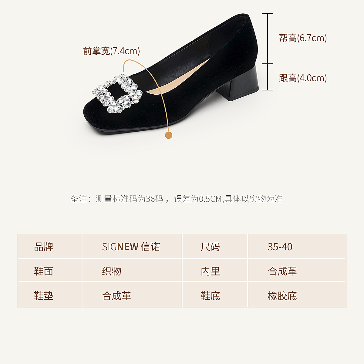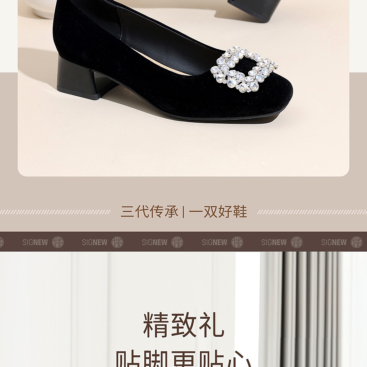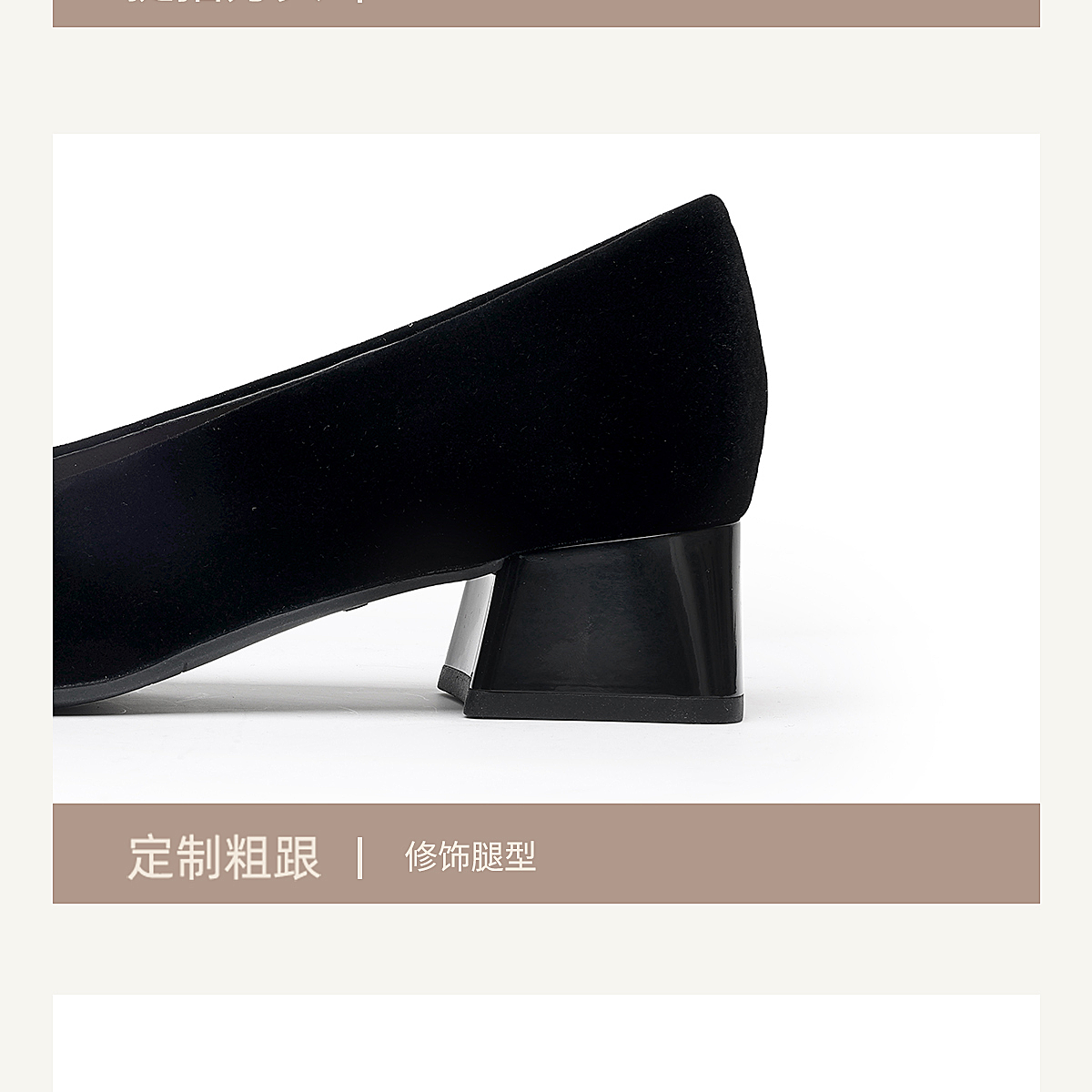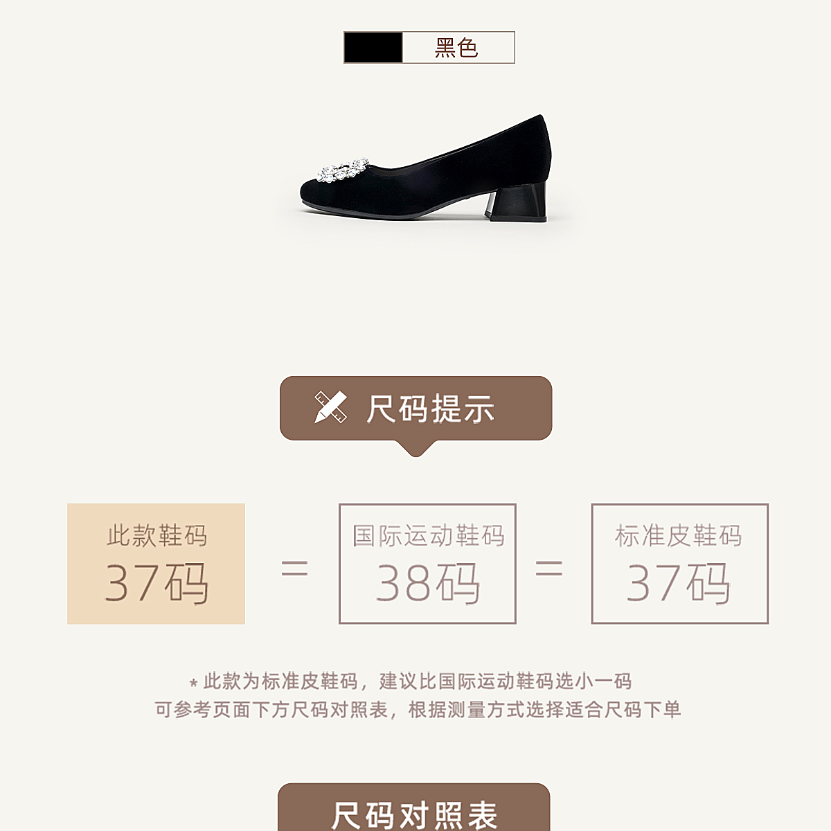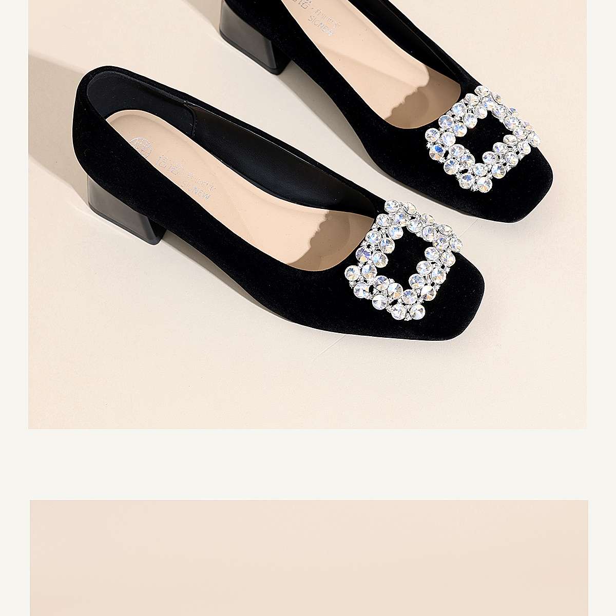 通勤风水钻方扣粗跟单鞋女黑色绒面浅口高跟鞋不累脚X6C159-08