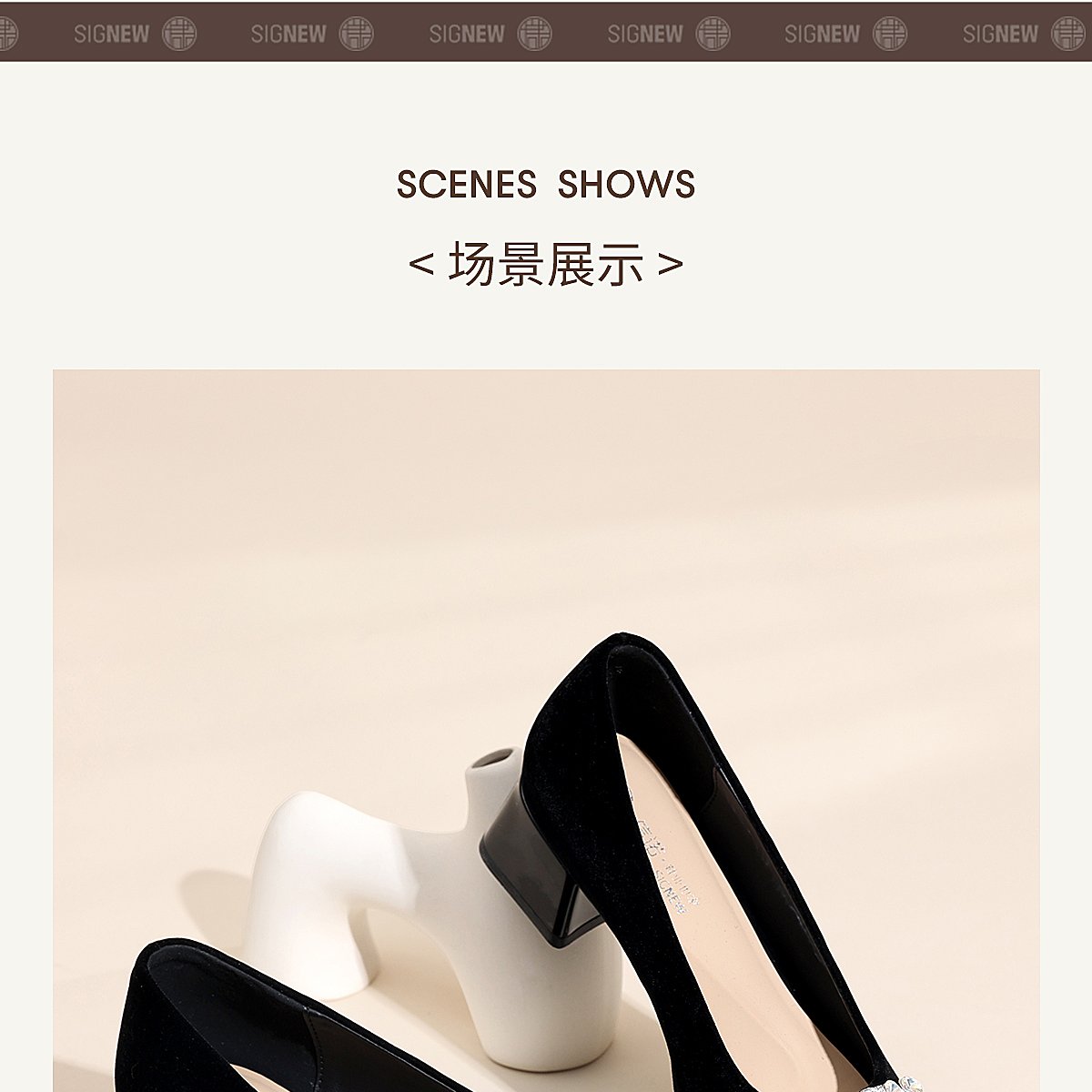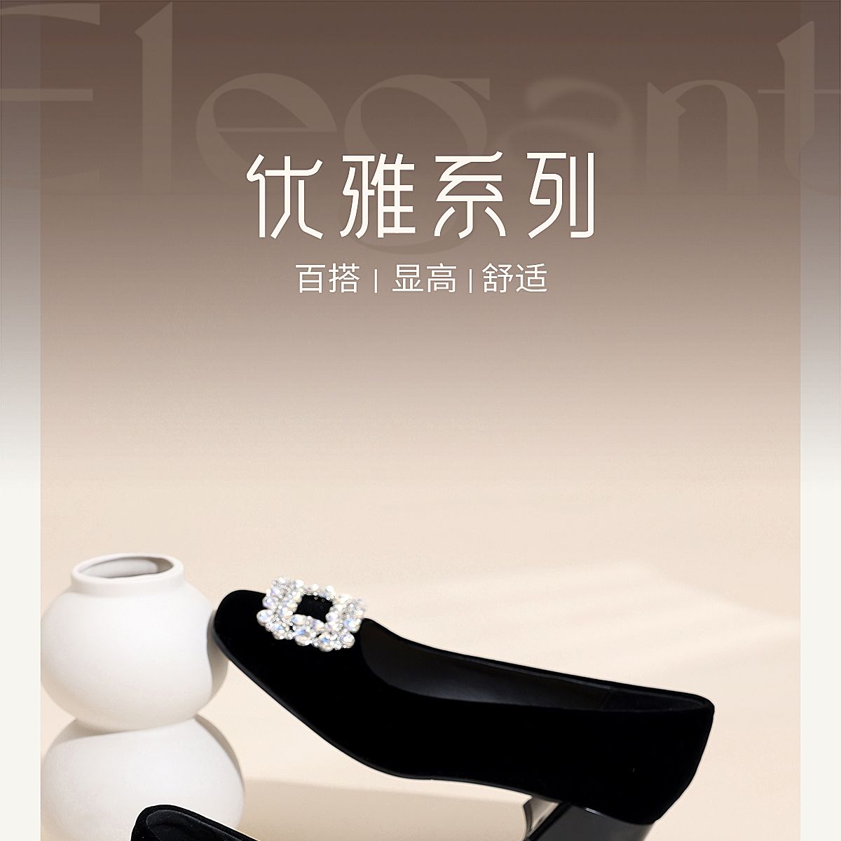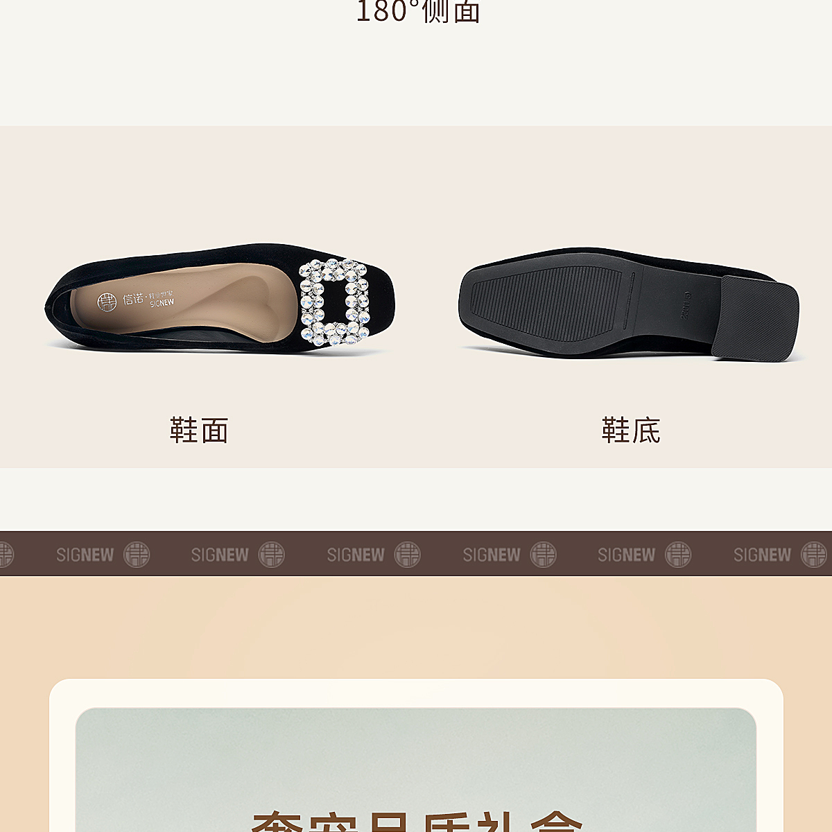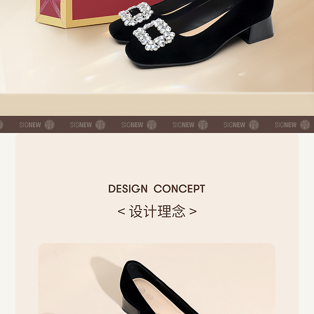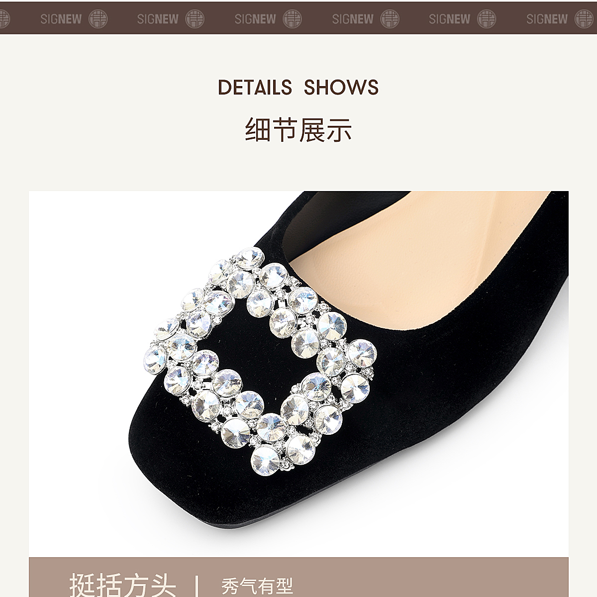 通勤风水钻方扣粗跟单鞋女黑色绒面浅口高跟鞋不累脚X6C159-08