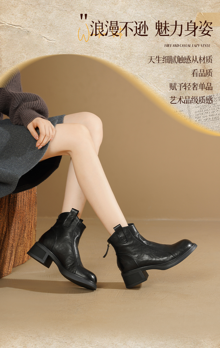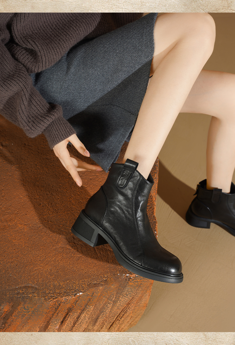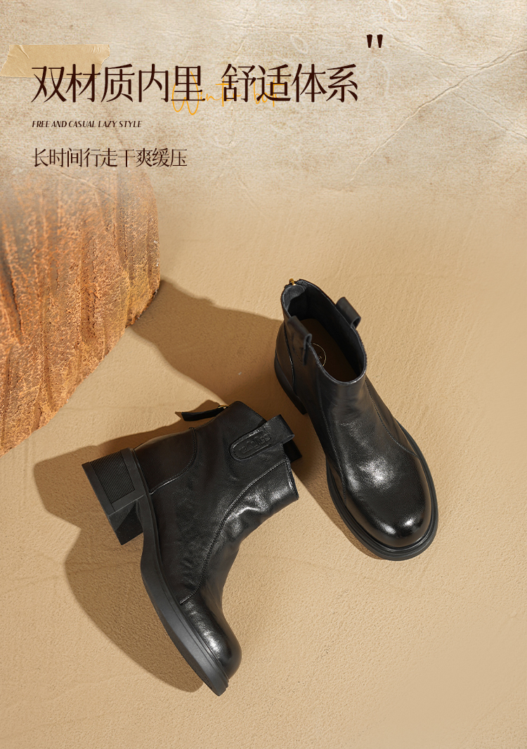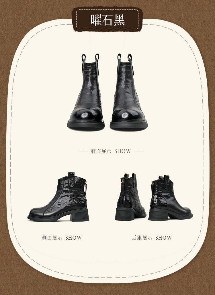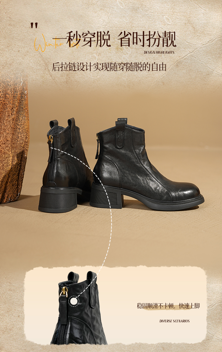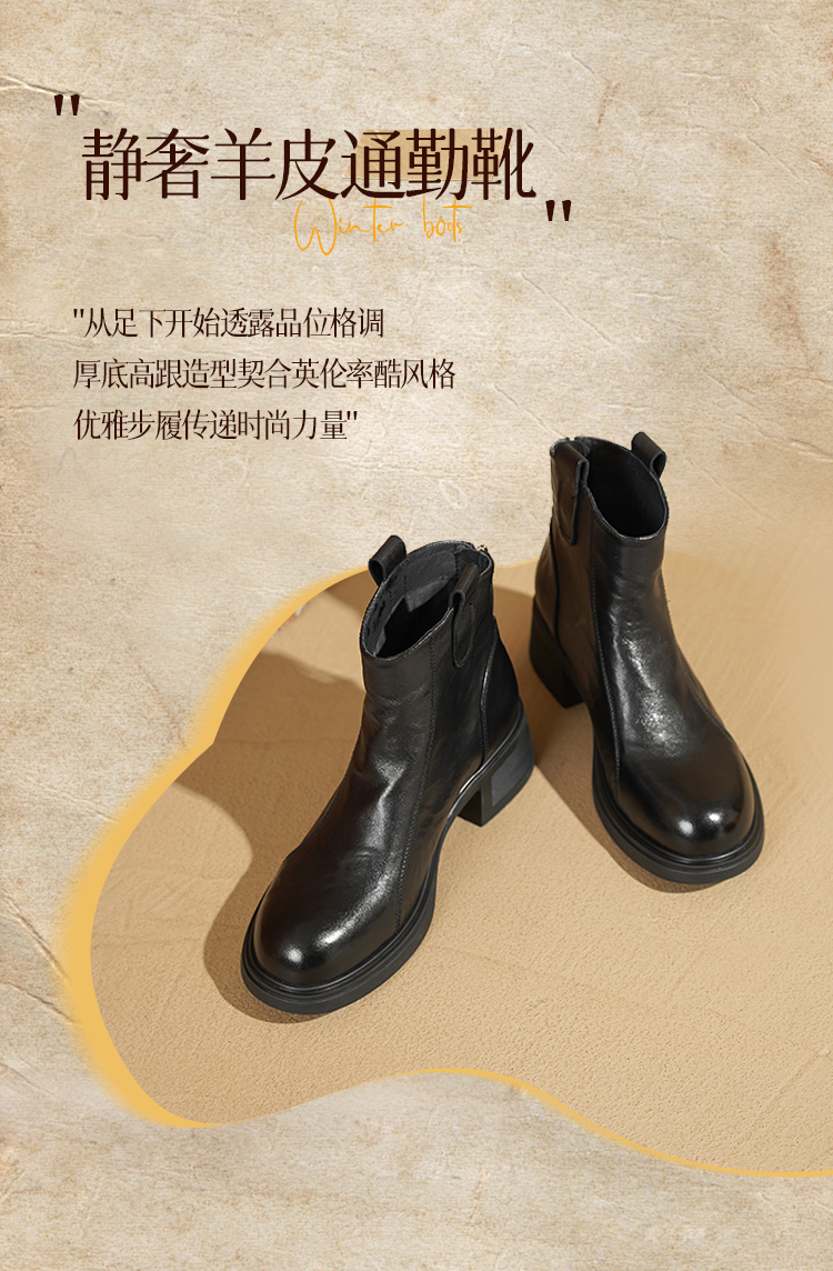 Safiya/索菲娅2025羊皮抓皱粗跟百搭厚底休闲通勤时尚英伦短靴SFD4116255