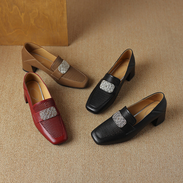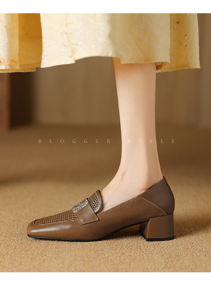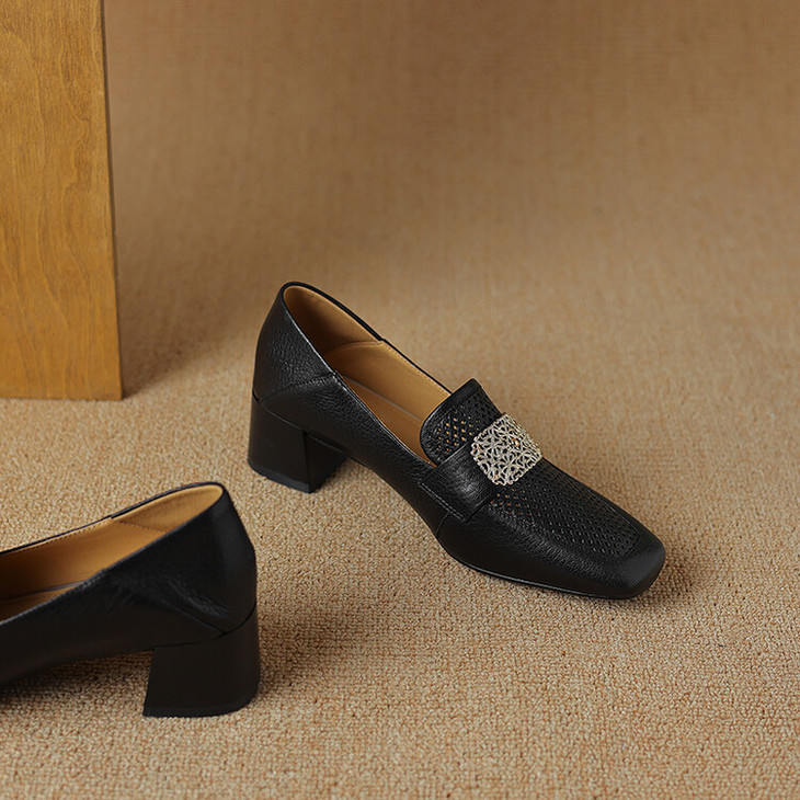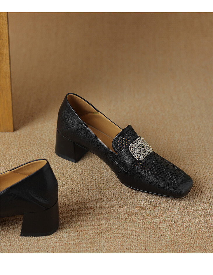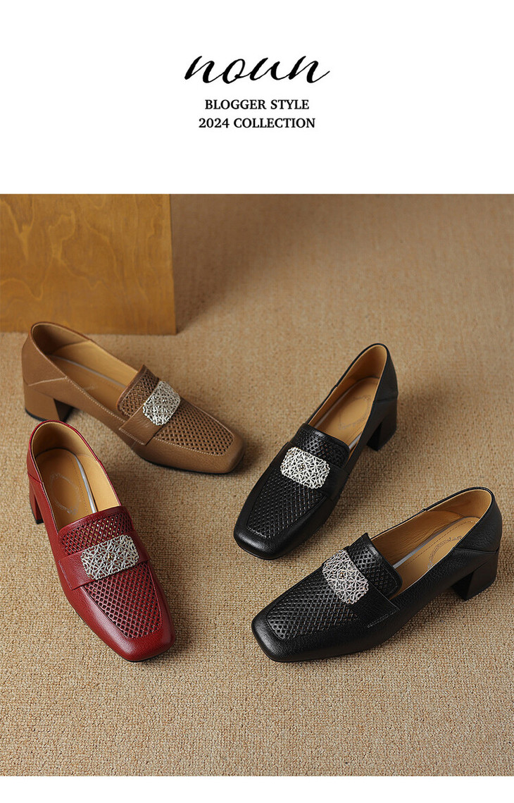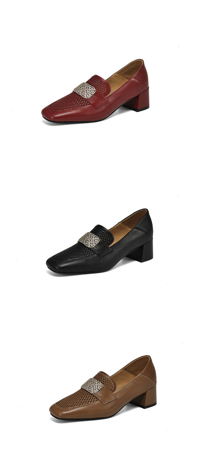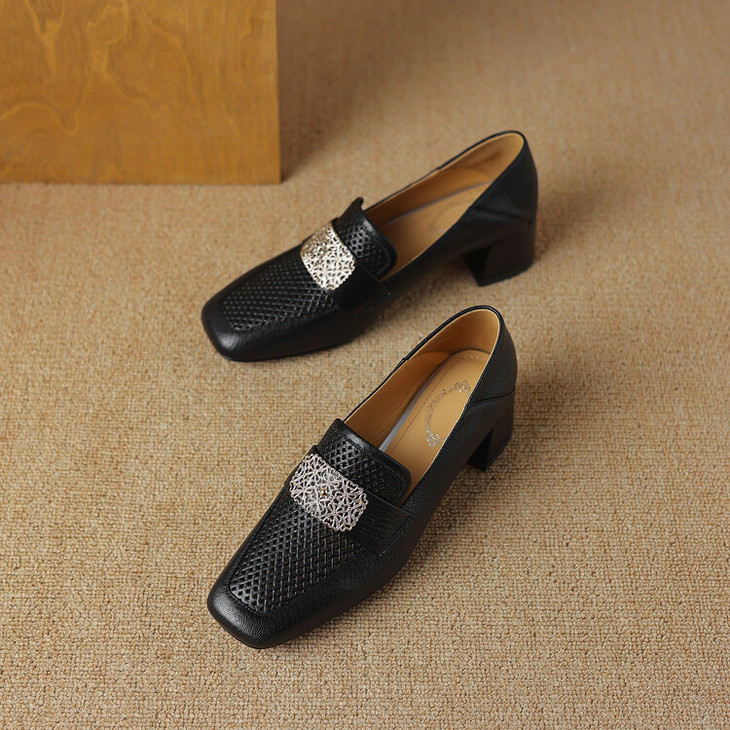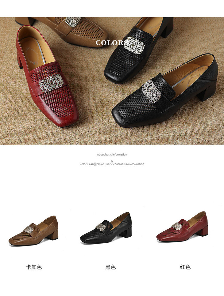 【预售5天】复古真皮方扣粗跟中口单鞋女春秋新款方头高跟镂空洞洞款乐福鞋DPJ&2911
