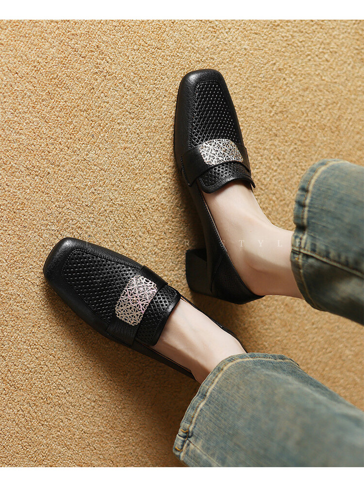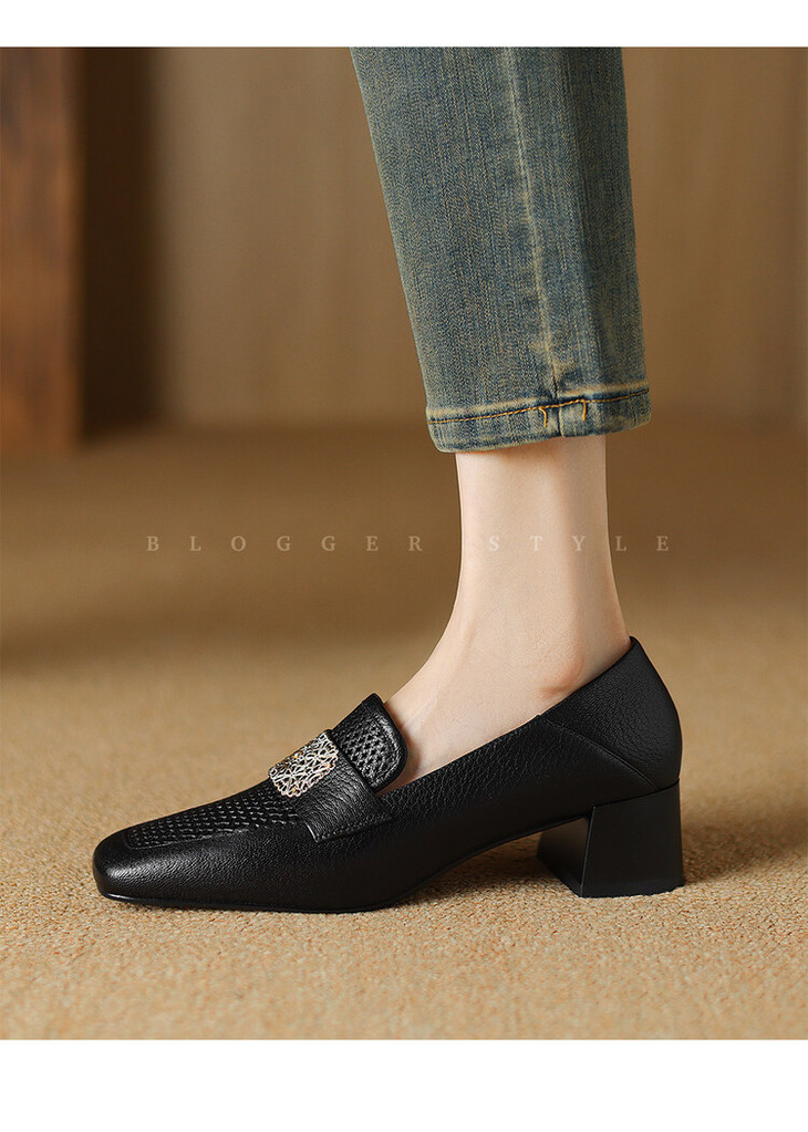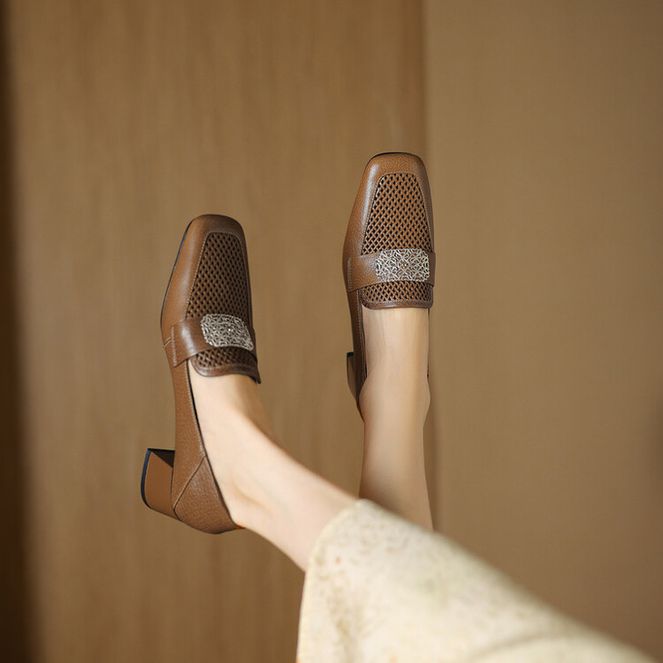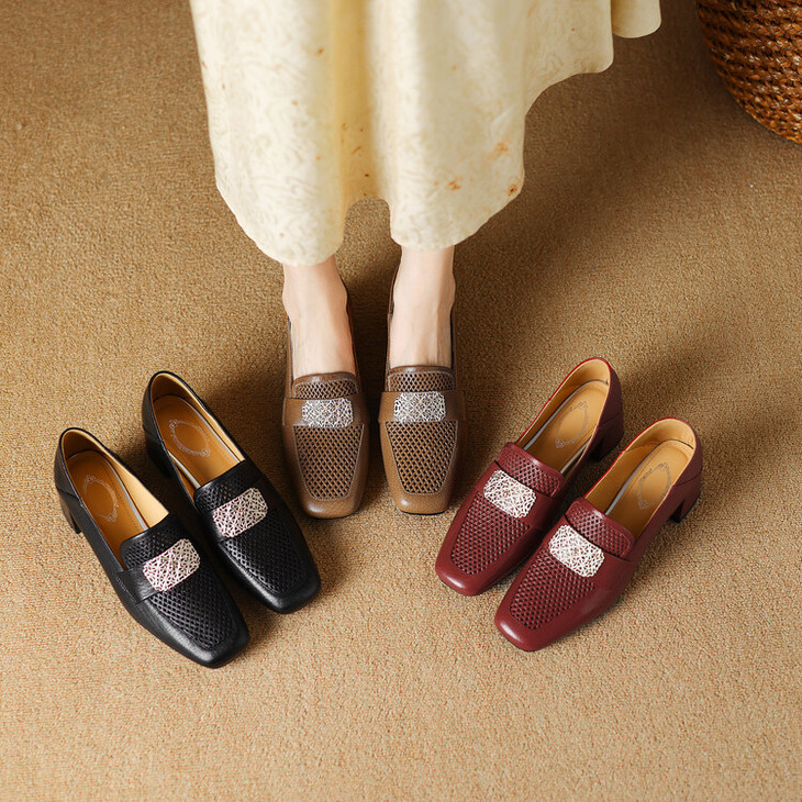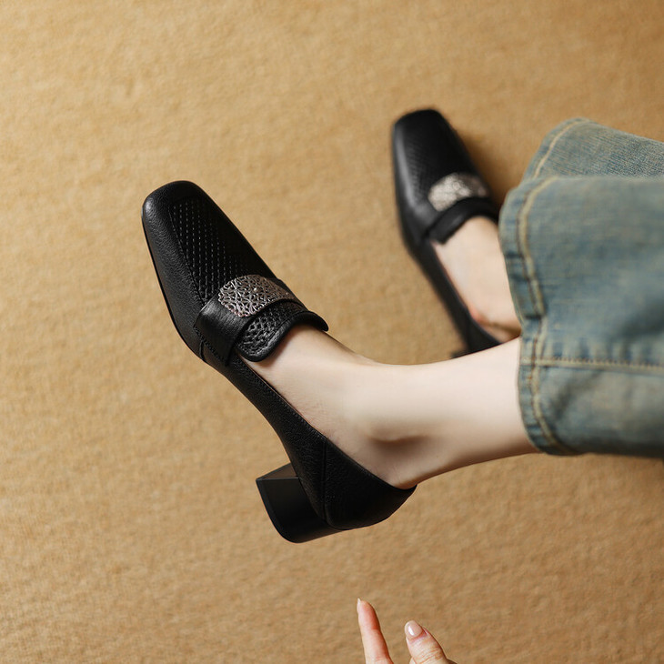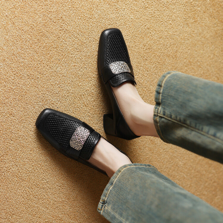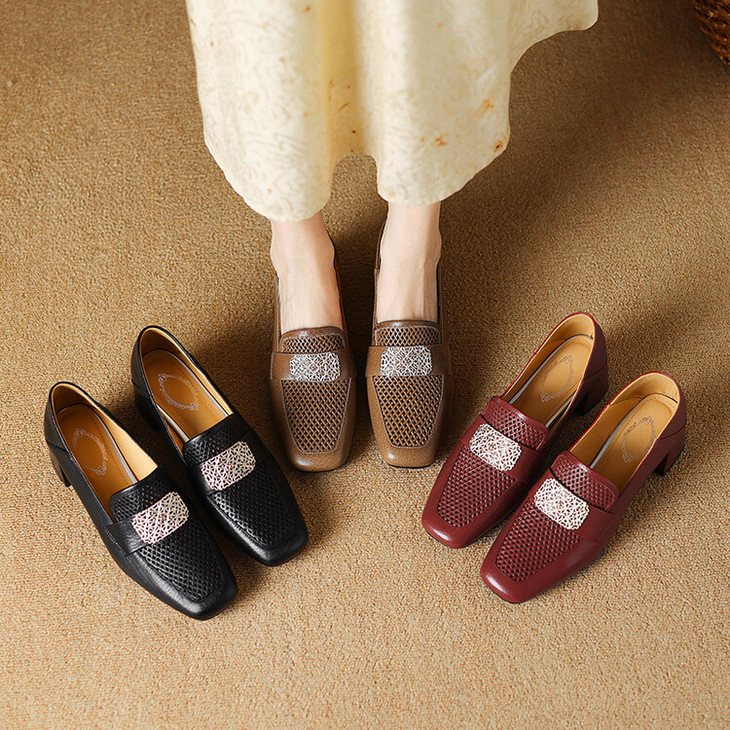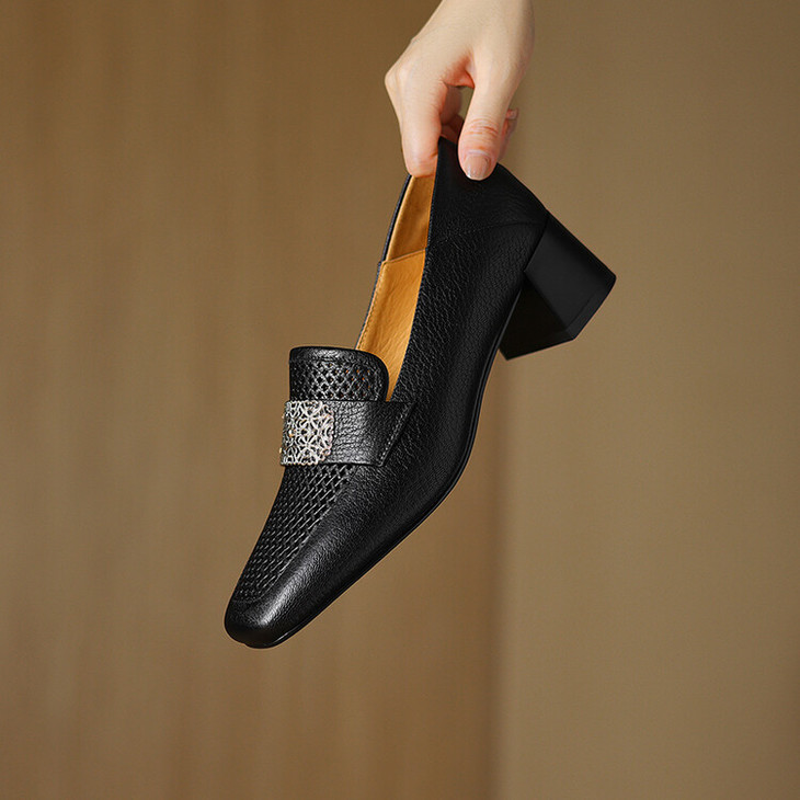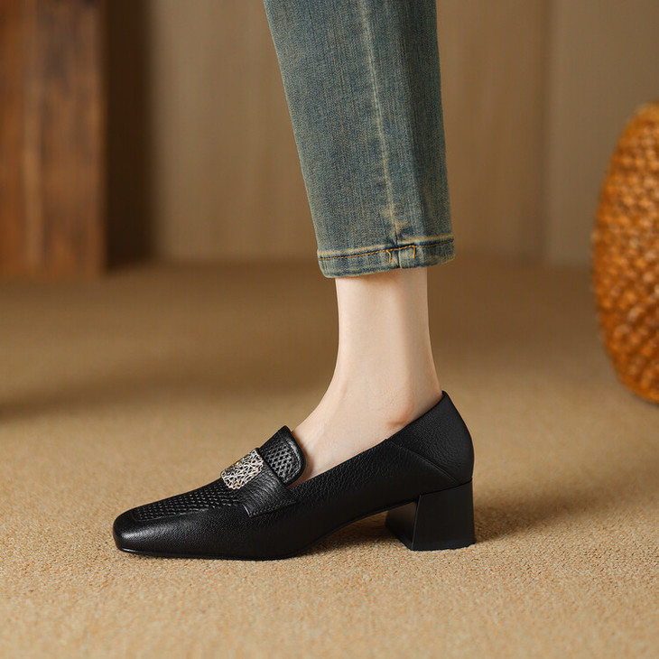 【预售5天】复古真皮方扣粗跟中口单鞋女春秋新款方头高跟镂空洞洞款乐福鞋DPJ&2911
