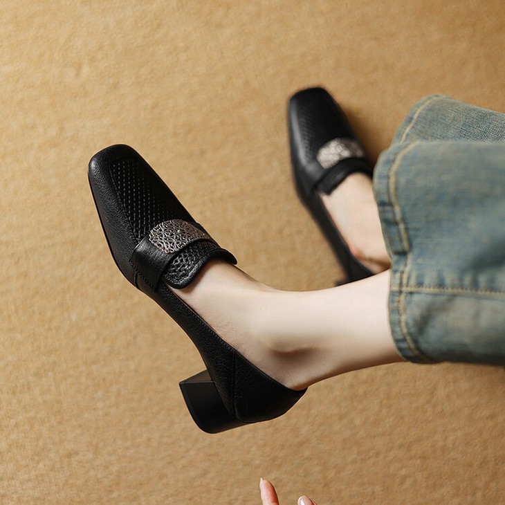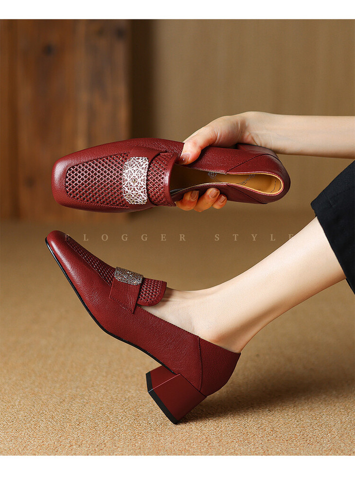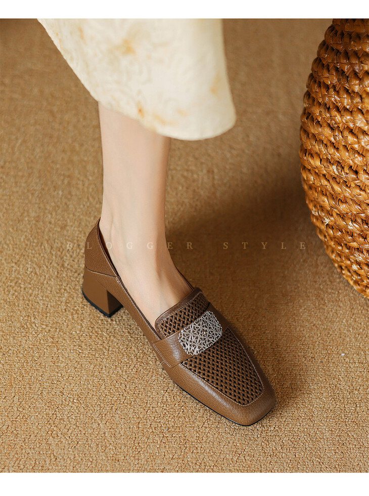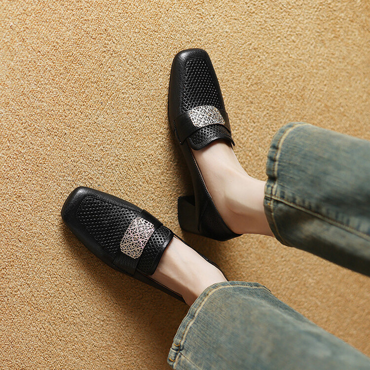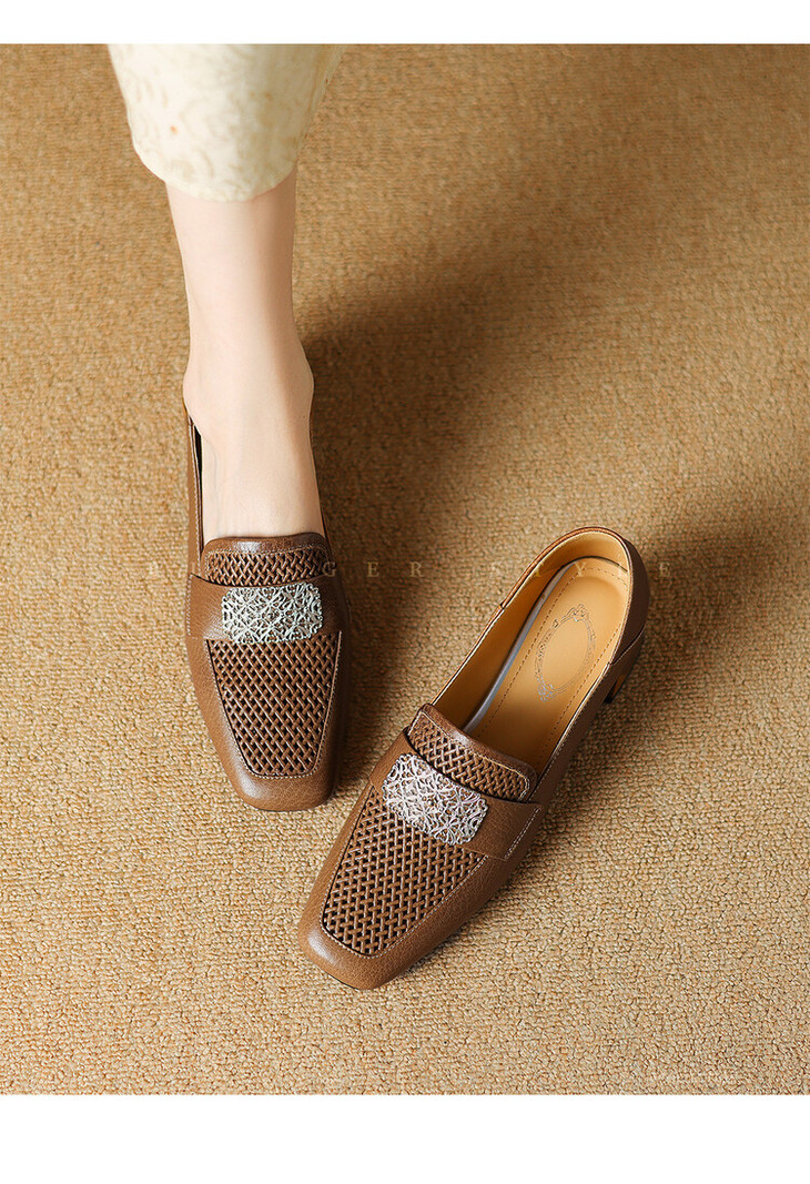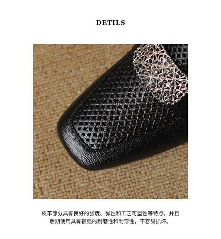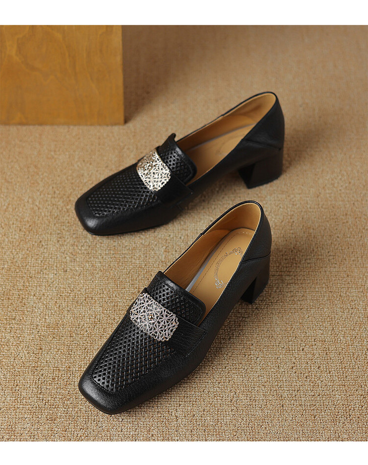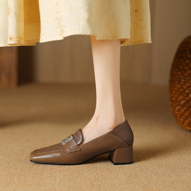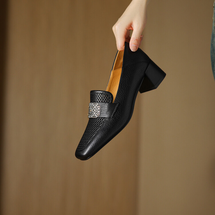【预售5天】复古真皮方扣粗跟中口单鞋女春秋新款方头高跟镂空洞洞款乐福鞋DPJ&2911