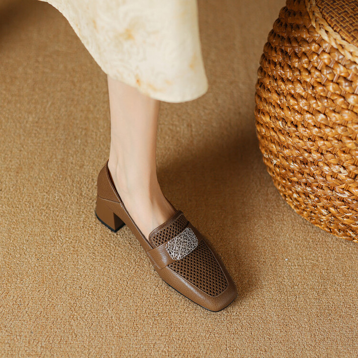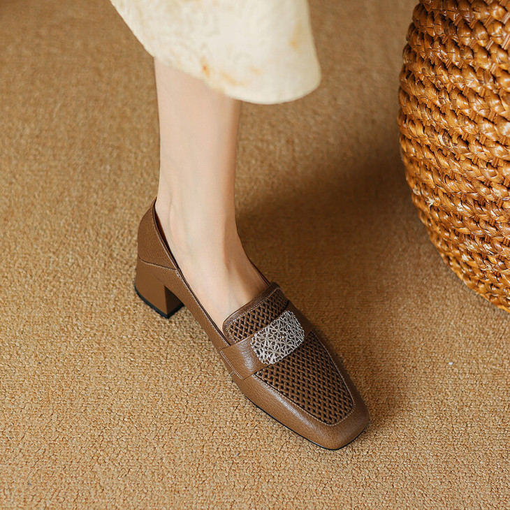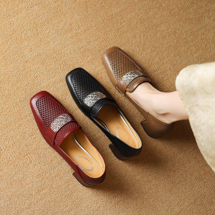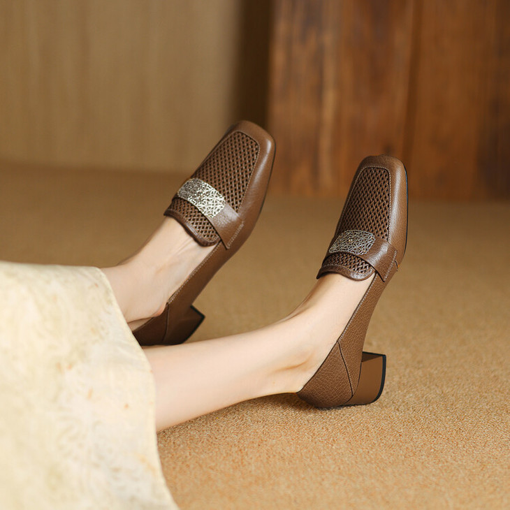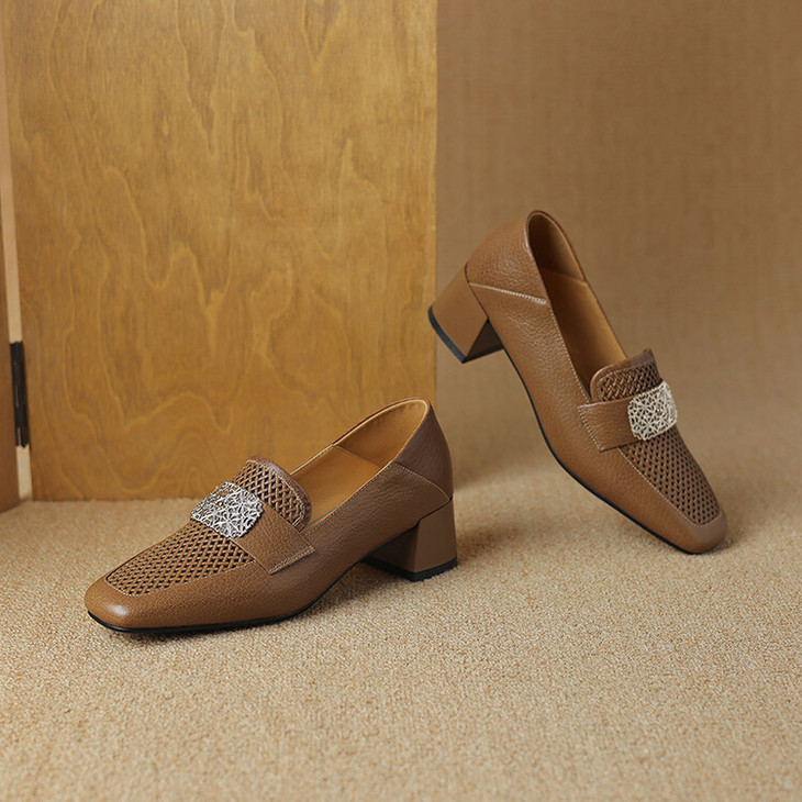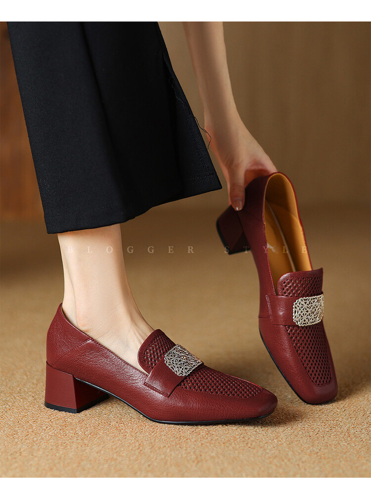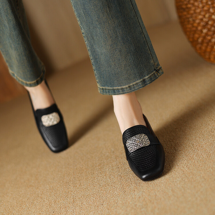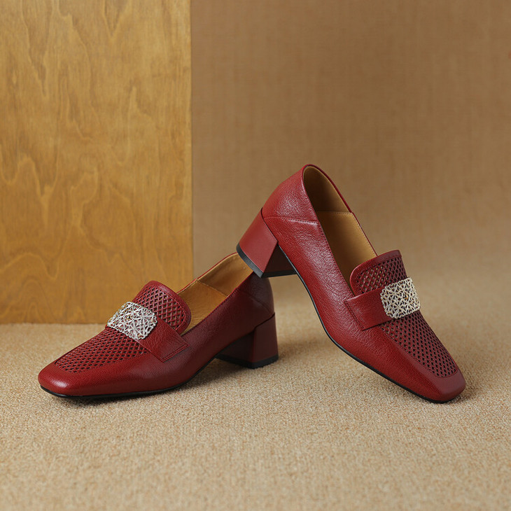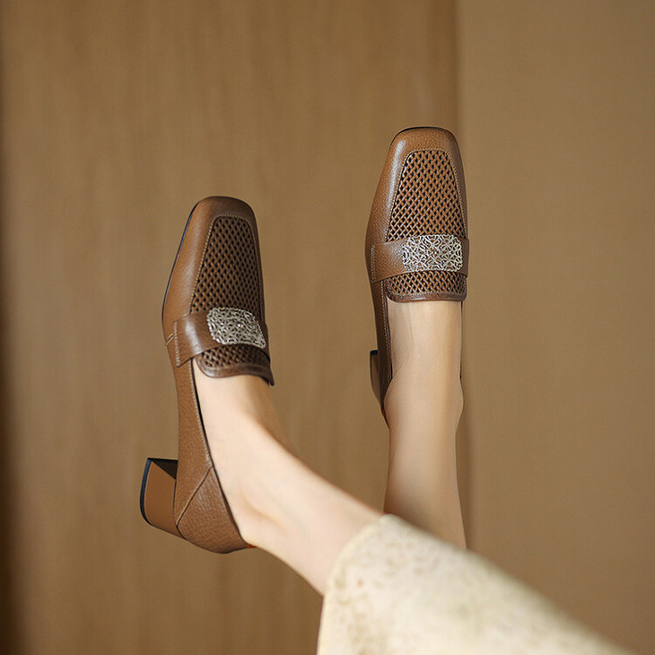 【预售5天】复古真皮方扣粗跟中口单鞋女春秋新款方头高跟镂空洞洞款乐福鞋DPJ&2911