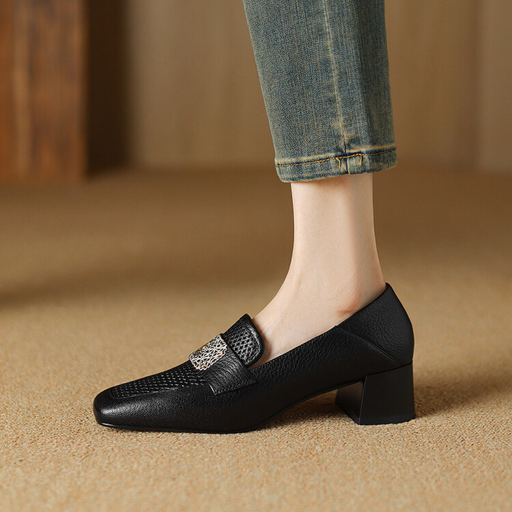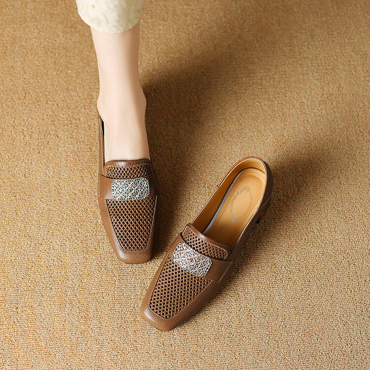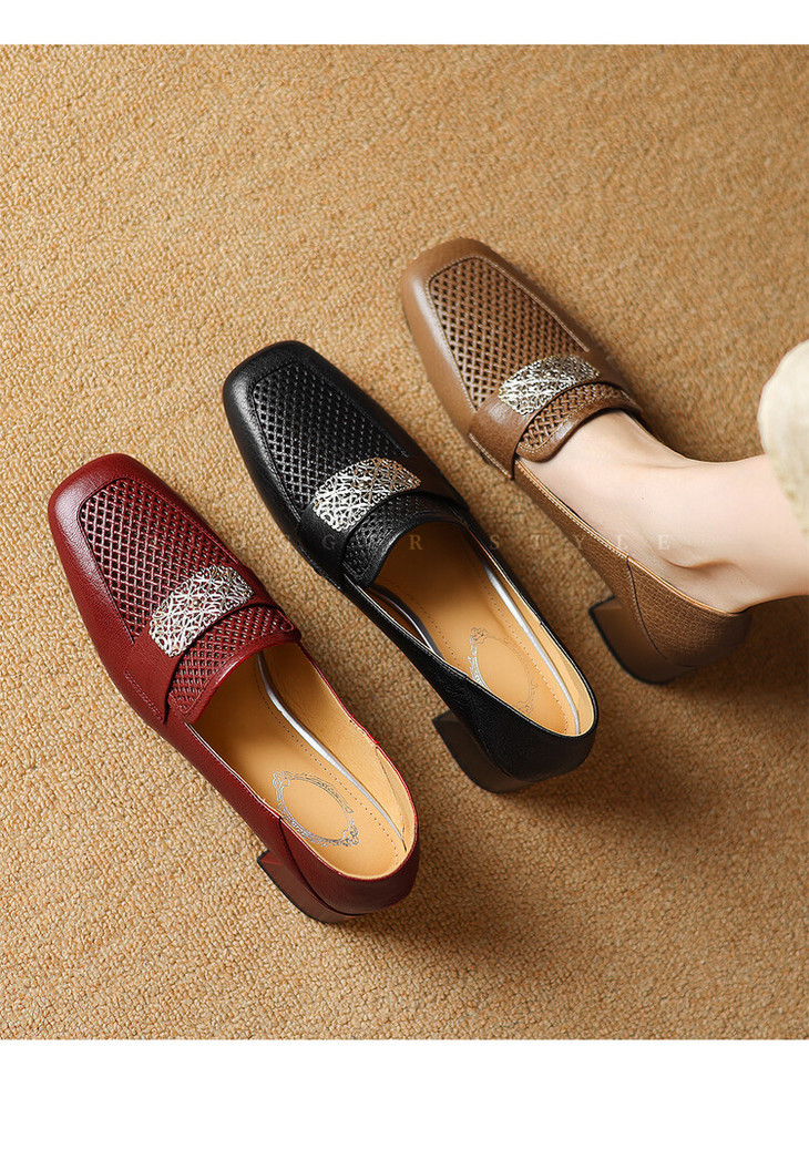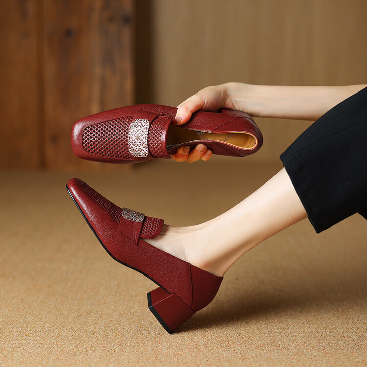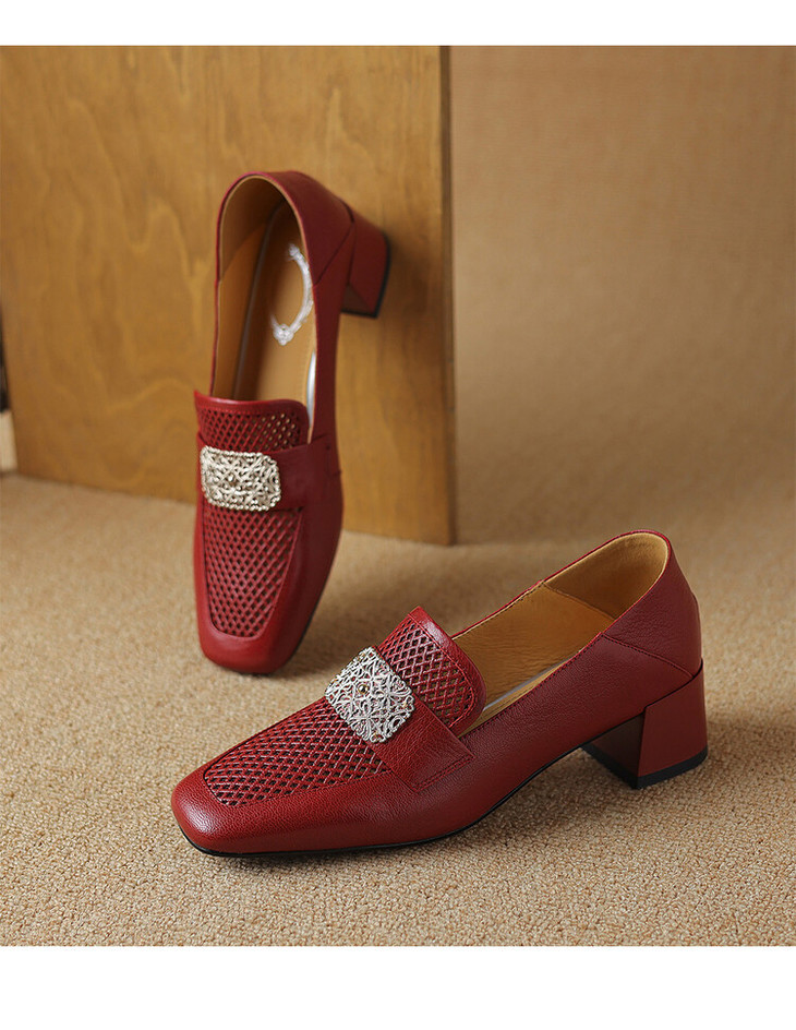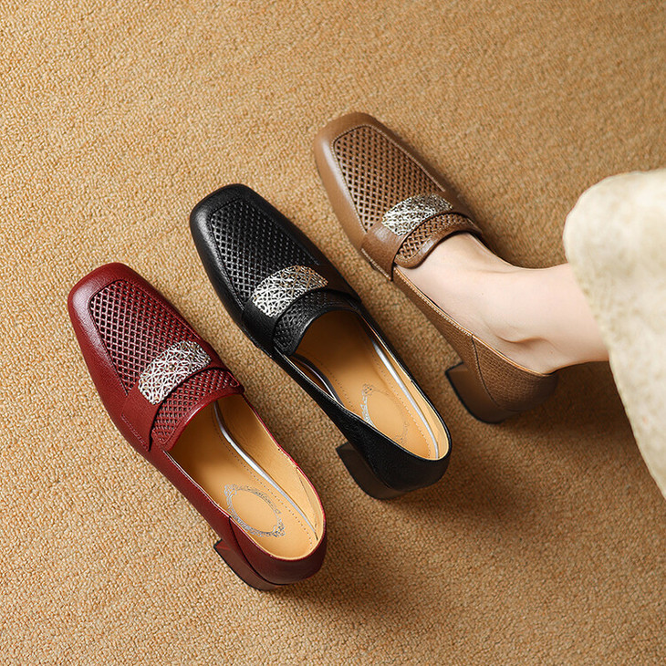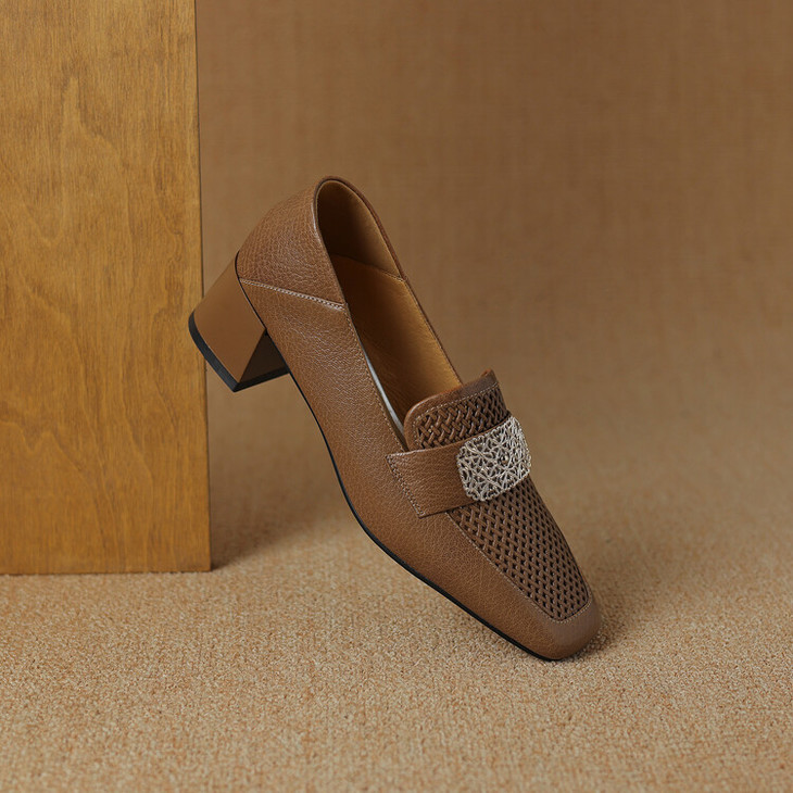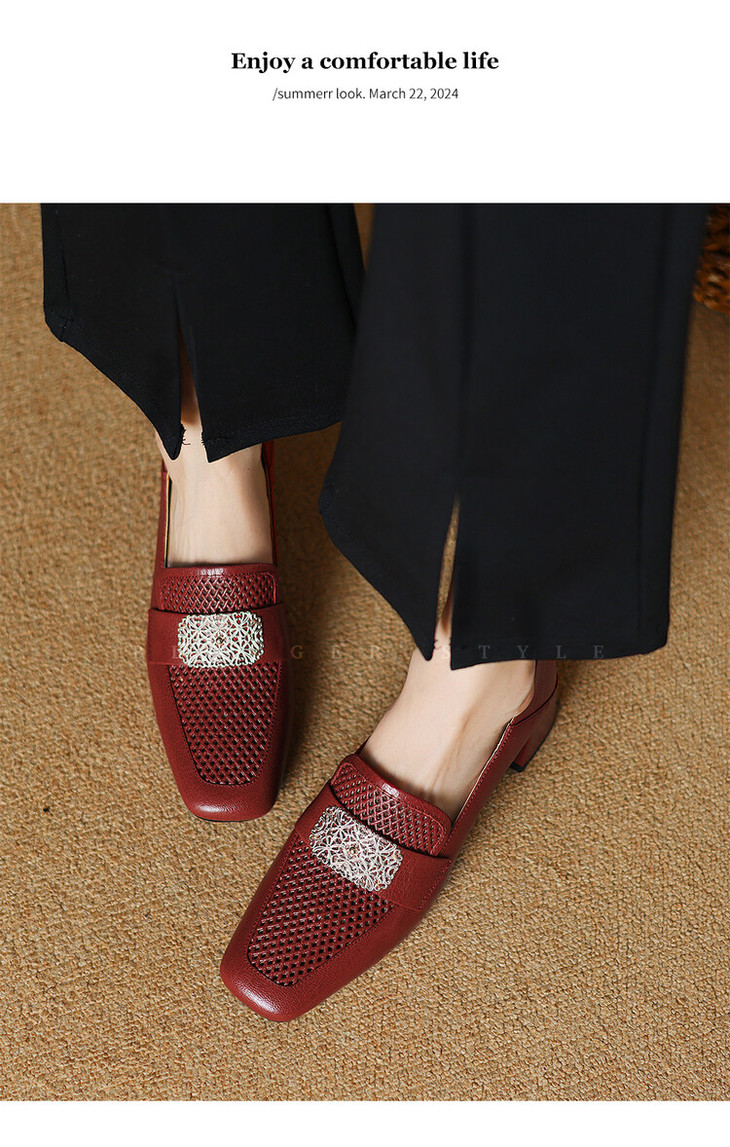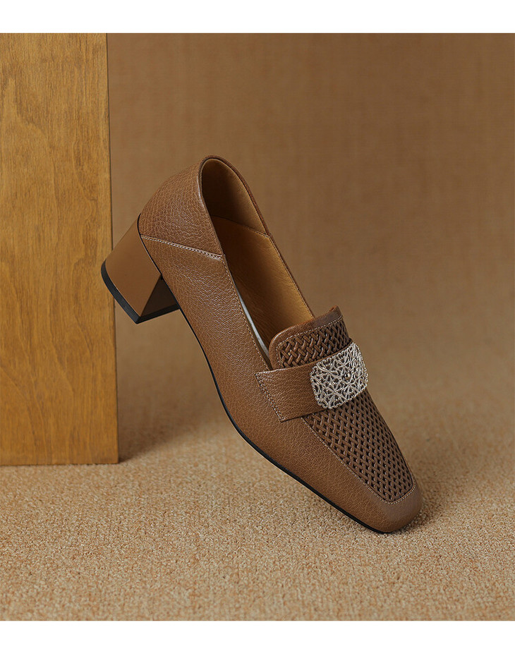 【预售5天】复古真皮方扣粗跟中口单鞋女春秋新款方头高跟镂空洞洞款乐福鞋DPJ&2911
