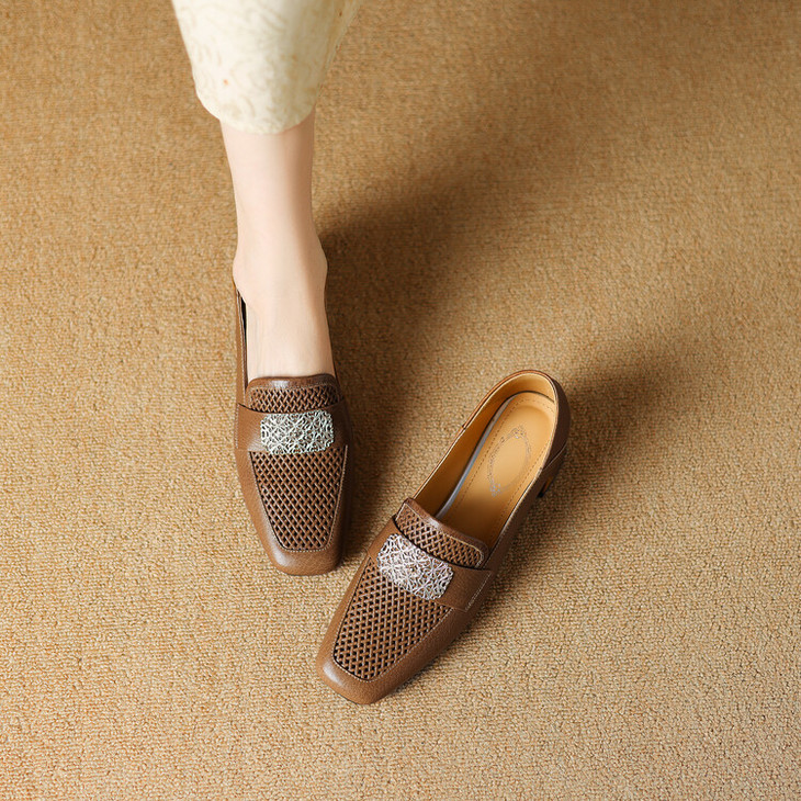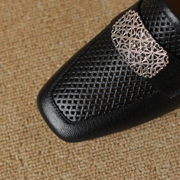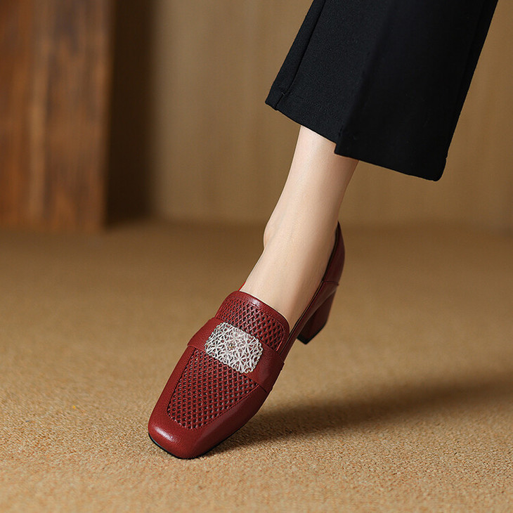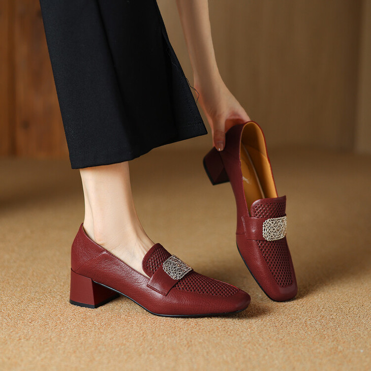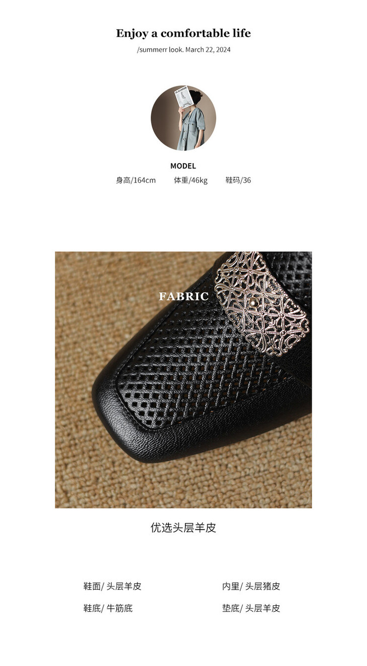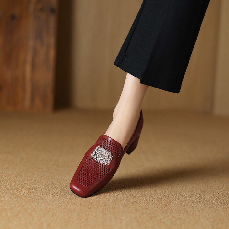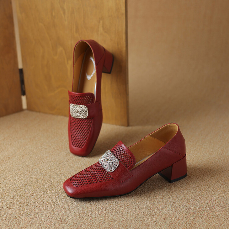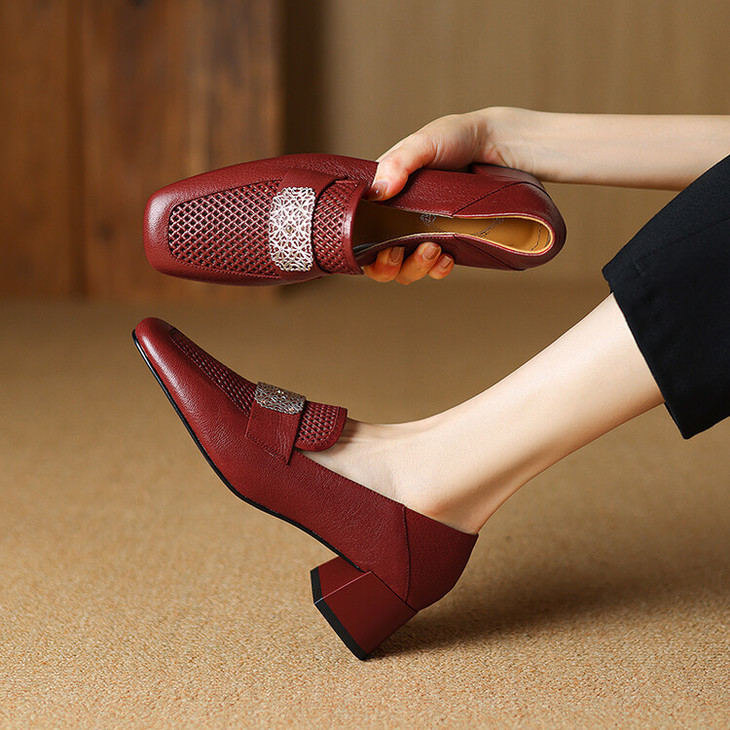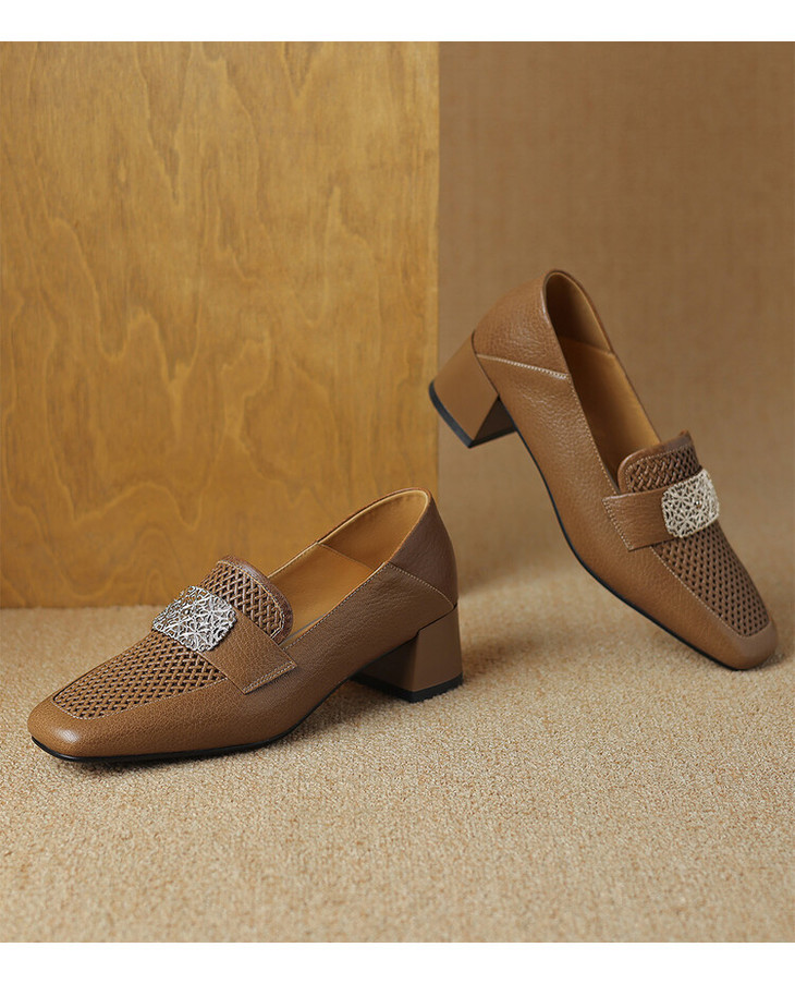 【预售5天】复古真皮方扣粗跟中口单鞋女春秋新款方头高跟镂空洞洞款乐福鞋DPJ&2911