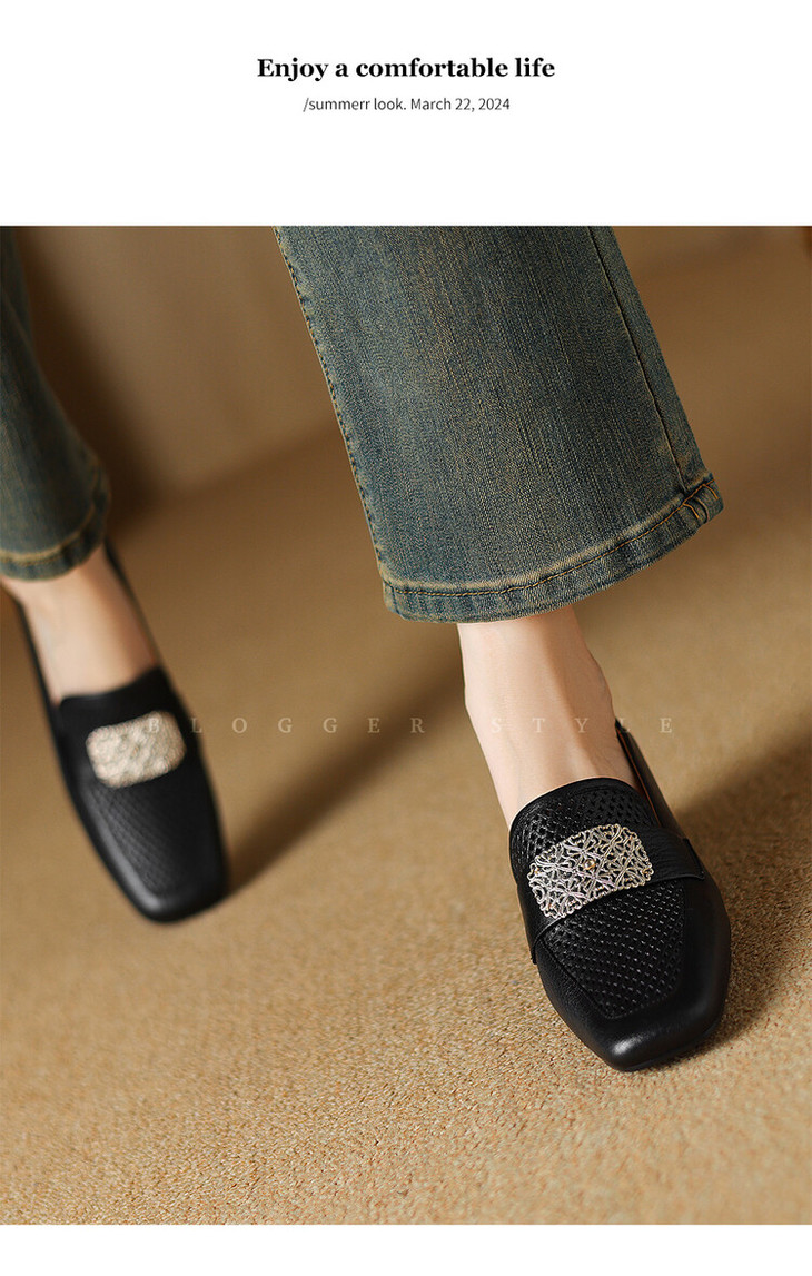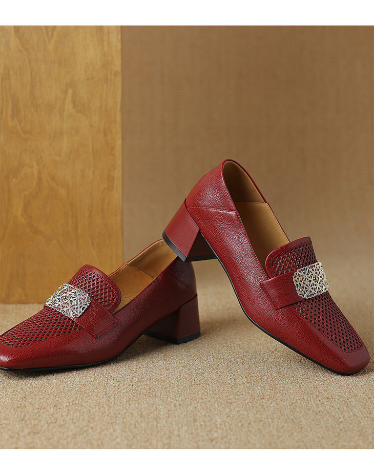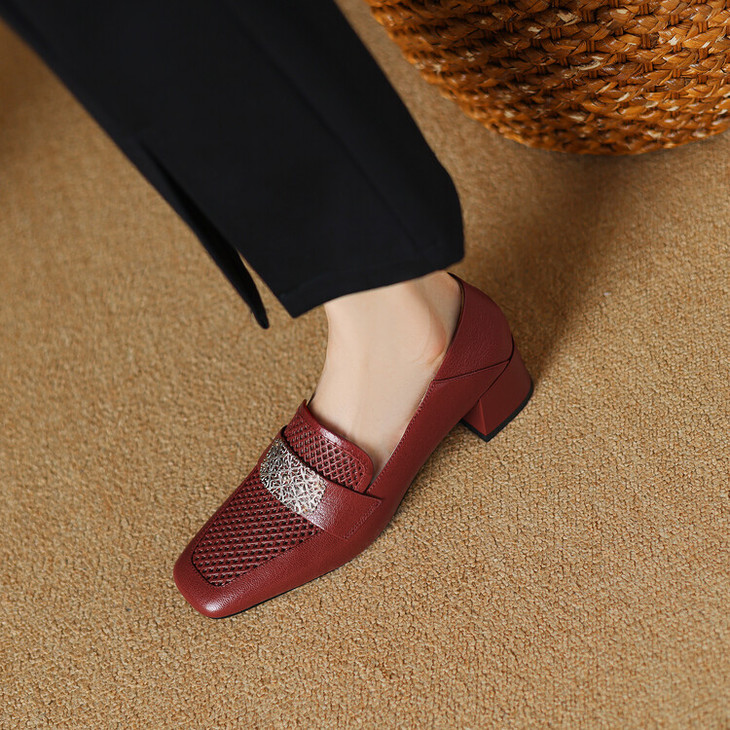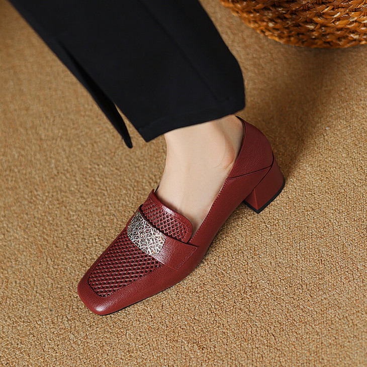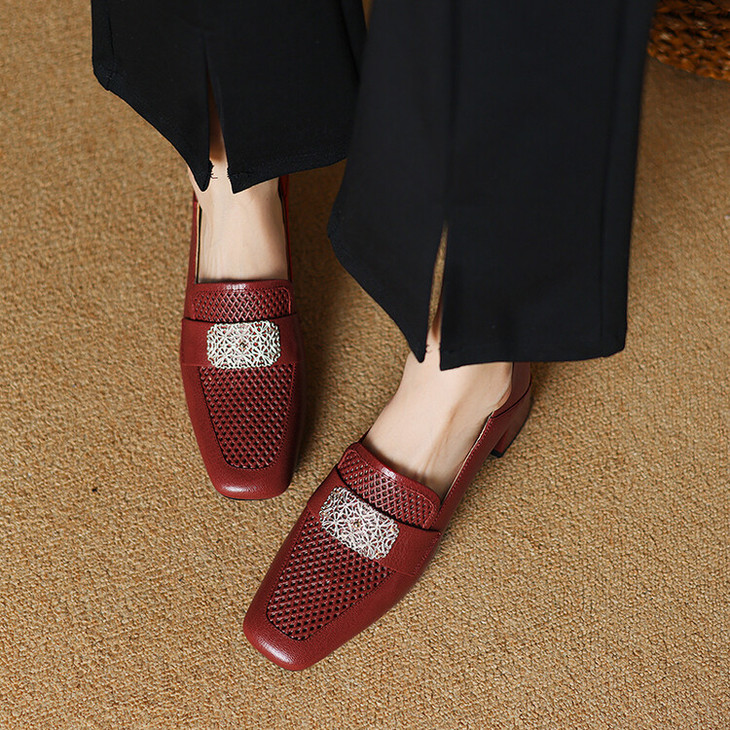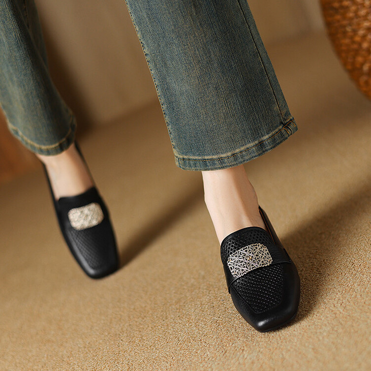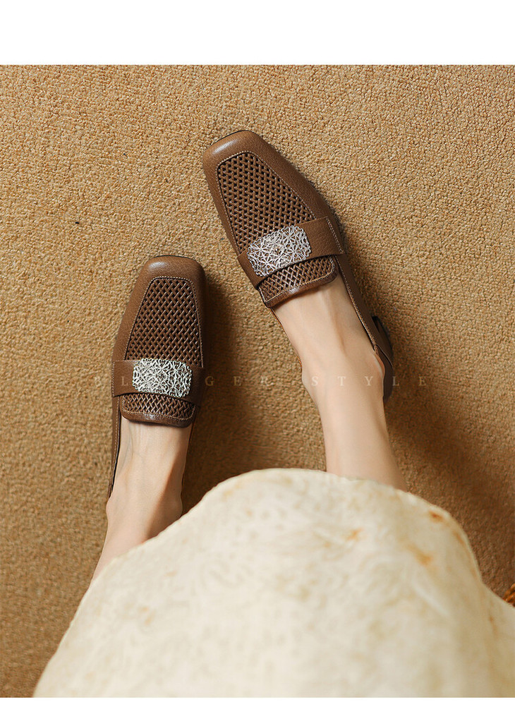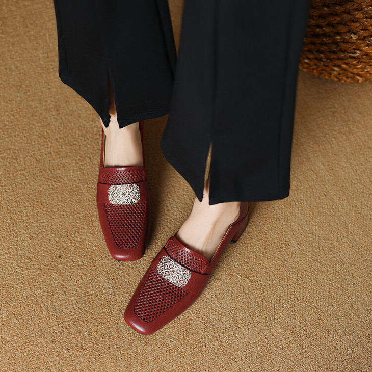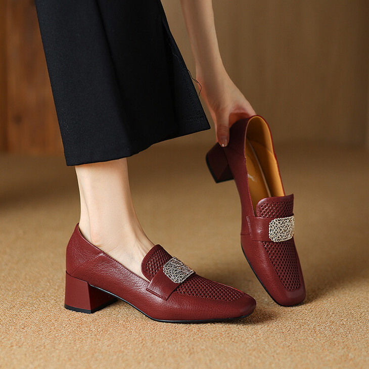 【预售5天】复古真皮方扣粗跟中口单鞋女春秋新款方头高跟镂空洞洞款乐福鞋DPJ&2911