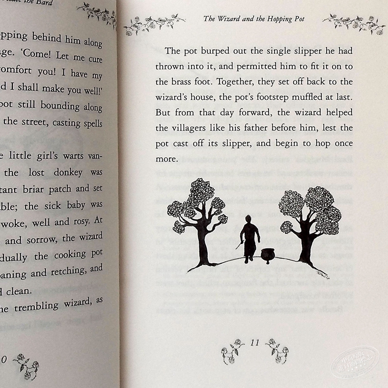 The stories are accompanied by delightful pen-and-ink illustrations by Ms. Rowling herself, featuring a still-life frontispiece for each one. Professor Dumbledore’s commentary—apparently written some eighteen months before his death—reveals not just his vast knowledge of Wizarding lore, but also more of his personal qualities: his sense of humor, his courage, his pride in his abilities, and his hard-won wisdom. Names familiar from the Harry Potter novels sprinkle the pages, including Aberforth Dumbledore, Lucius Malfoy and his forebears, and Sir Nicholas de Mimsy-Porpington (or “Nearly Headless Nick”), as well as other professors at Hogwarts and the past owners of the Elder Wand. Dumbledore tells us of incidents unique to the Wizarding world, like hilariously troubled theatrical productions at Hogwarts or the dangers of having a “hairy heart.” But he also reveals aspects of the Wizarding world that his Muggle readers might find all too familiar, like censorship, intolerance, and questions about the deepest mysteries in life.