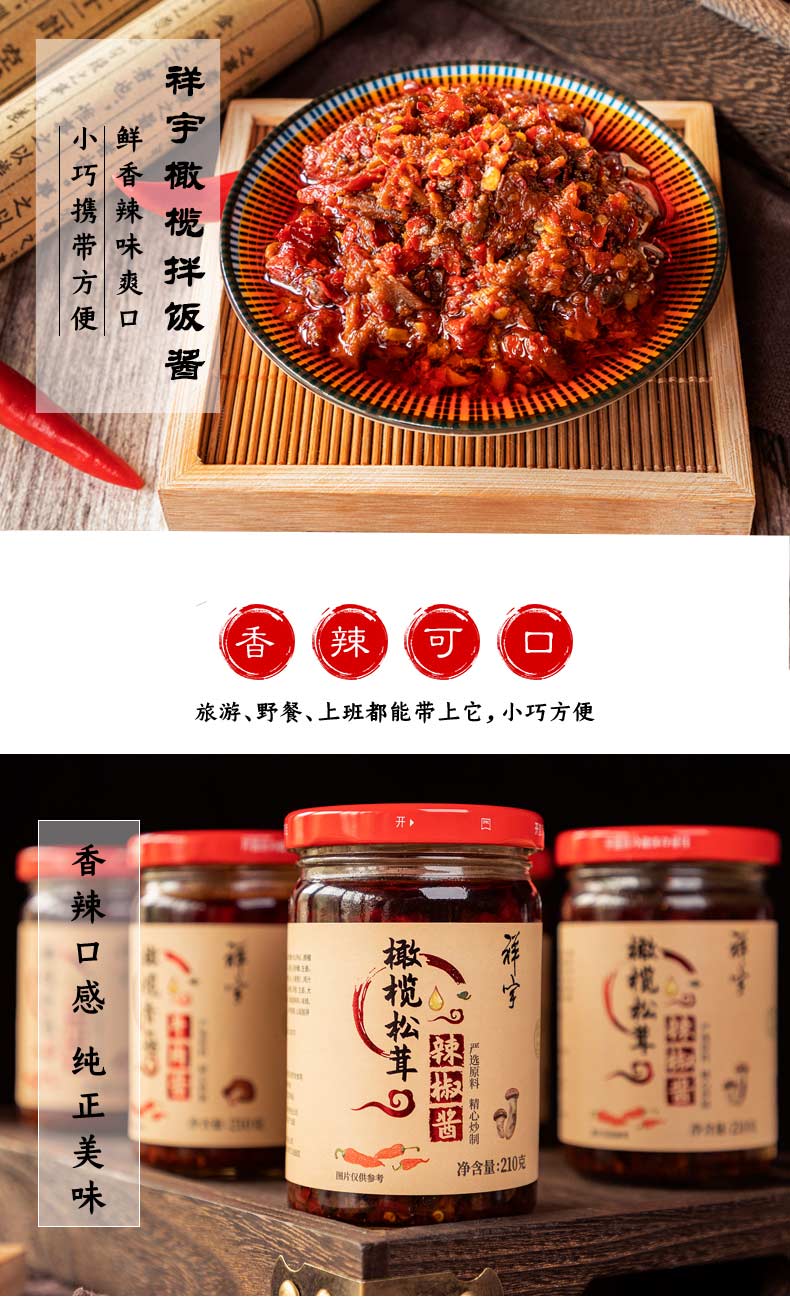 甘肃陇南橄榄拌饭酱下饭菜 祥宇橄榄香菇鸡肉酱牛肉酱 橄榄松茸辣椒酱 三种口味组合装发货共6瓶
