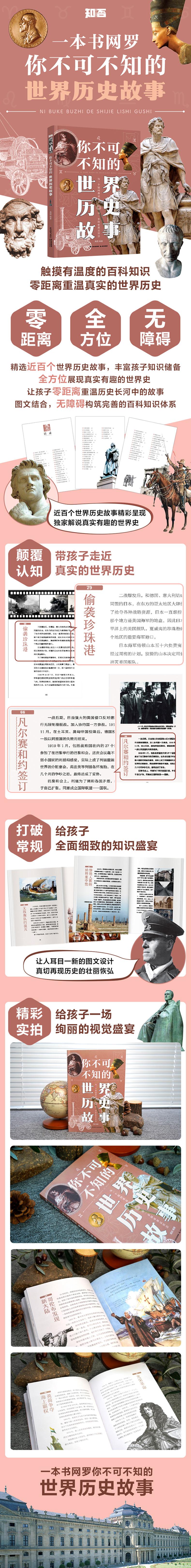 1.以时间为线,穿起世界历史舞台上一个个难忘的瞬间2.用事件线索加故事片断的形式,陈述精彩纷呈的风云际会3.严谨考究、纵横兼顾的主题,清晰亮出历史大脉络4.珍贵的纪实照片、绘画等图片,映射原汁原味的时代风貌