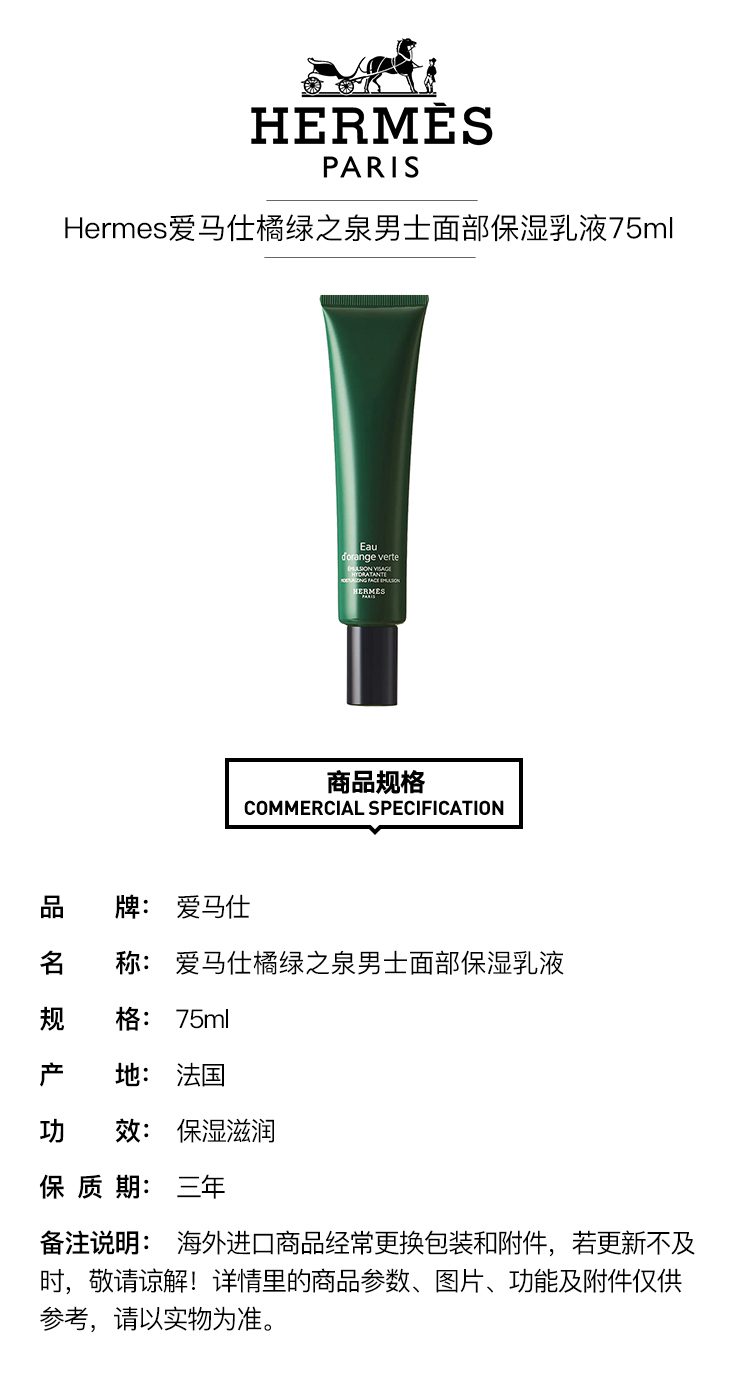 Hermes爱马仕橘绿之泉男士面部保湿乳液75ml