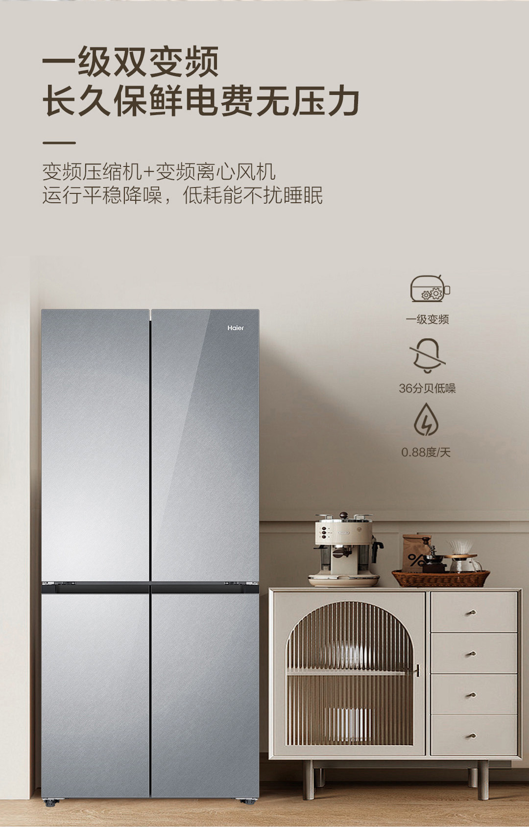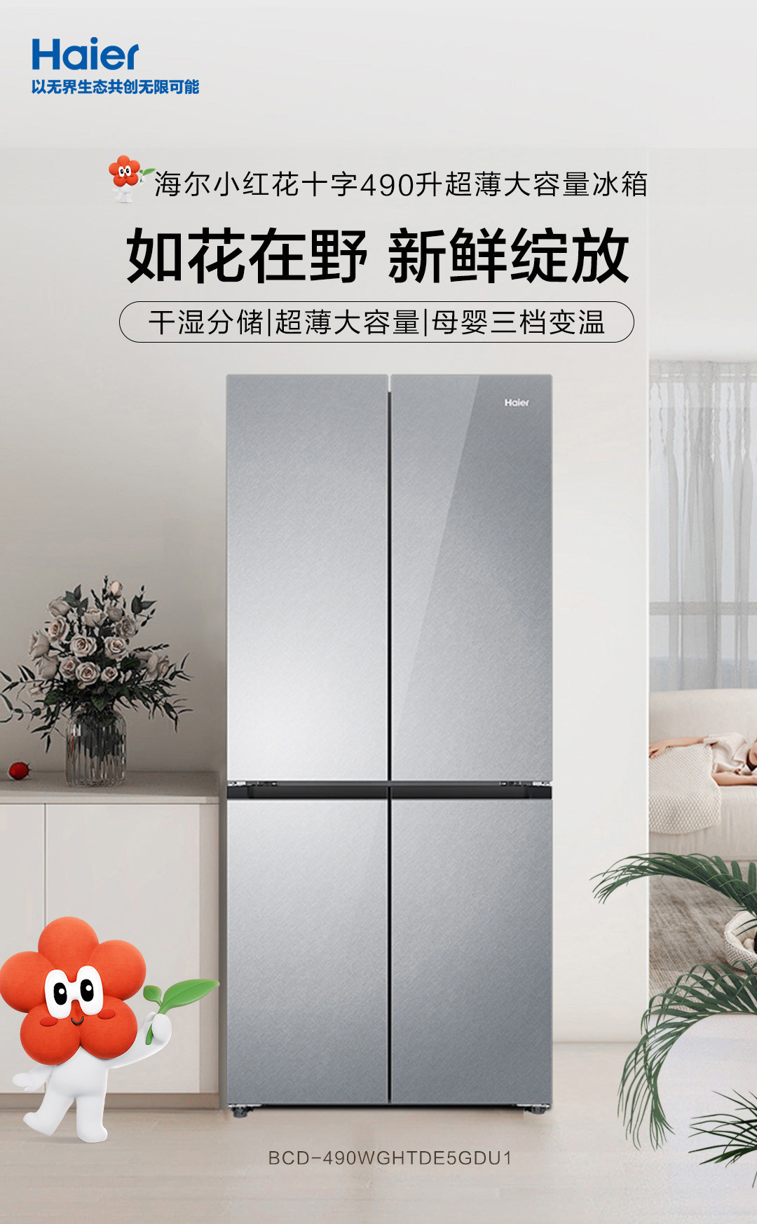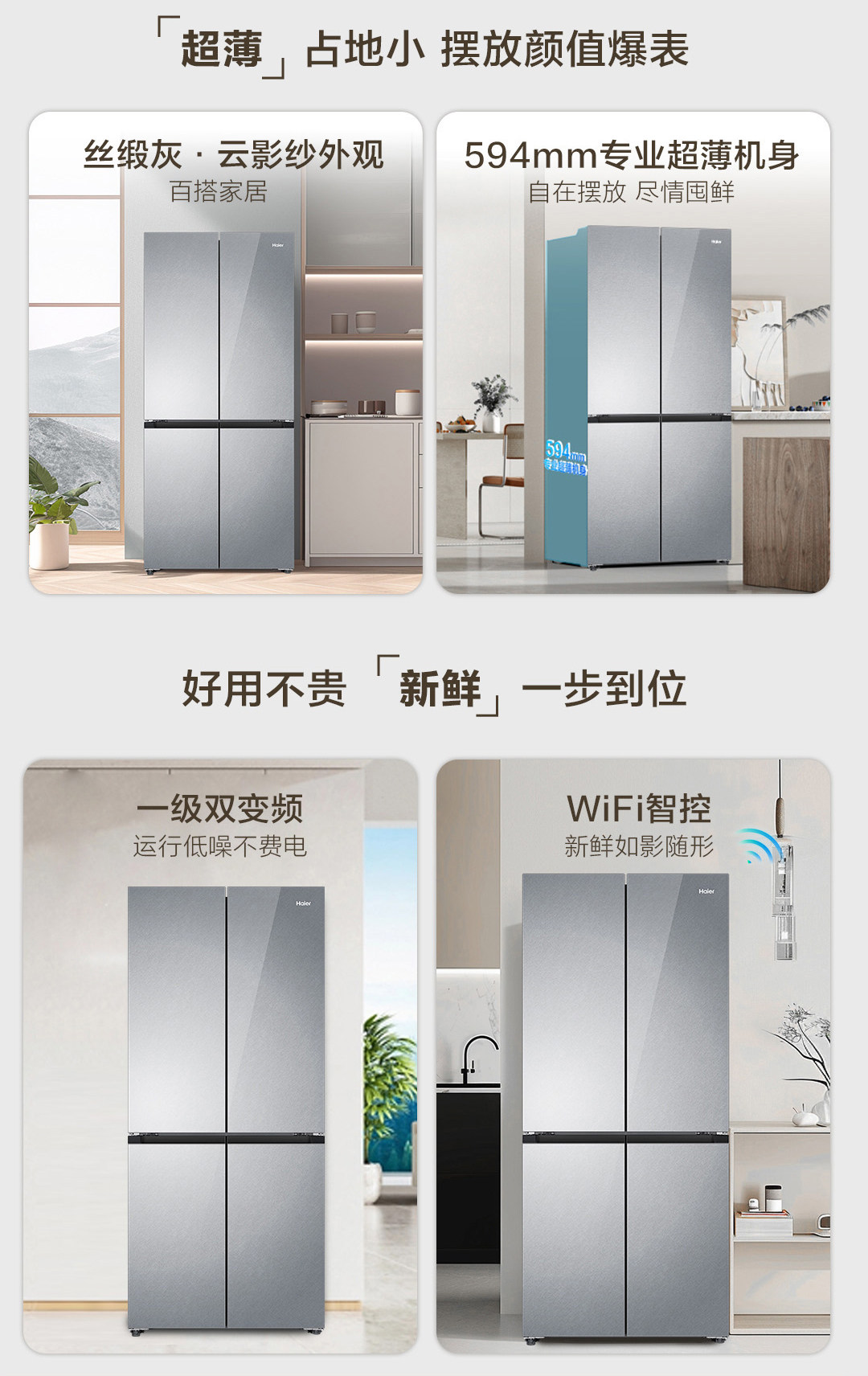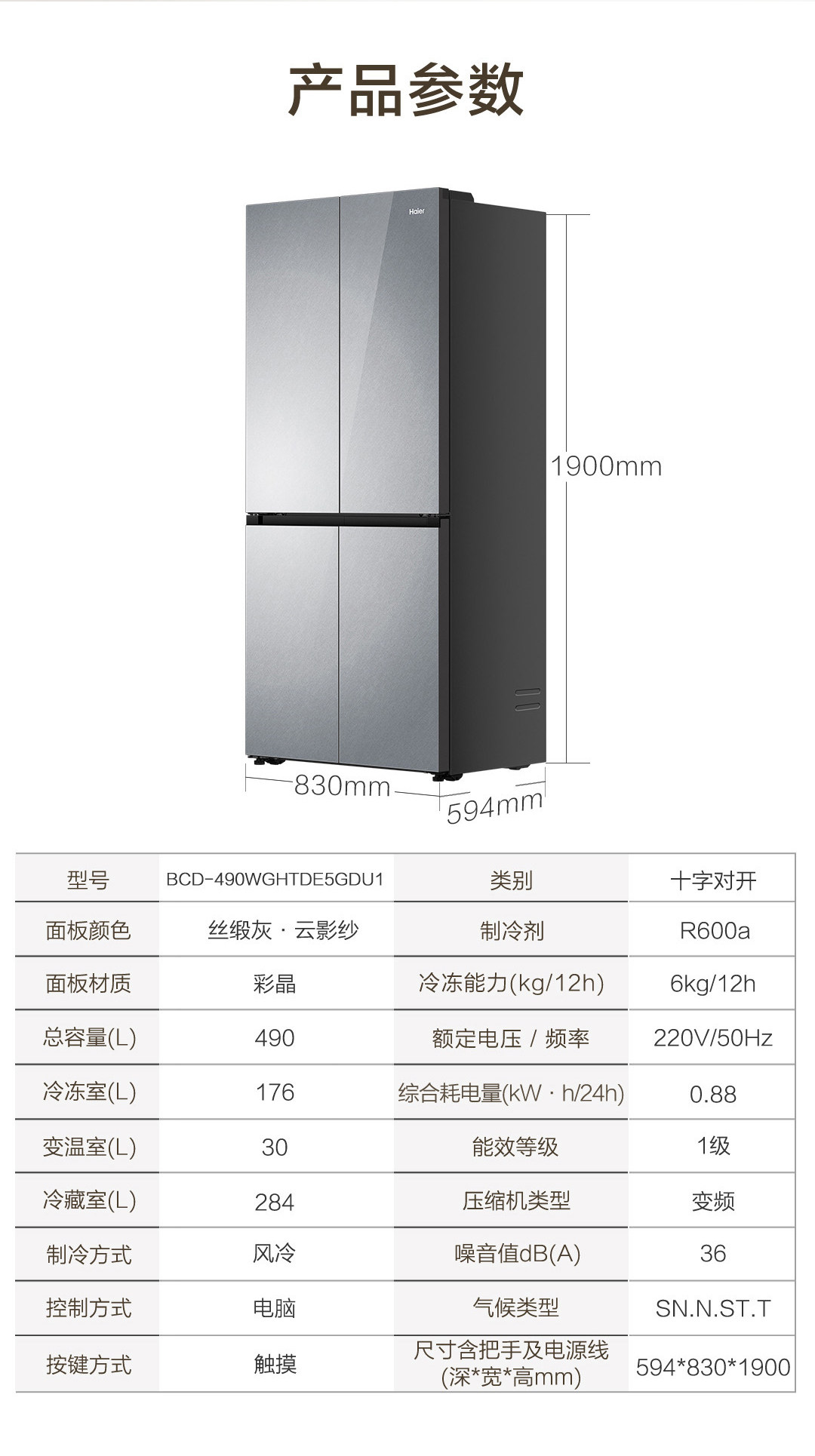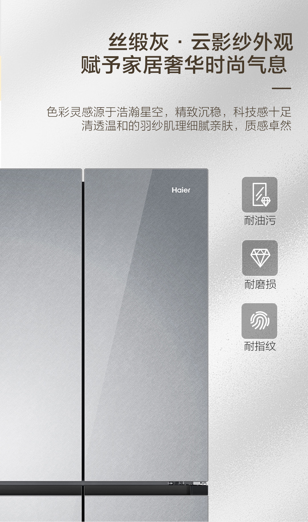 海尔小红花490升超薄钢化玻璃面板一级双变频风冷大容量家用冰箱 BCD-490WGHTDE5GDU1十字门 丝缎灰·云影纱