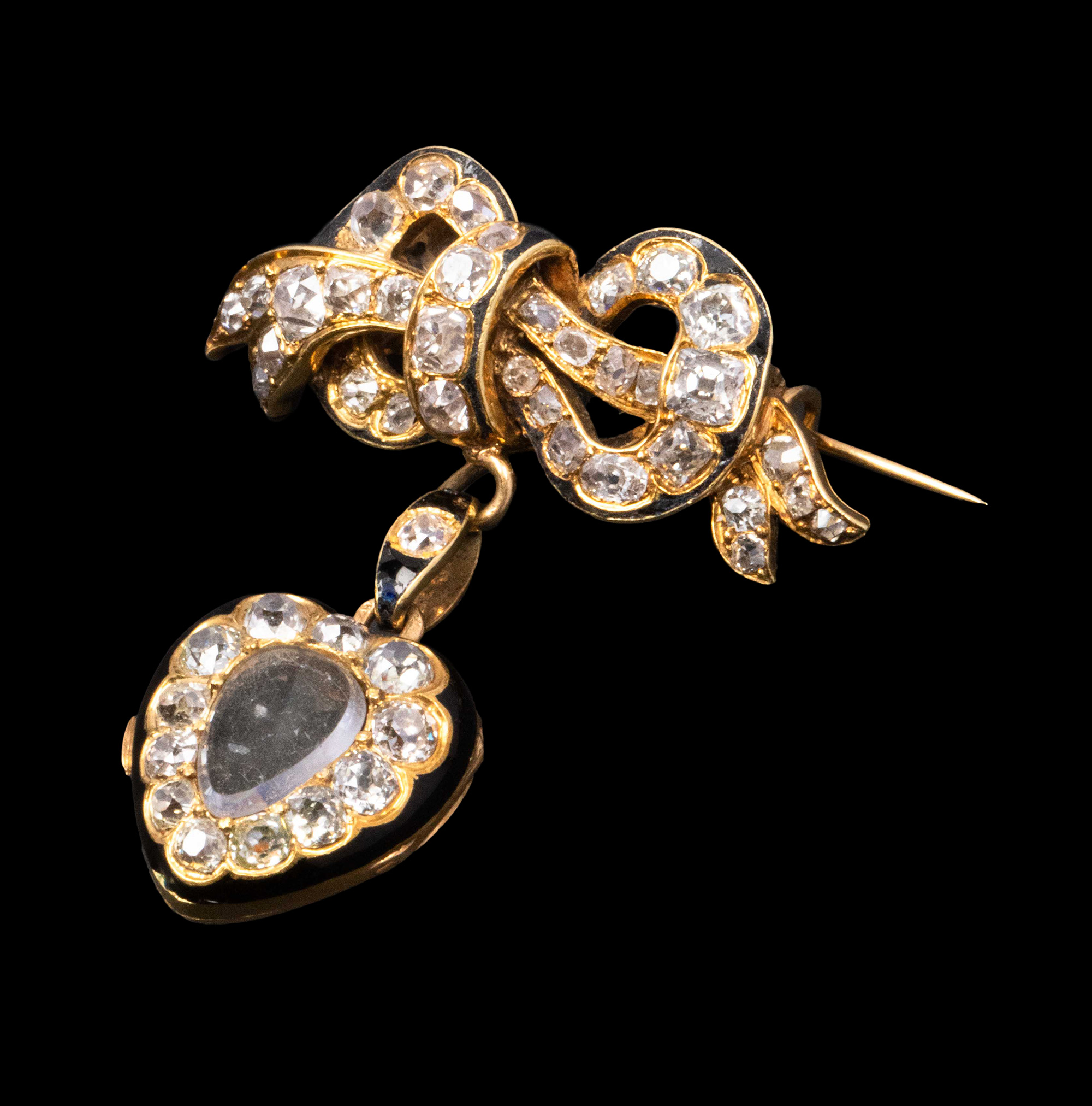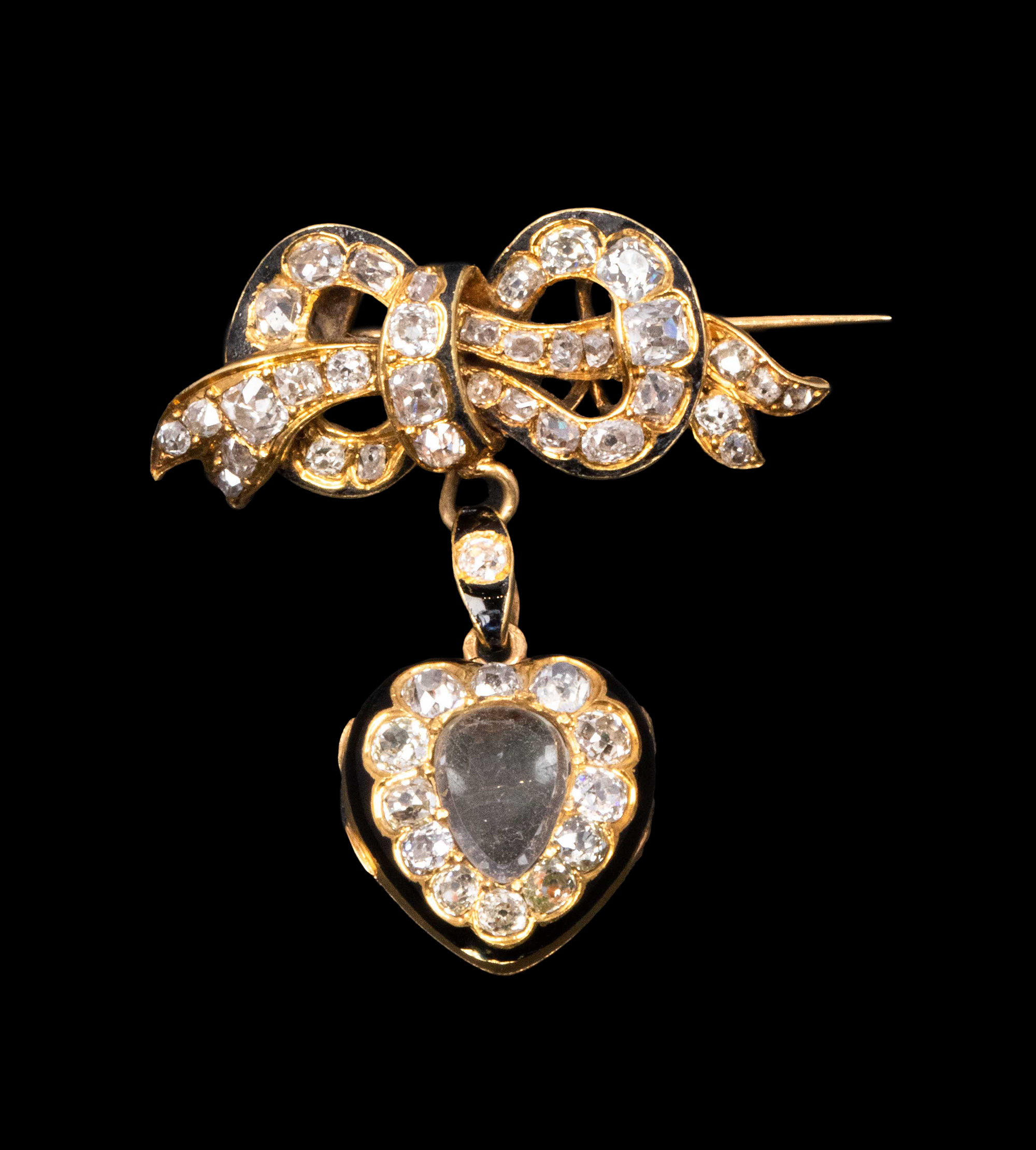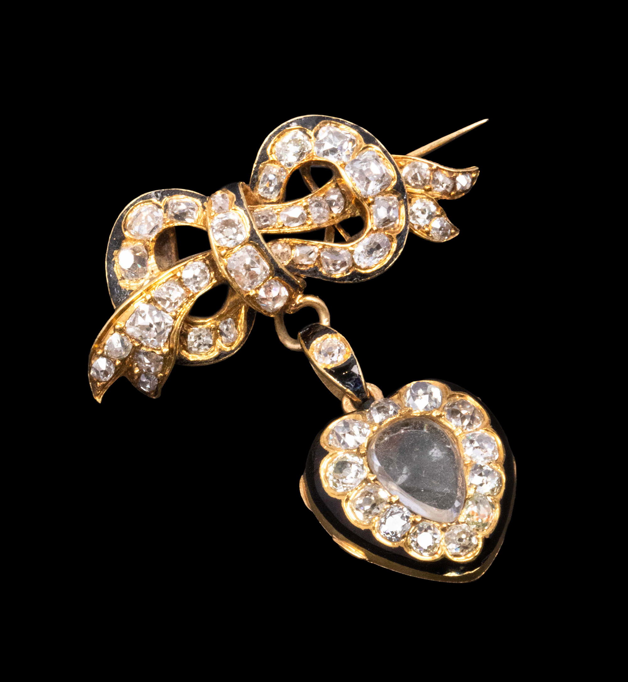 1890年代法国出品18K黄金镶嵌钻石及黑色珐琅蝴蝶结爱心造型胸针