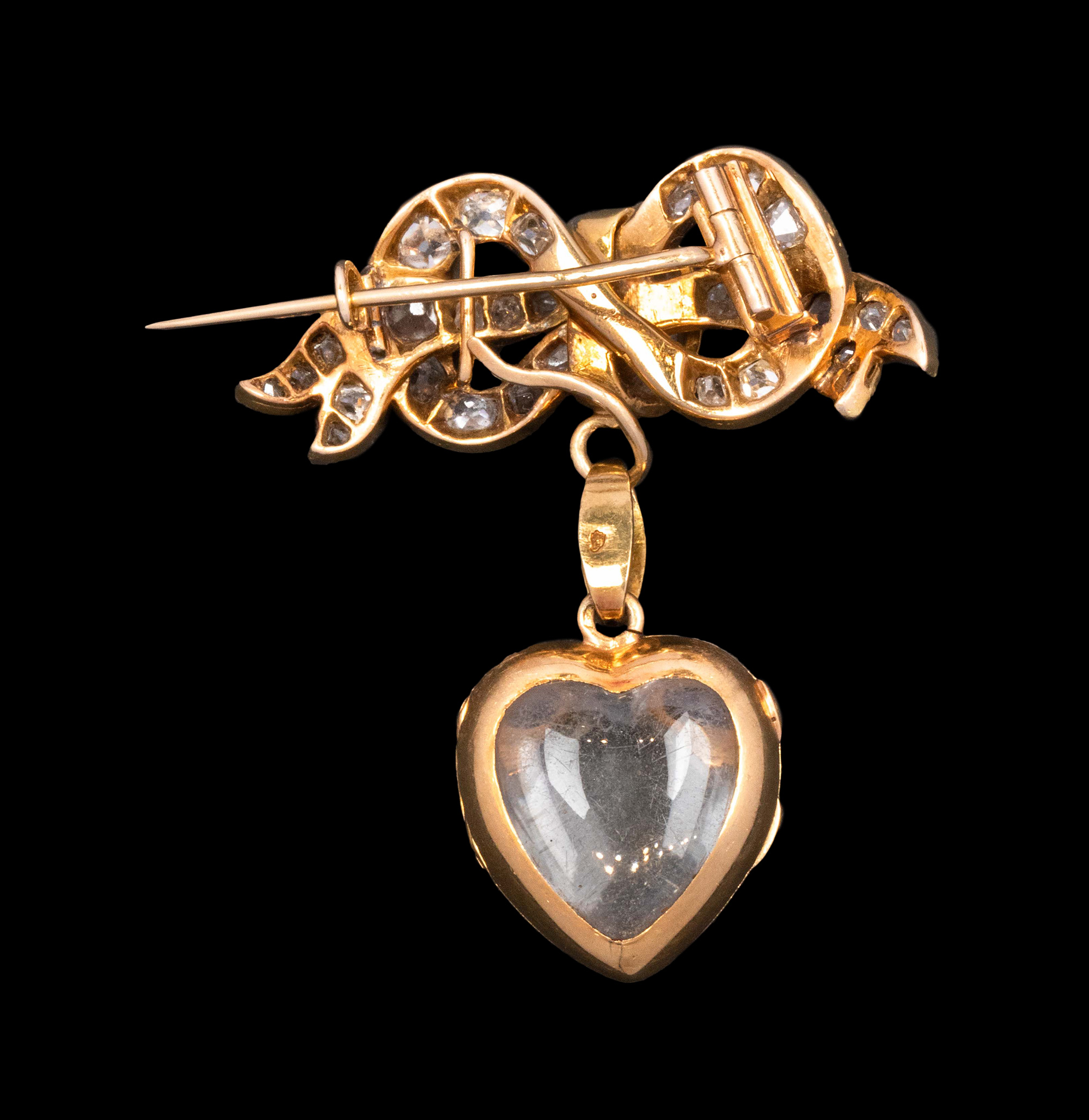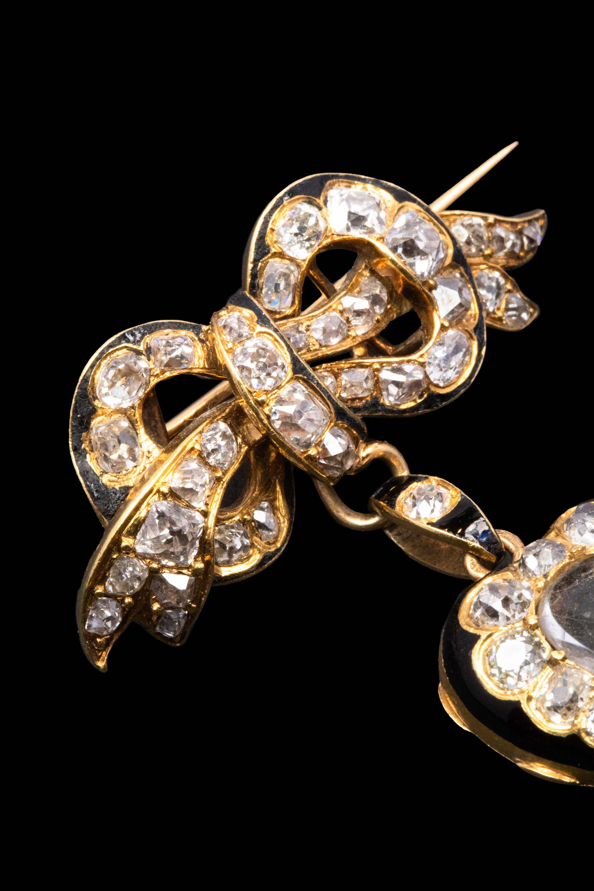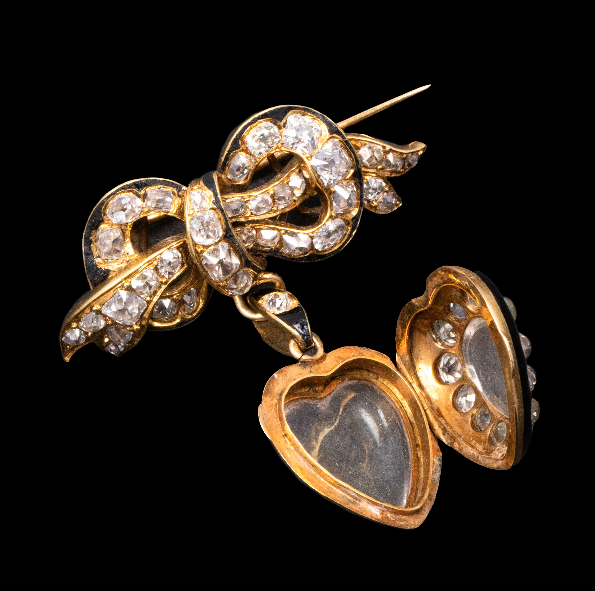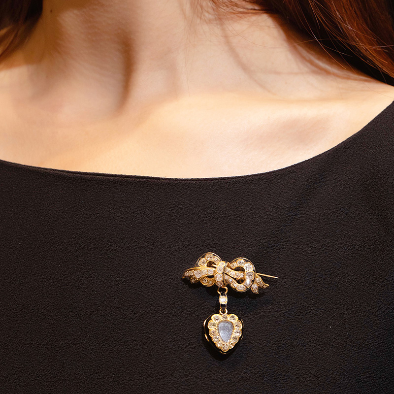 1890年代法国出品18K黄金镶嵌钻石及黑色珐琅蝴蝶结爱心造型胸针