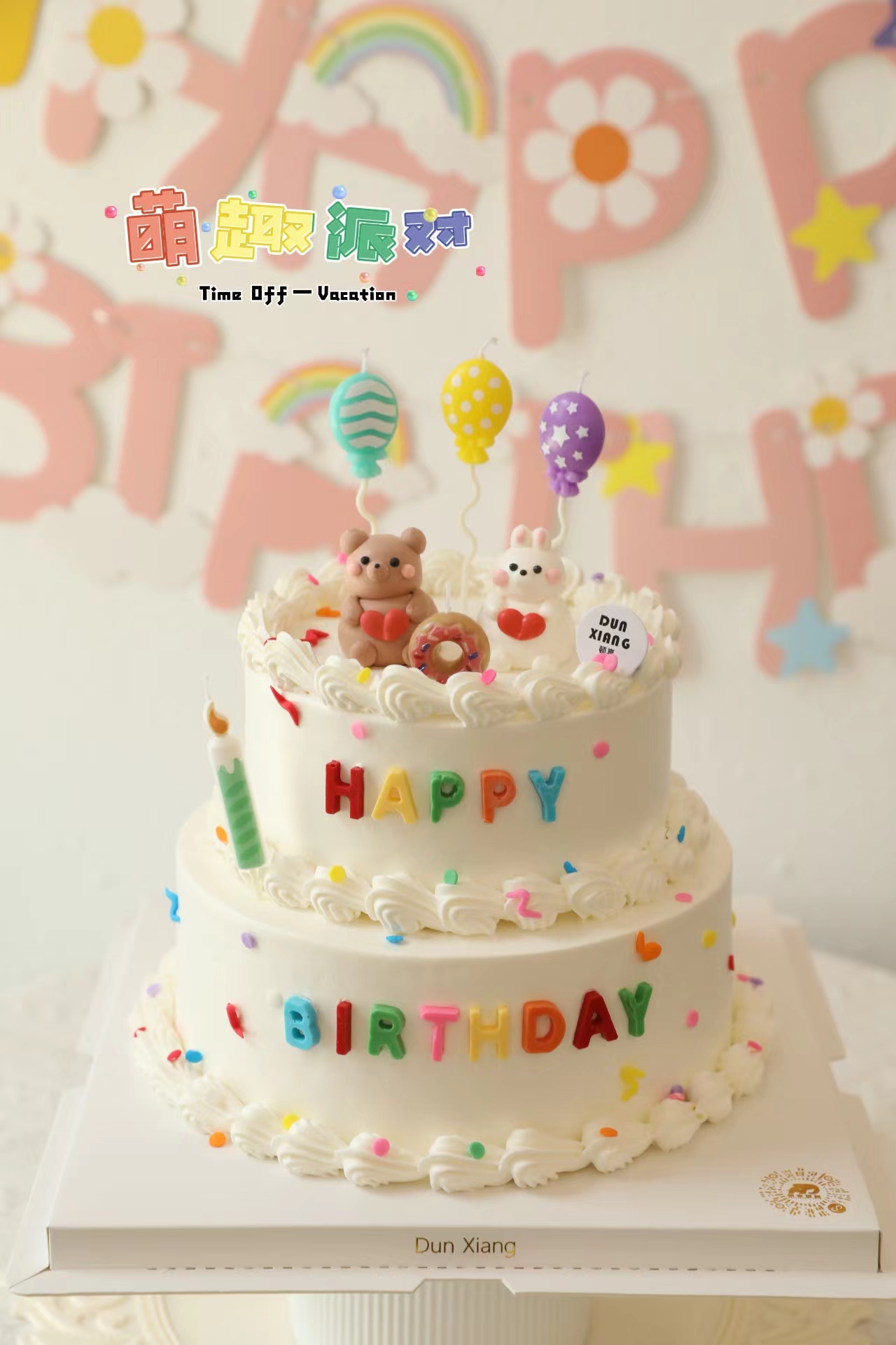 表面的小熊是蛋白糖制作,装饰的甜甜圈蜡烛气球是蜡烛,蜡烛颜色图案随机。