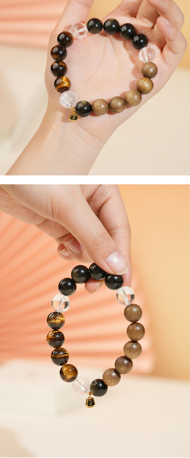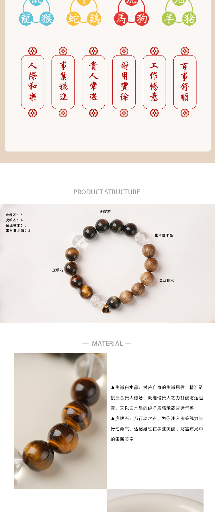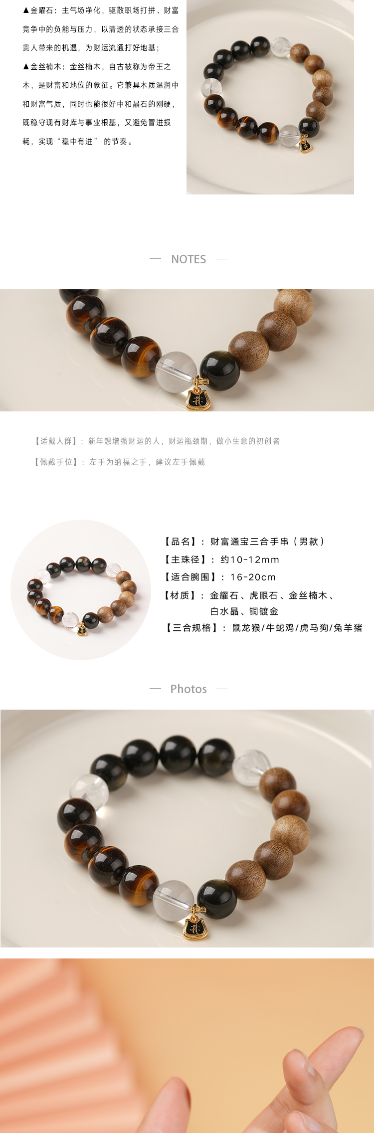 【一念七宝】财富通宝|金耀石虎眼石金丝楠木白水晶三合手串(男款)