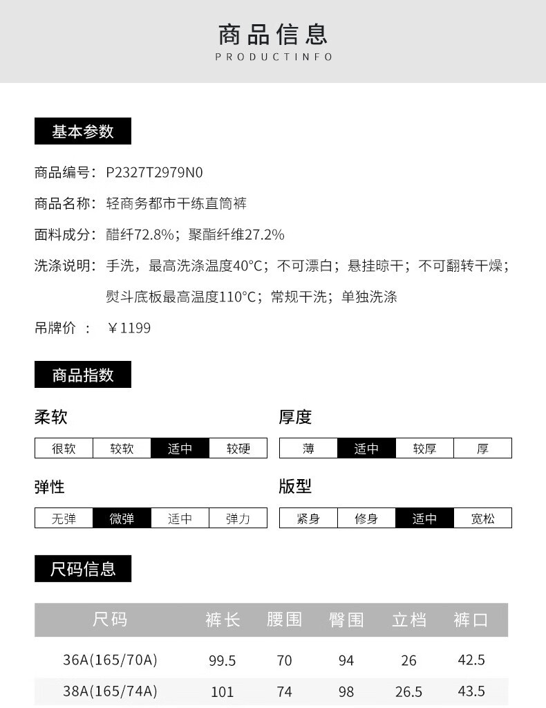 皮尔卡丹女装裤子醋酸直筒裤高级感通勤日常休闲裤P2327T2979N0