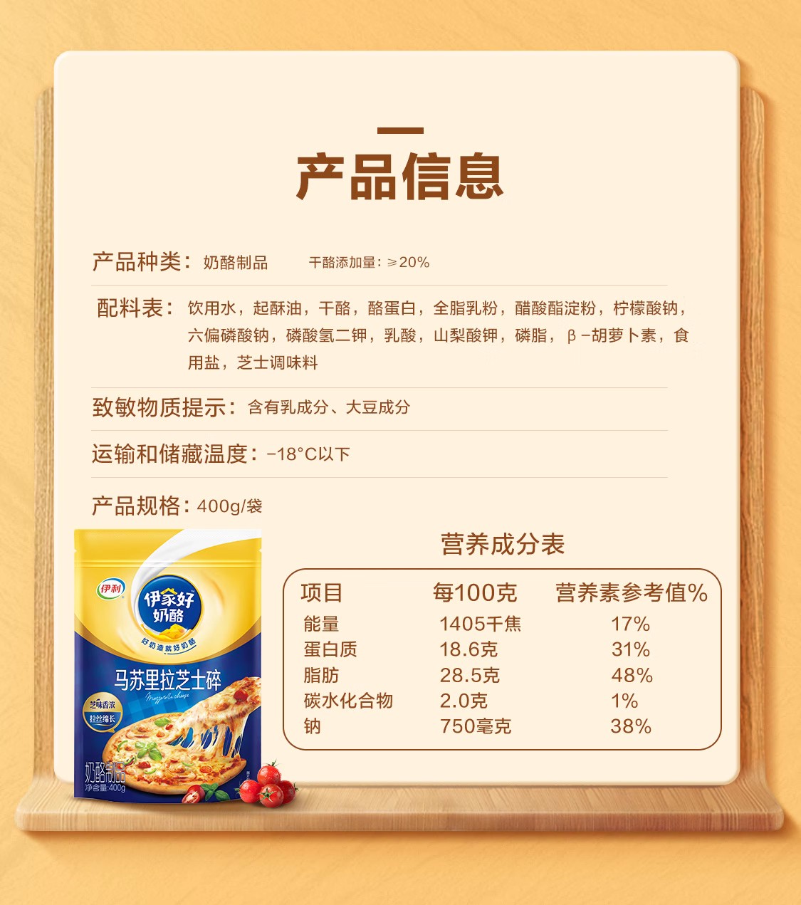 400g 伊利 马苏里拉芝士碎 伊家好奶酪碎 披萨焗饭拉丝奶酪碎 冷冻保存