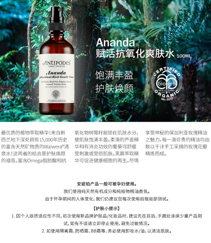 【新西兰直邮】新西兰安媞珀Antipodes抗氧化温和爽肤水100ml深层补水滋养持久保湿JPY带授权招加盟代理