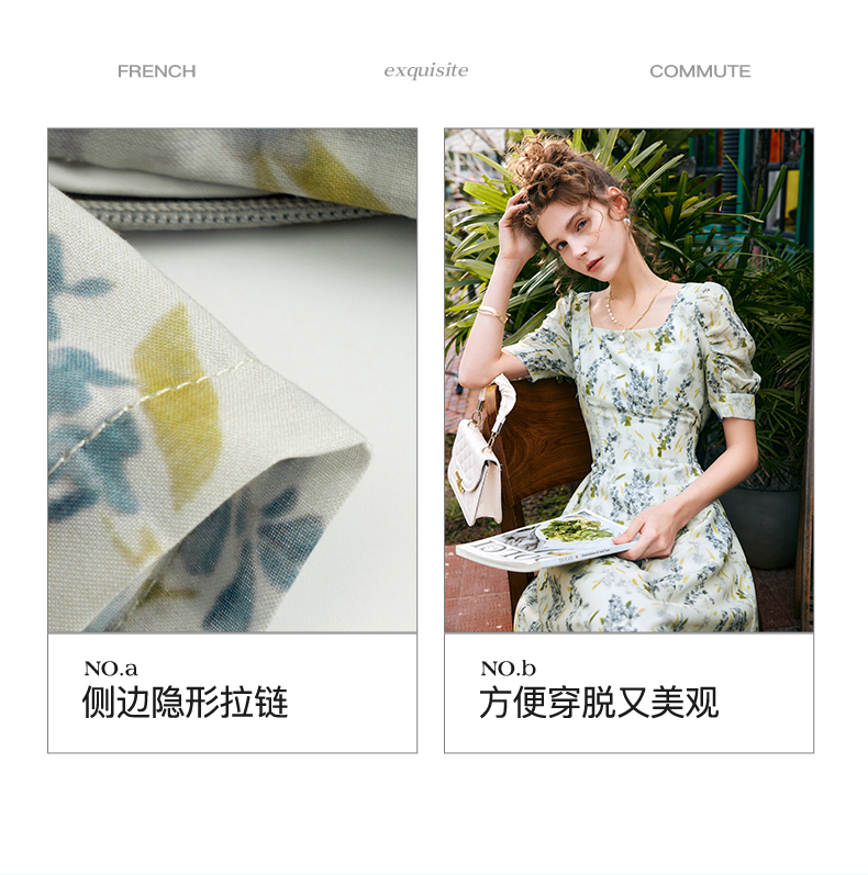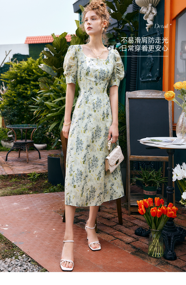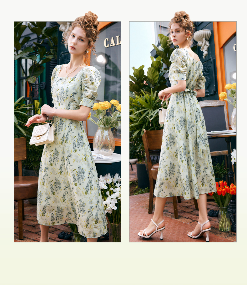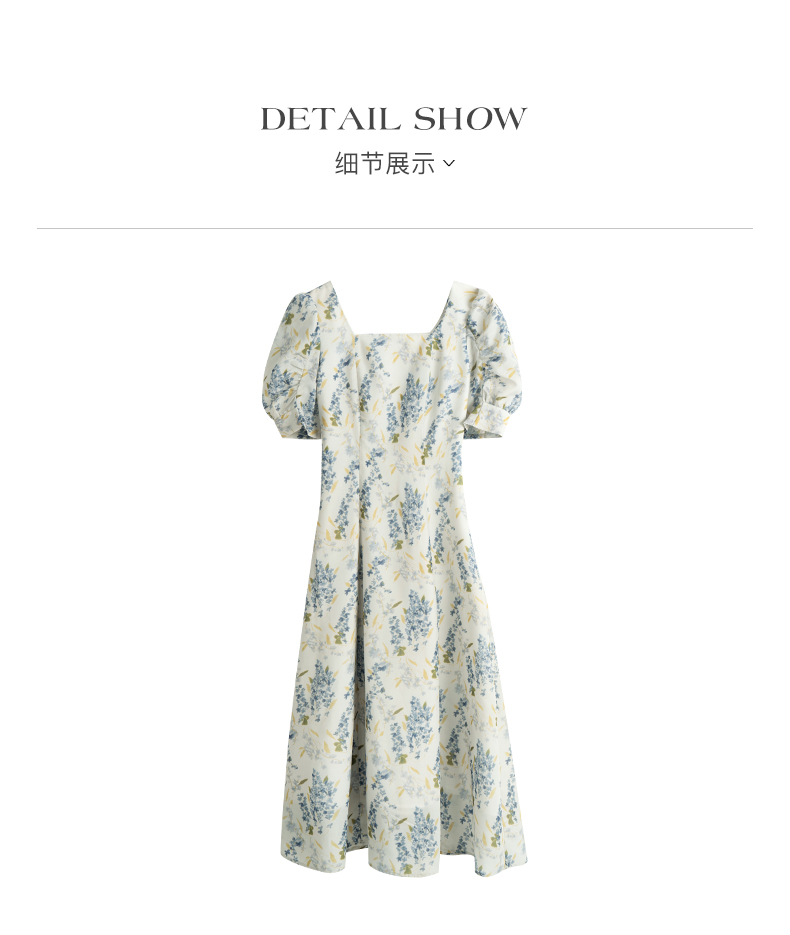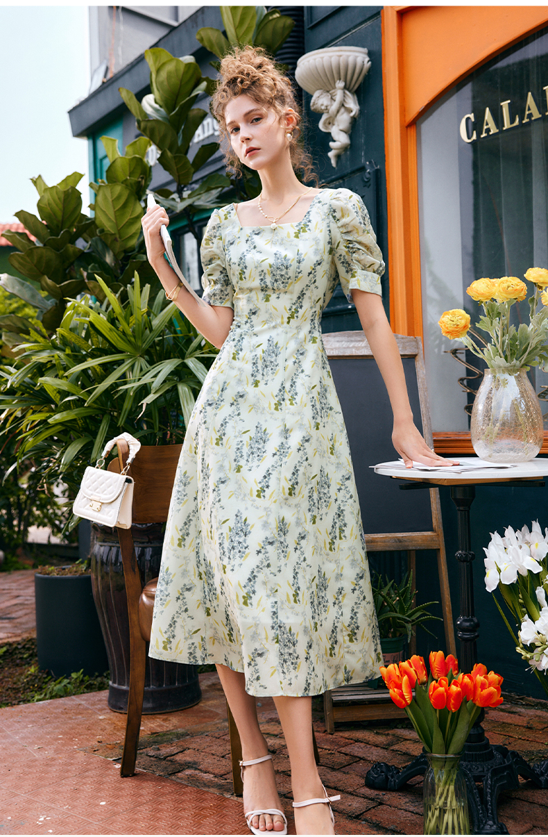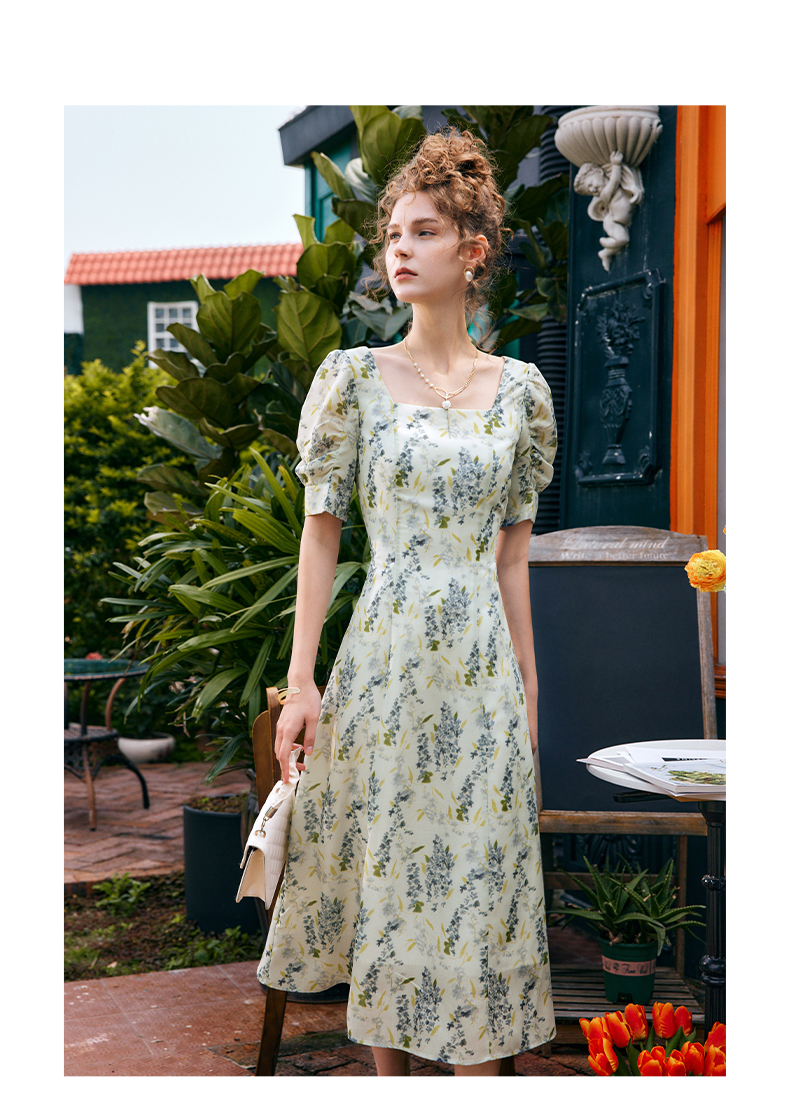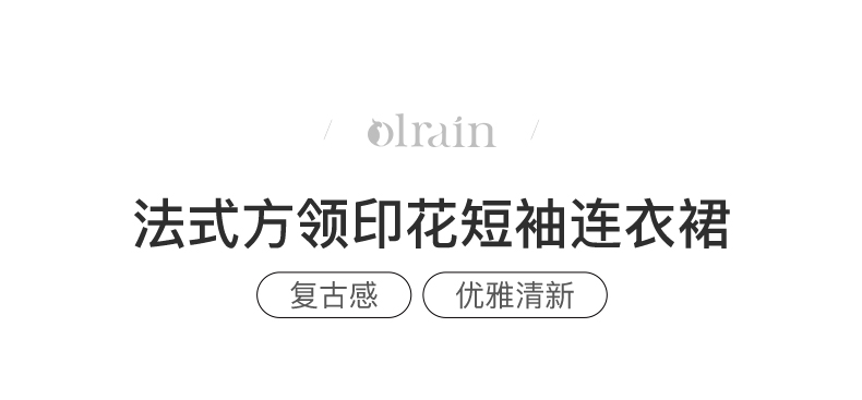 OLrain欧芮儿法式复古方领短袖连衣裙女夏季2025新款气质茶歇长裙