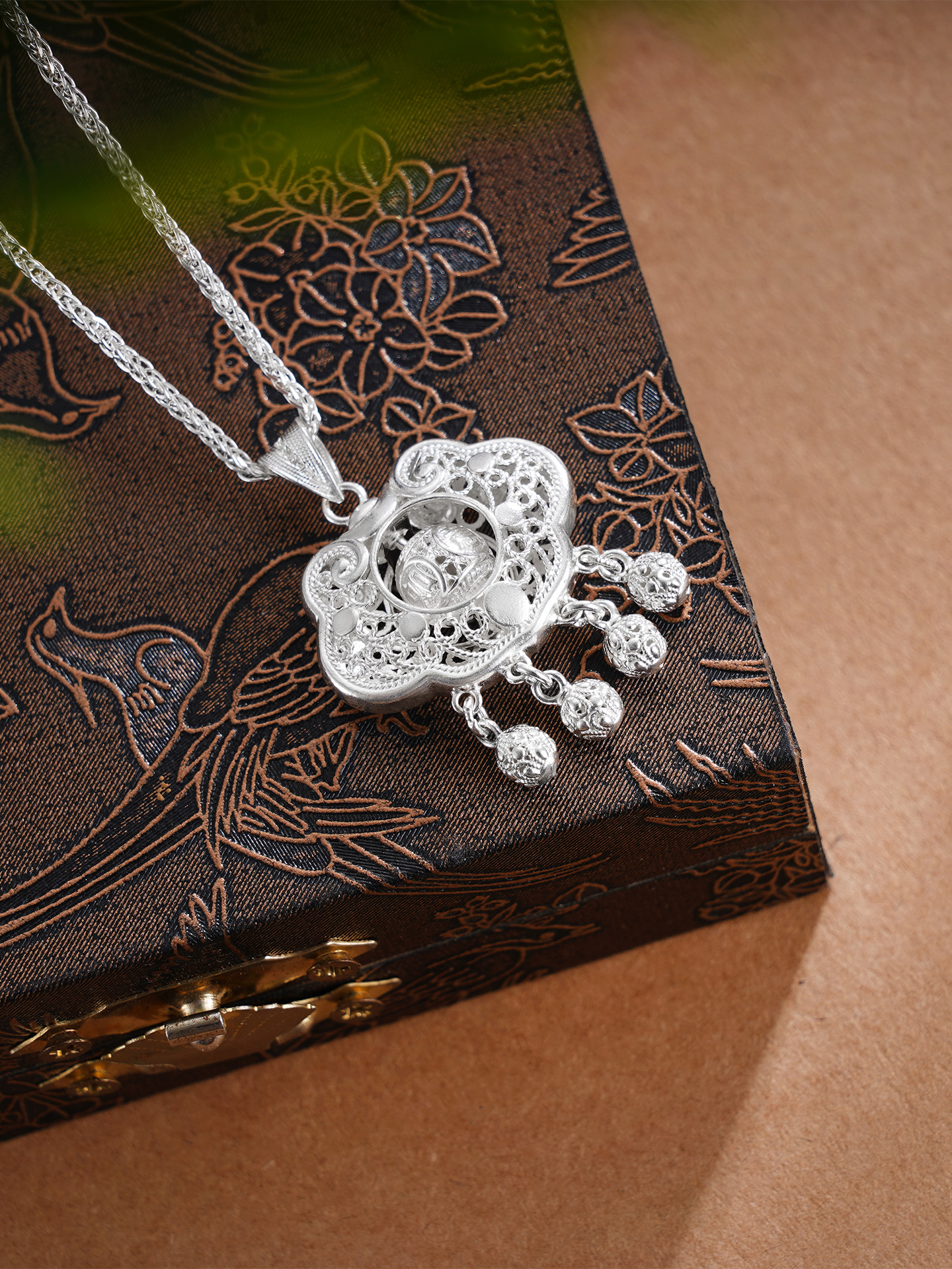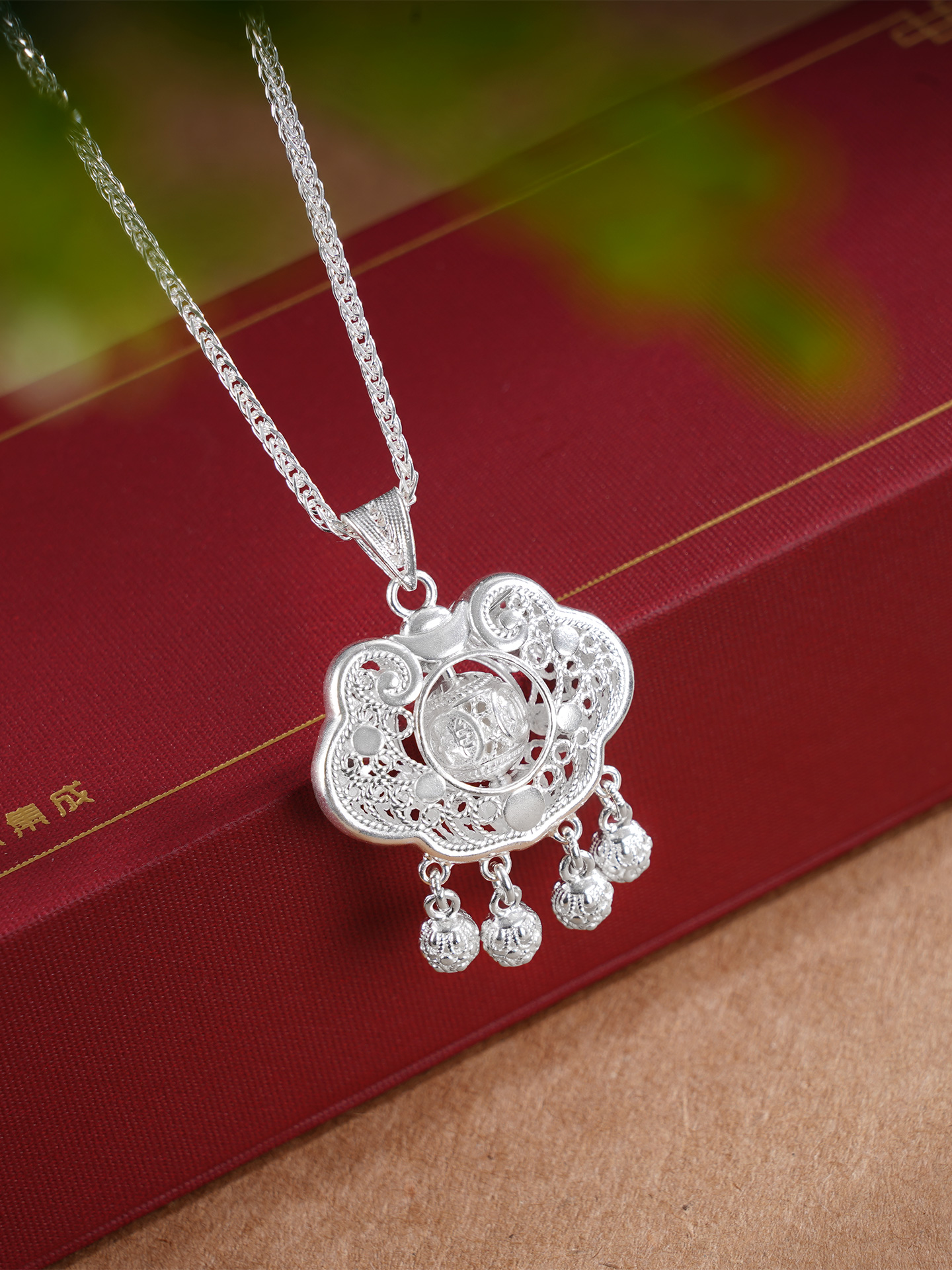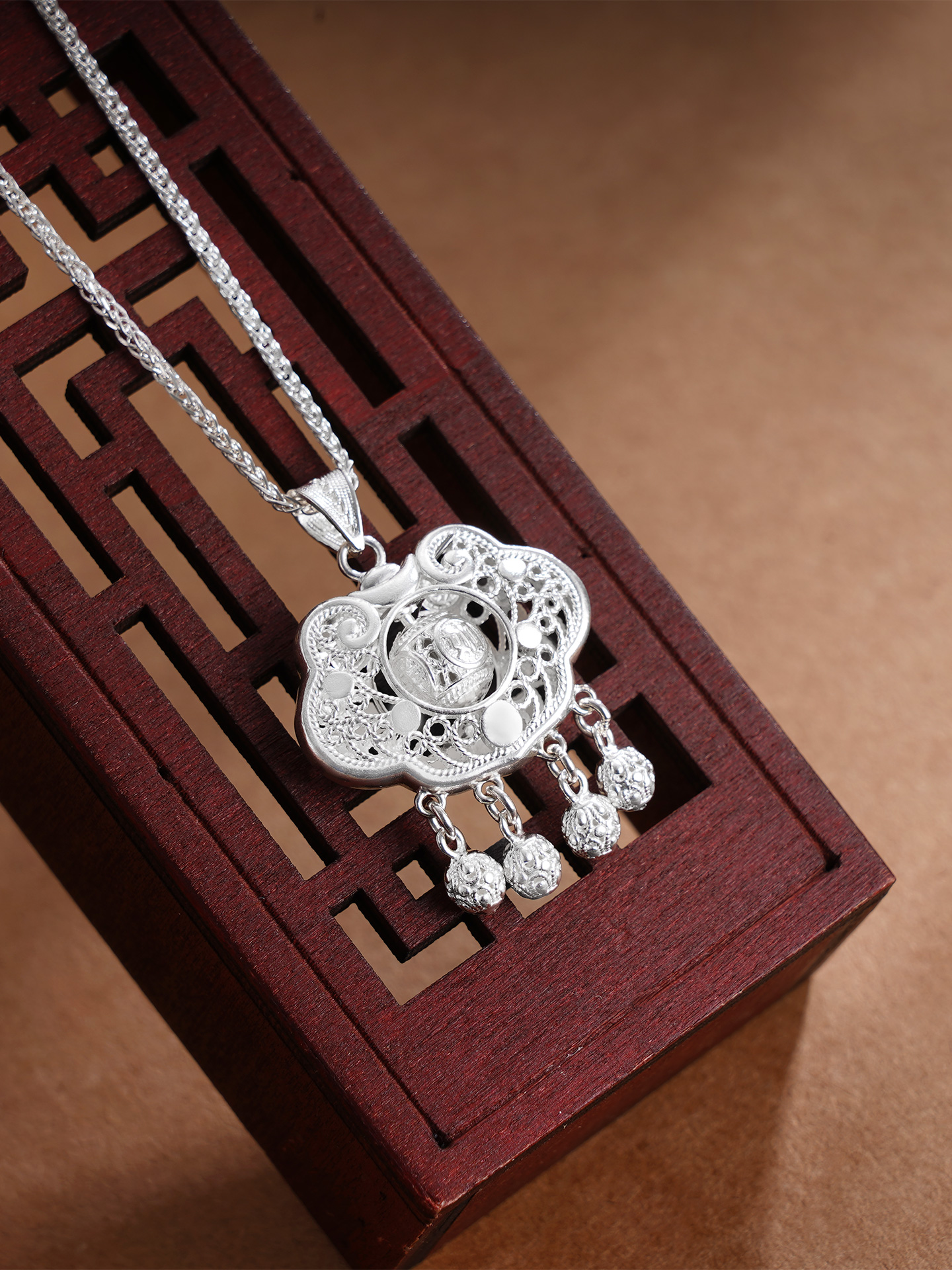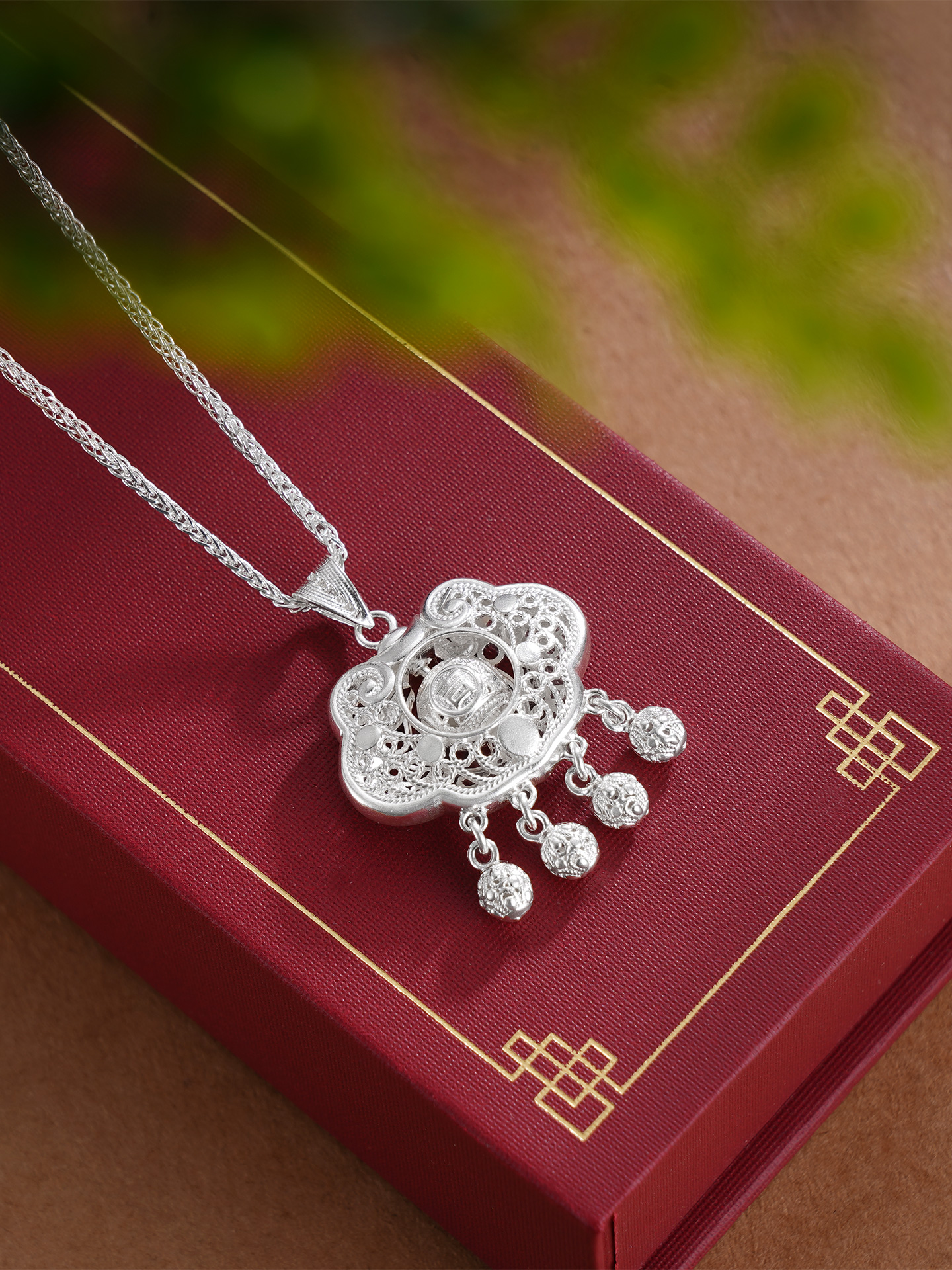 【寓意】:作品以象征平安吉祥的如意锁为灵感设计,采用银花丝工艺编织打造。如意锁下点缀流苏银珠,营造出如梦如幻之感,与新中式裙装搭配,典雅优美,袅娜明艳。