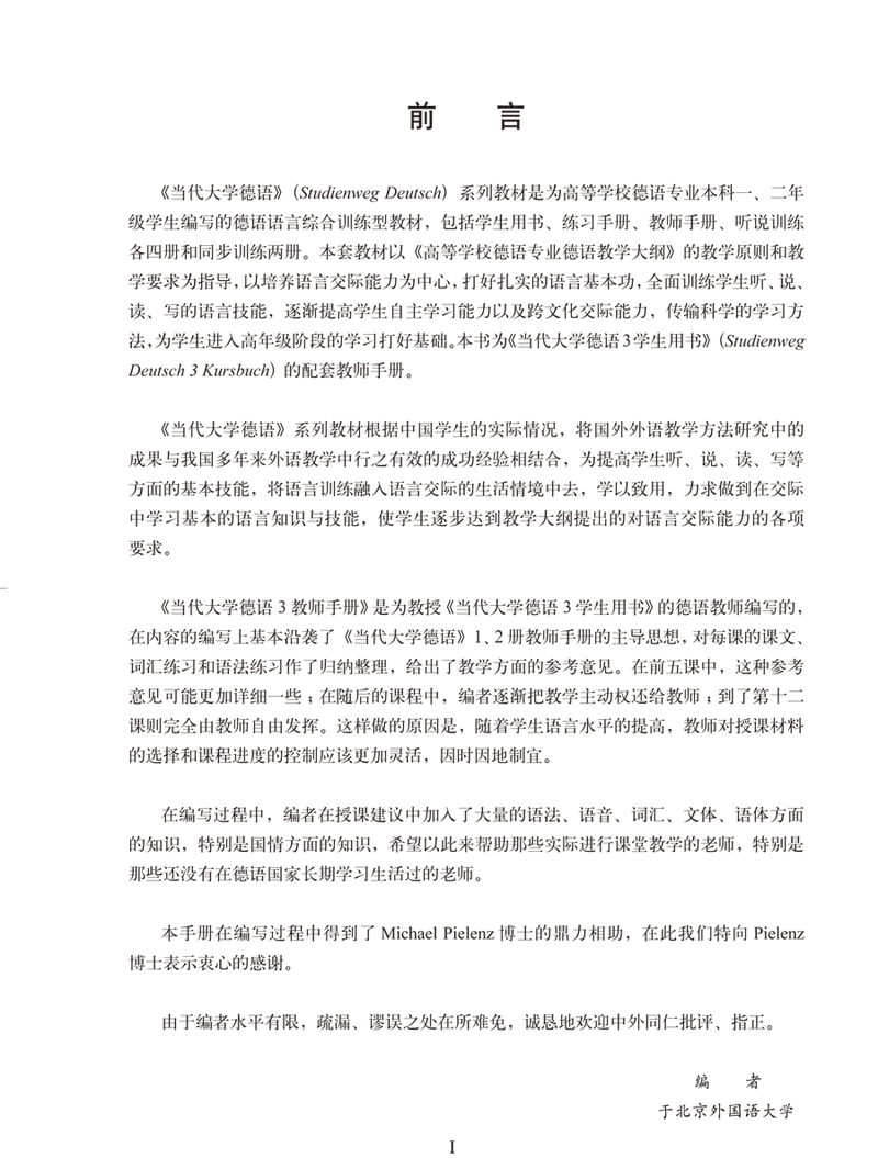 本书为高等学校德语专业教材《当代大学德语3学生用书》的配套教师用书。本书根据中国学生的实际情况,将国外外语教学方法研究中的成果与我国多年来外语教学中行之有效的成功经验相结合,为提高学生听、说、读、写等方面的基本知识与技能,将语言训练融于语言交际的生活情况中去,力求做到在交际中学习基本的语言知识与技能,学以致用,使学生逐步达到教学大纲提出的语言交际能力的各项要求。