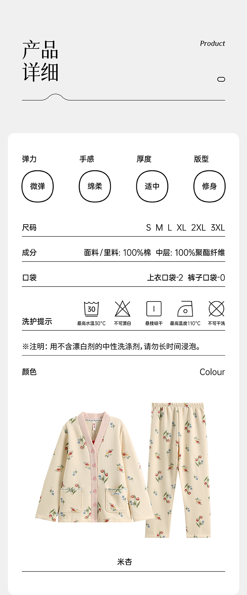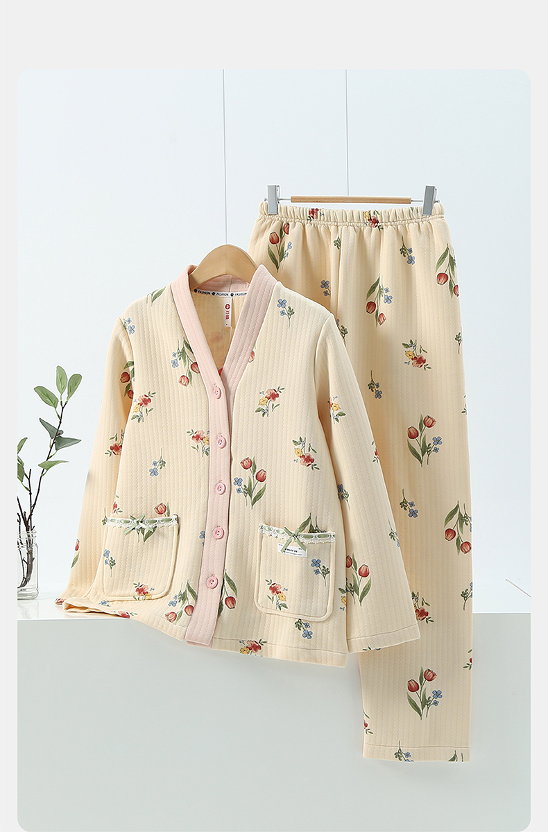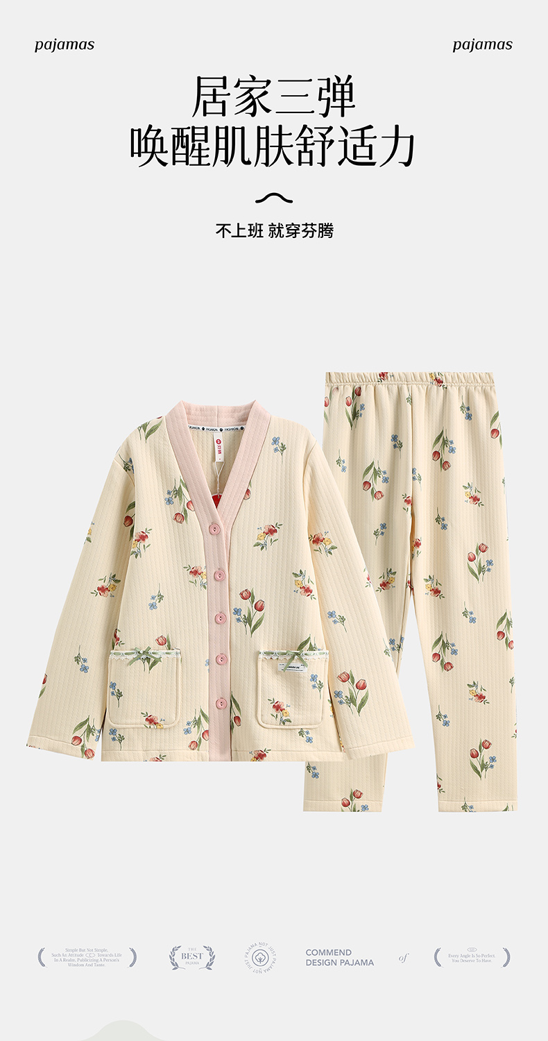 空气夹层针织夹棉睡衣冬季保暖加厚家居服套装芬腾