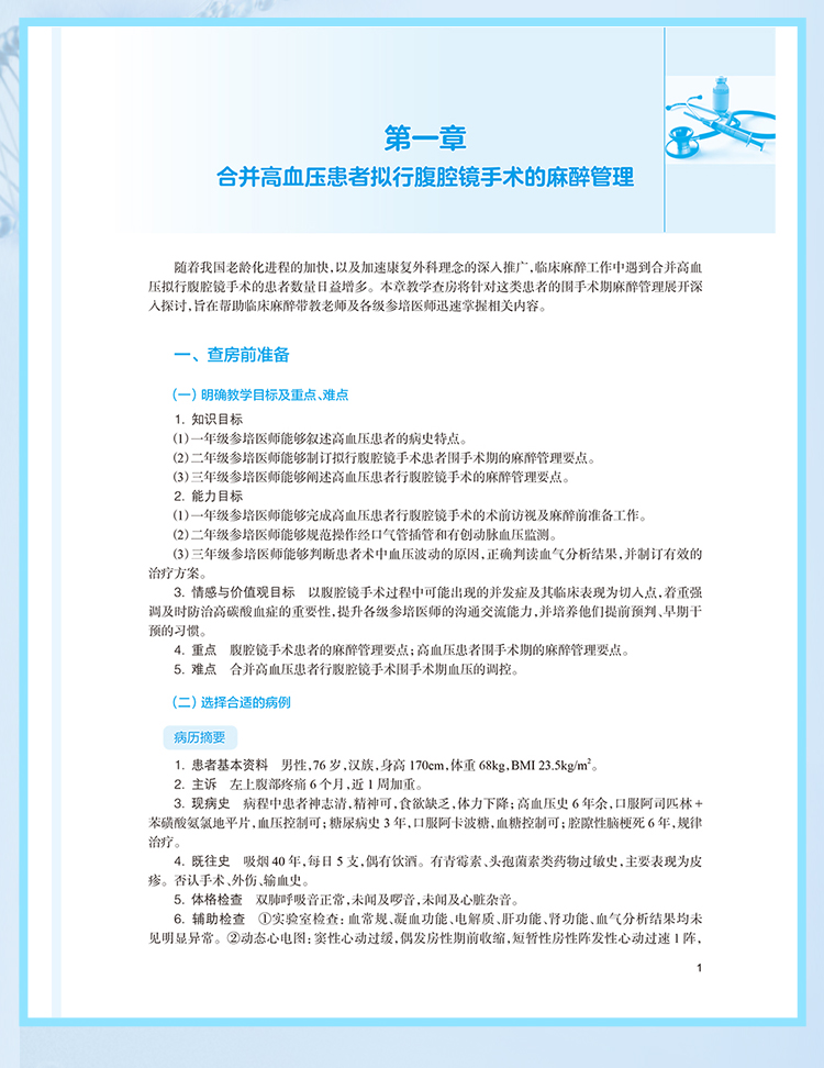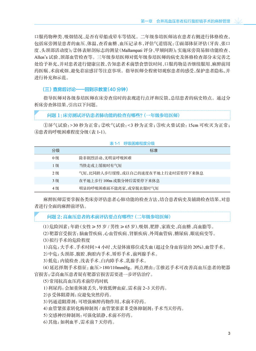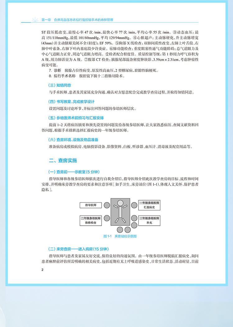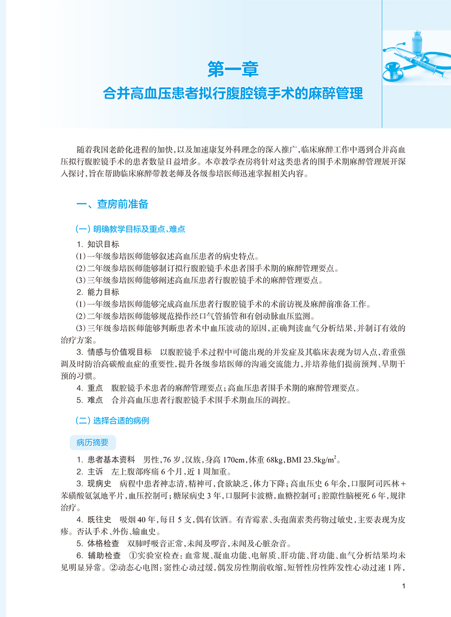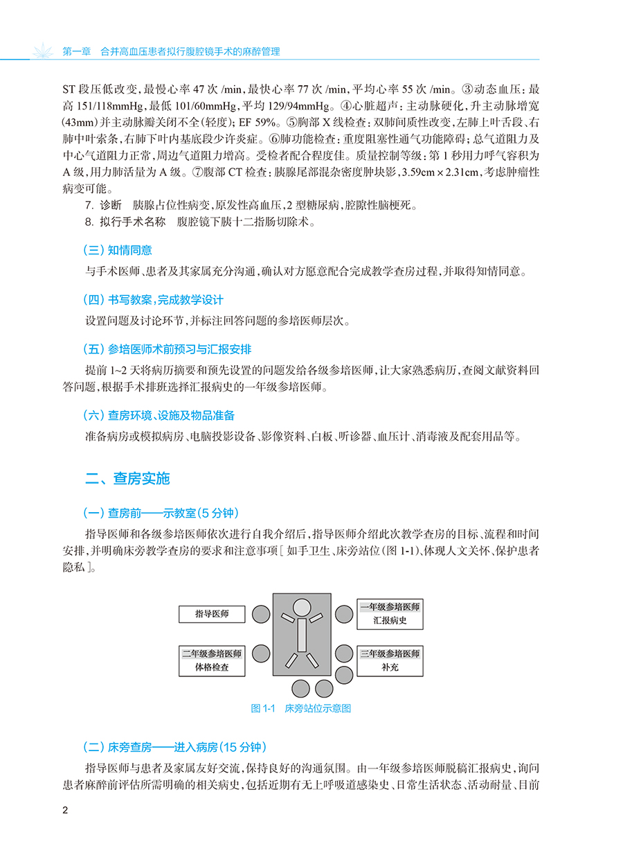 本书共26个章节,根据《住院医师规范化培训内容与标准》中麻醉专业基地必须具备的12个临床亚专业及临床技能操作要求,从每个亚专业中选取一个复杂案例、一个常见案例进行教学查房,以住院医师的六大岗位胜任力来展开教学查房的教学设计,并录制了典型案例的示范性教学查房视频,将必须具备的常用的9项临床技能操作内容录制真实视频作为教学素材进行教学展示。 教学培养目标包括:①概括疾病手术需求并设计麻醉方案;②评估麻醉相关风险并制订解决预案;③预测围麻醉期转归并提出预防措施;④提出临床问题并引导开展自主学习;⑤示范手术团队合作并体现人文关怀。麻醉科专业教学查房是以真实手术患者围术期管理过程为教学内容,要求指导医师、住院医师、患者三方共同参与教学互动,促进住院医师从临床案例诊疗中学习。通过指导医师启发与指导、针对相关临床问题全程探讨并学习的形式进行。