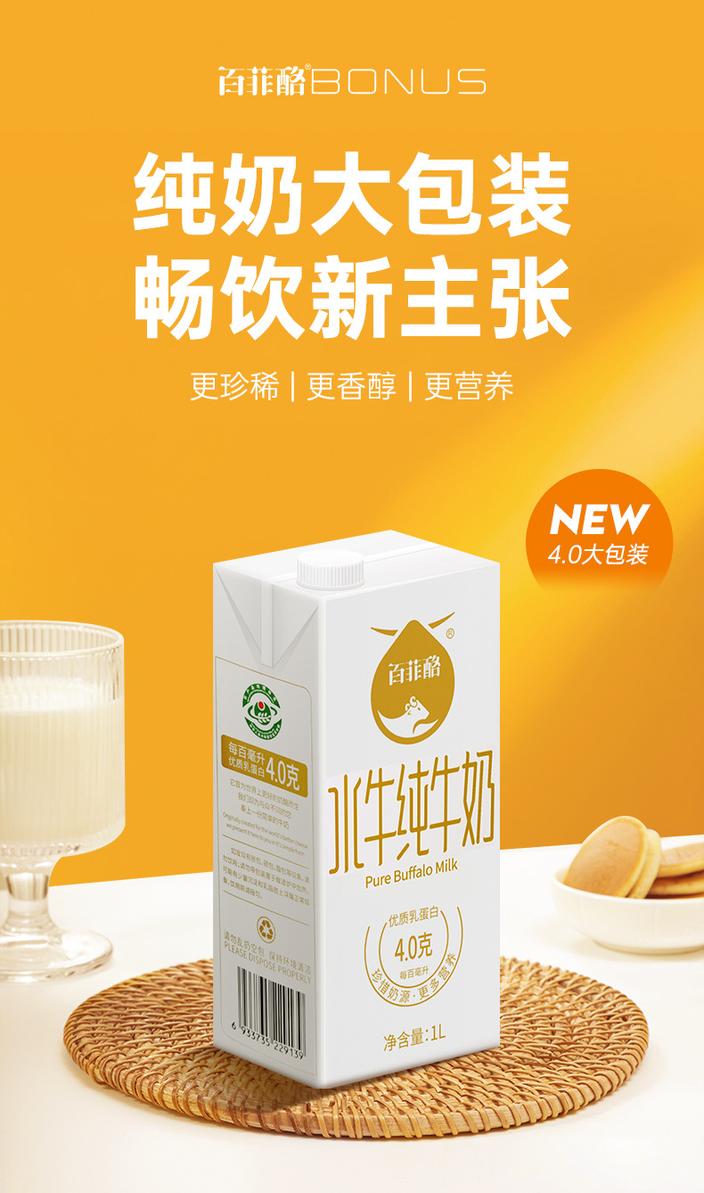 百菲酪4.0g乳蛋白水牛纯牛奶 家庭畅饮1L分享装 更珍稀更香醇