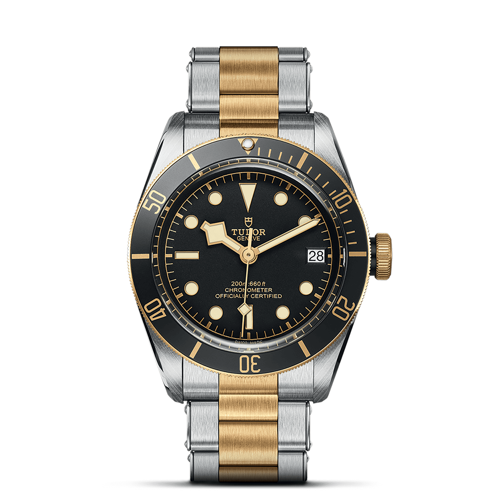 旋入式上链表冠,刻有帝舵表玫瑰标志,黑色漆面,配黑色阳极氧化铝上链表冠轴;精钢覆有0.3毫米18K黄金薄层
