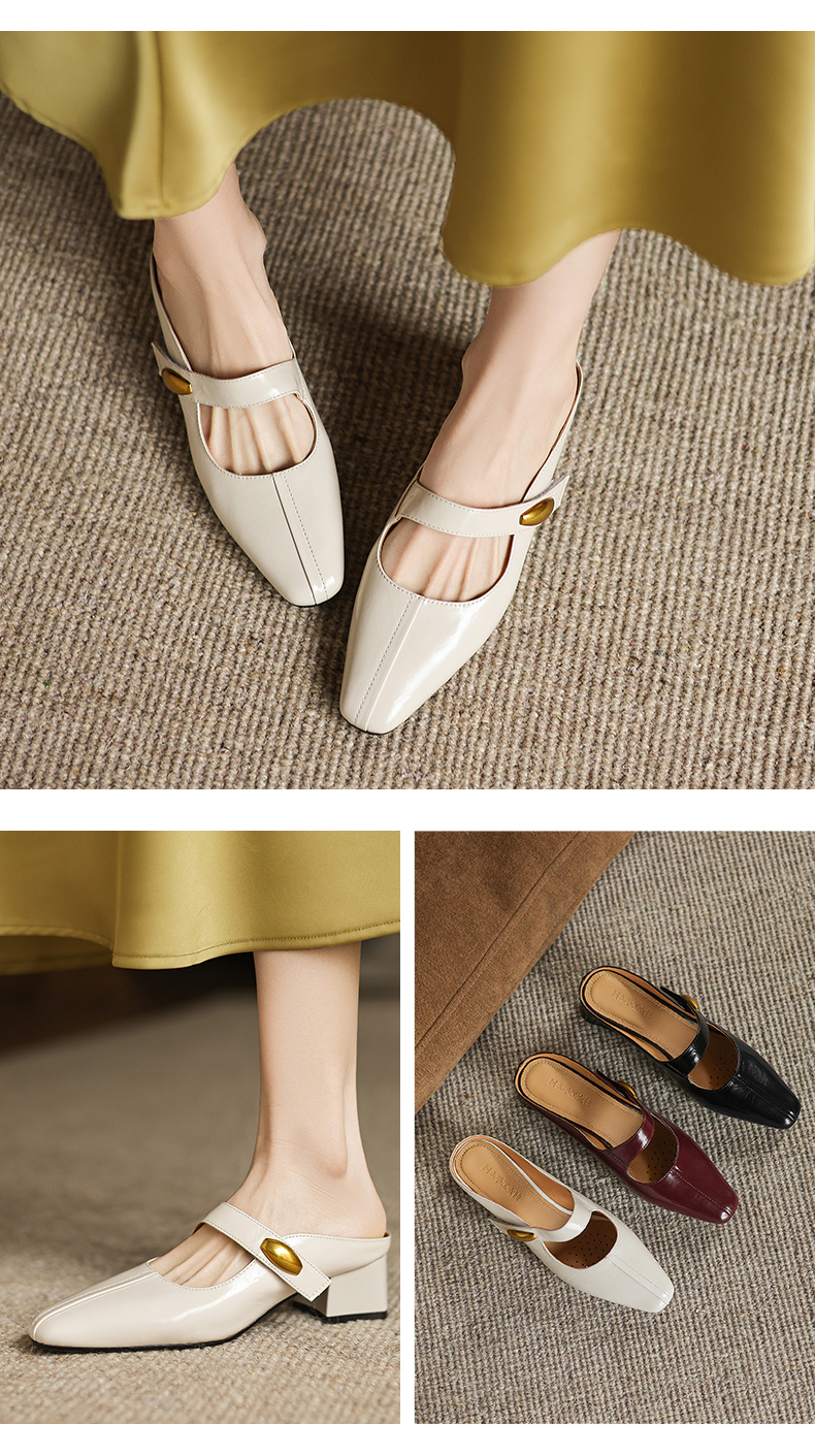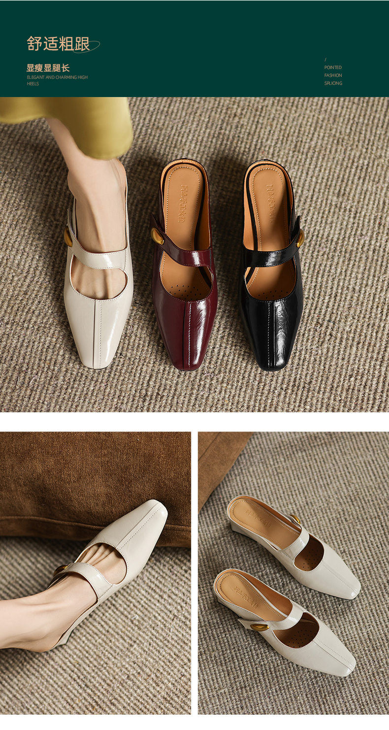 阿么手工女鞋粗跟一字带穆勒拖鞋夏季小方头复古风浅口包头拖4CM