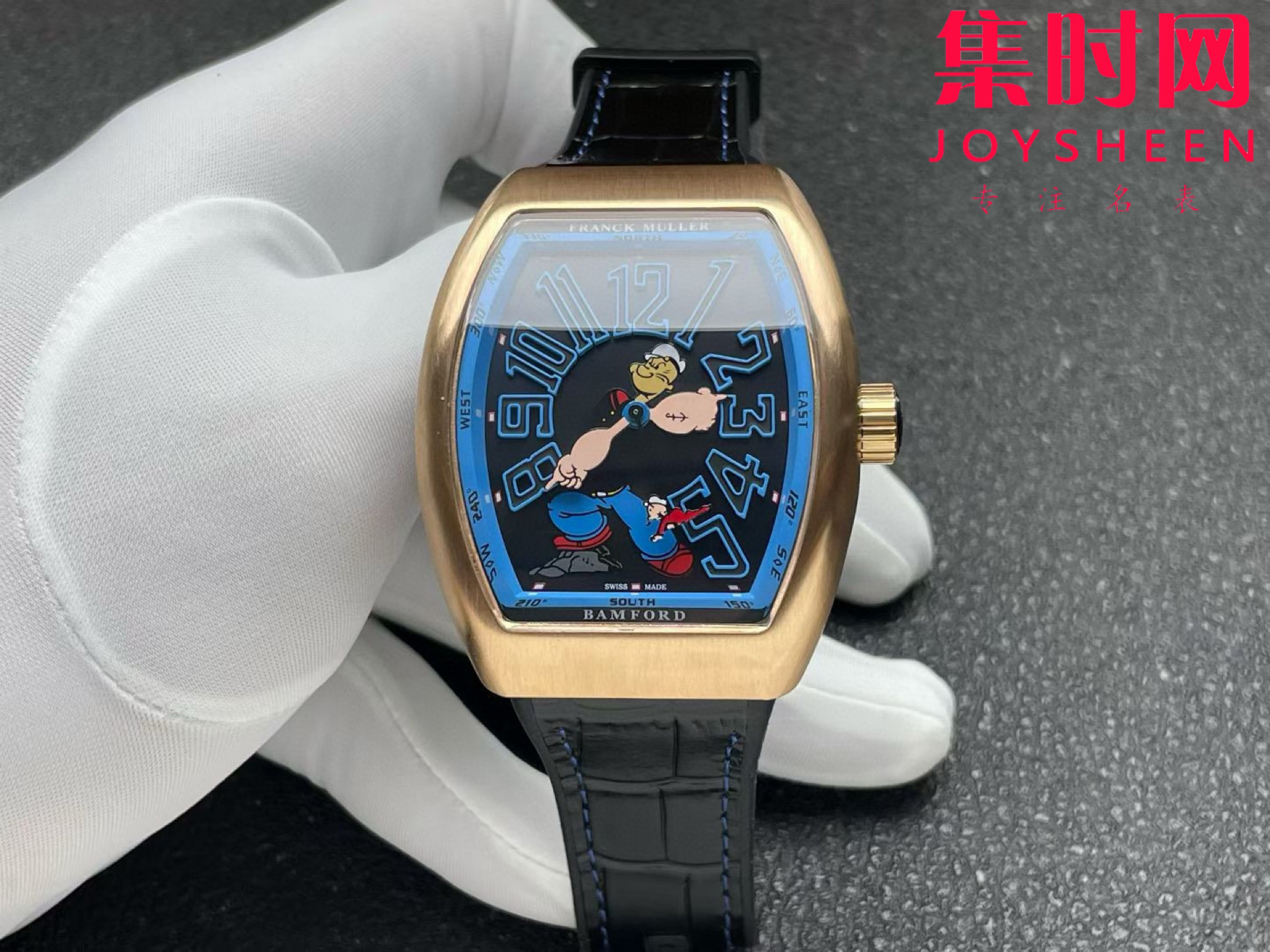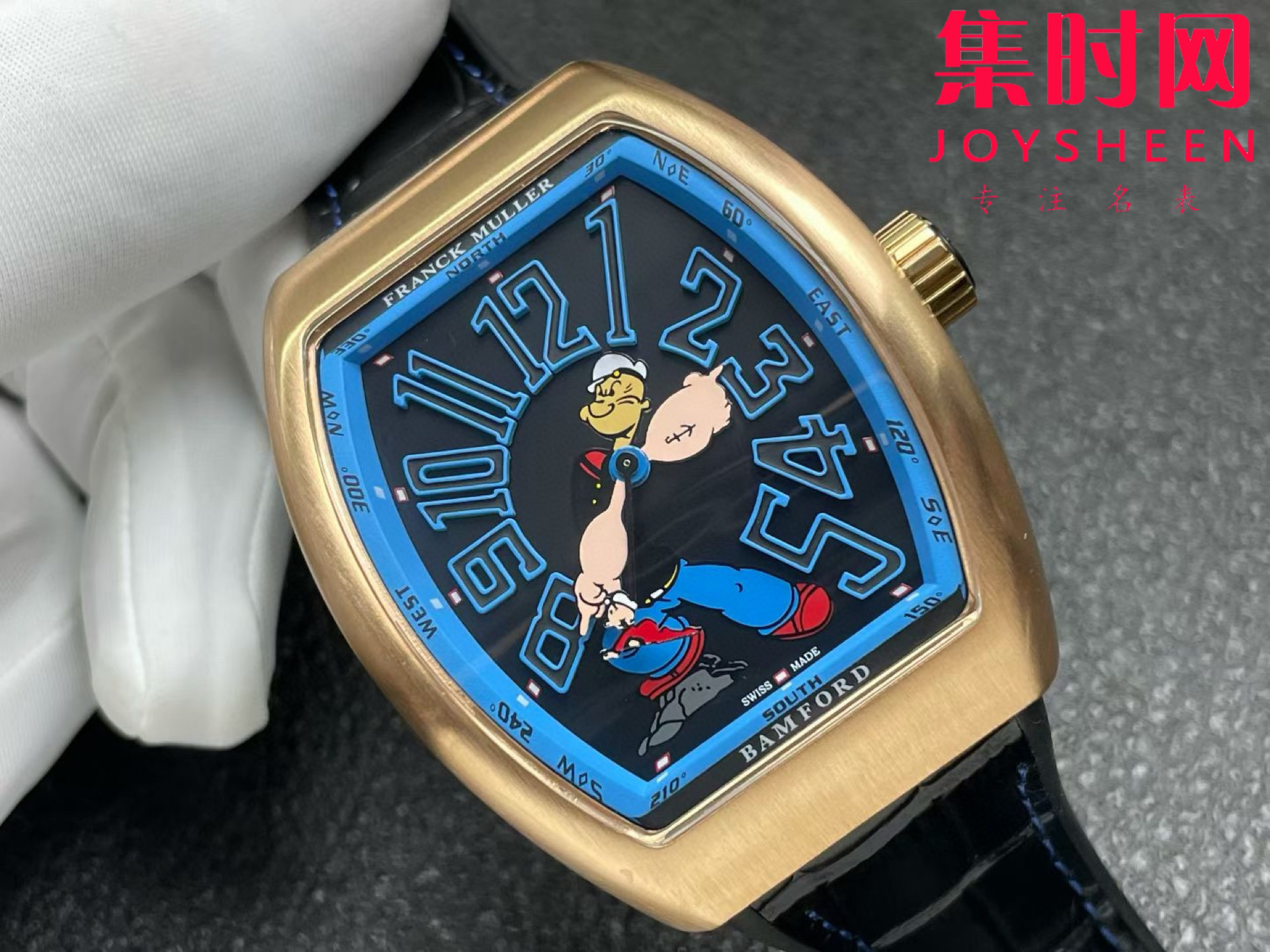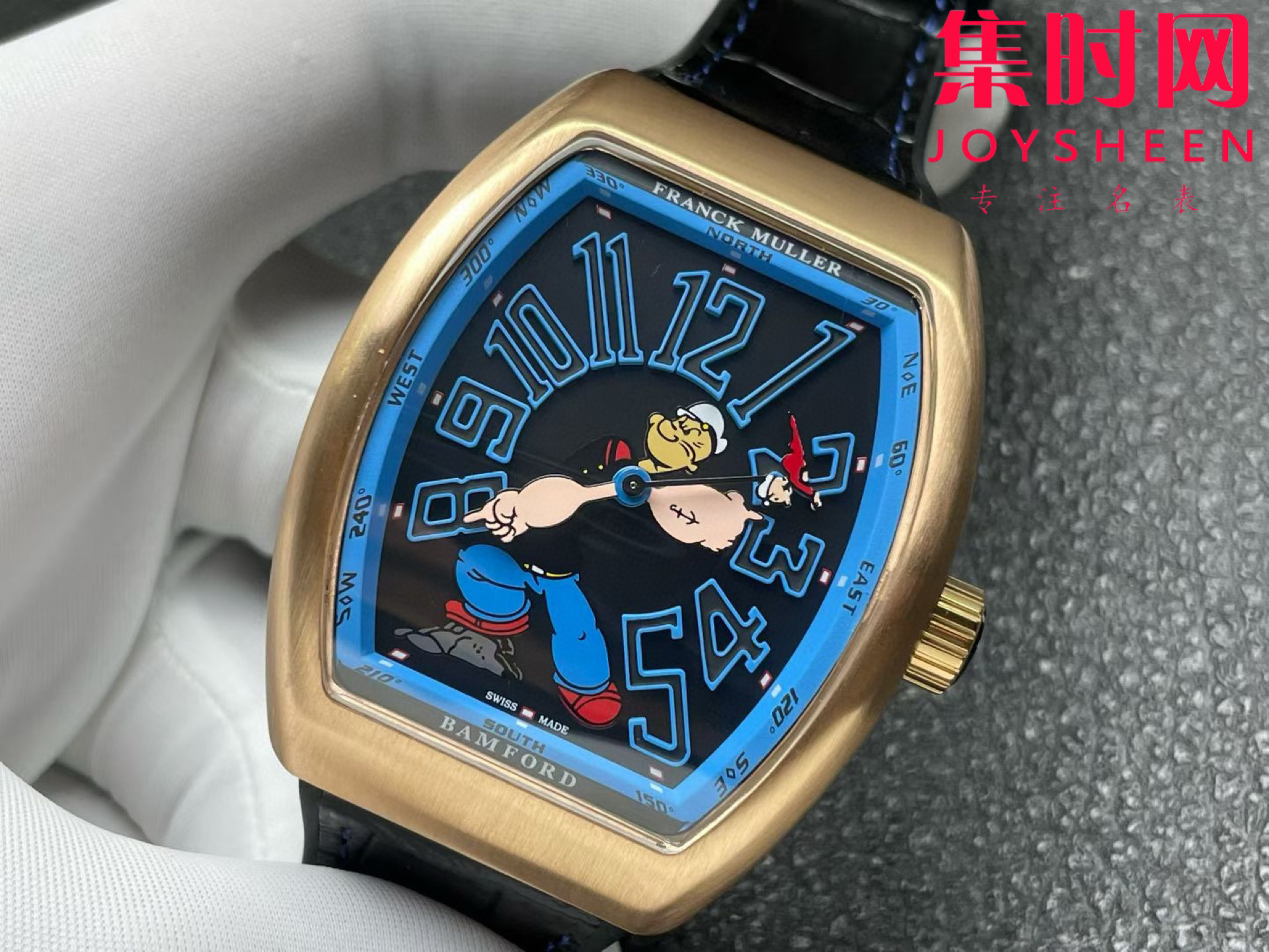 ABF法兰克穆勒 法穆兰 新款Vanguard系列 V45游艇系列"大力水手"男士腕表 以大力水手波派的强壮双臂充当时分指针,以波派和奥利弗的儿子贝比作为秒针,在表盘上"爬动",简洁和创新的美感,超凡脱俗。