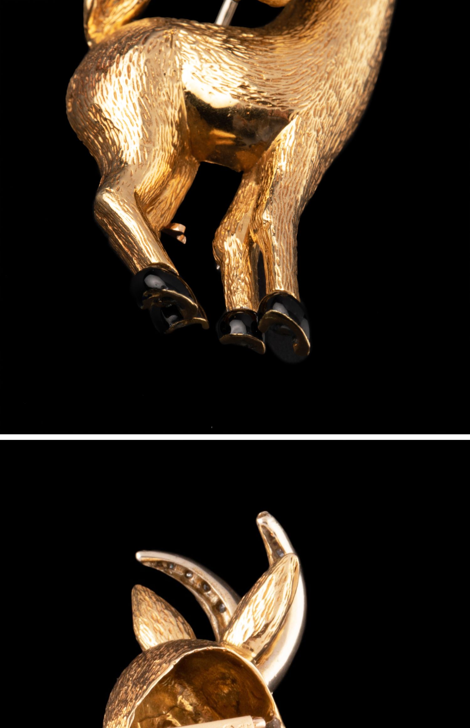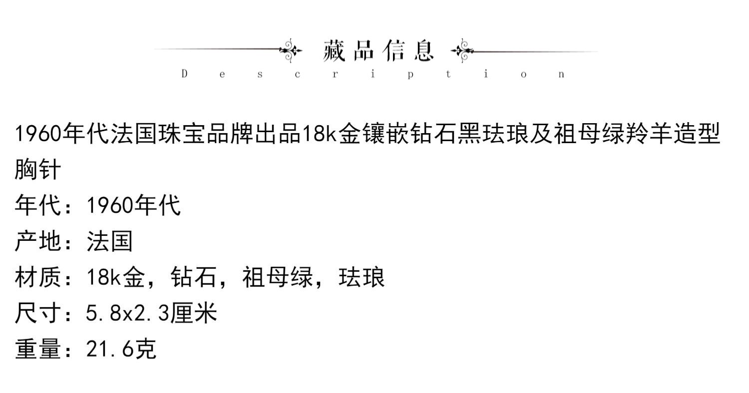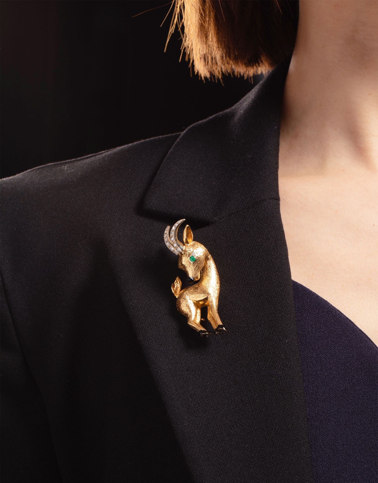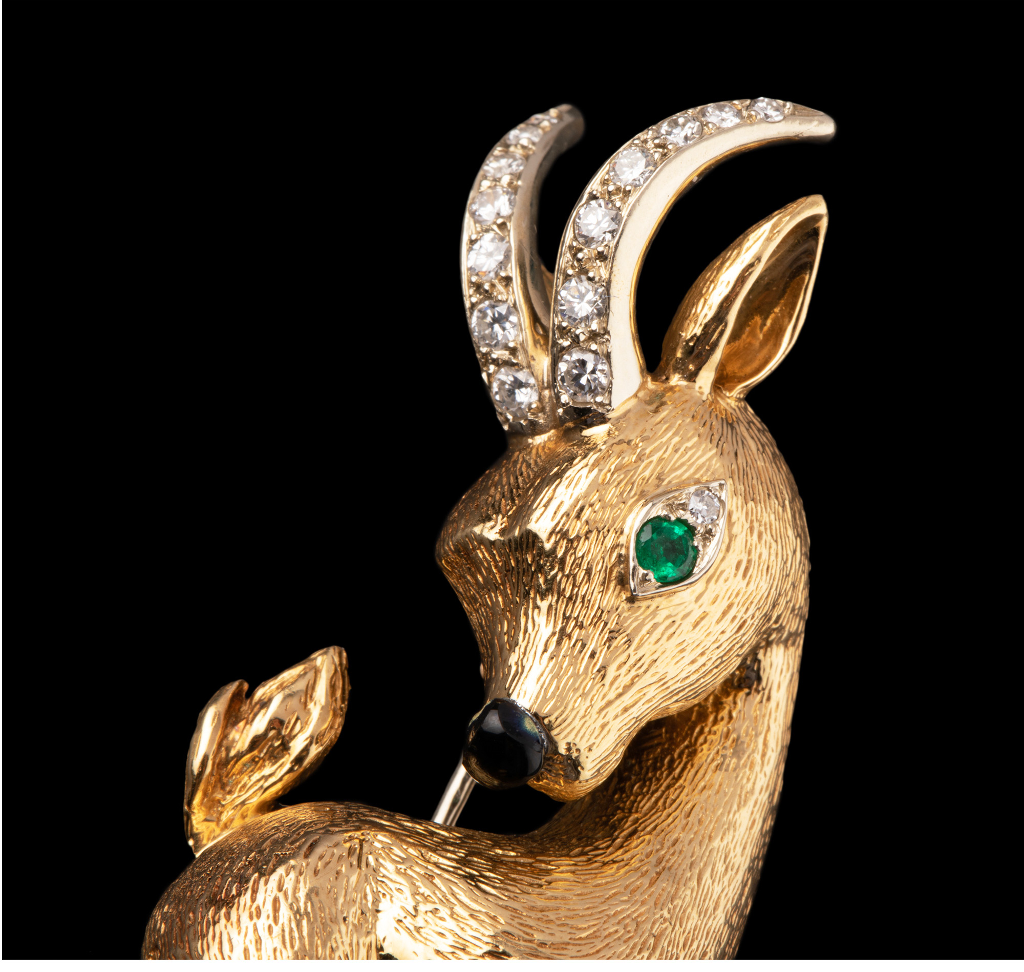 独角鹿西洋古董法国珠宝品牌18k金镶嵌钻石黑珐琅祖母绿羚羊胸针