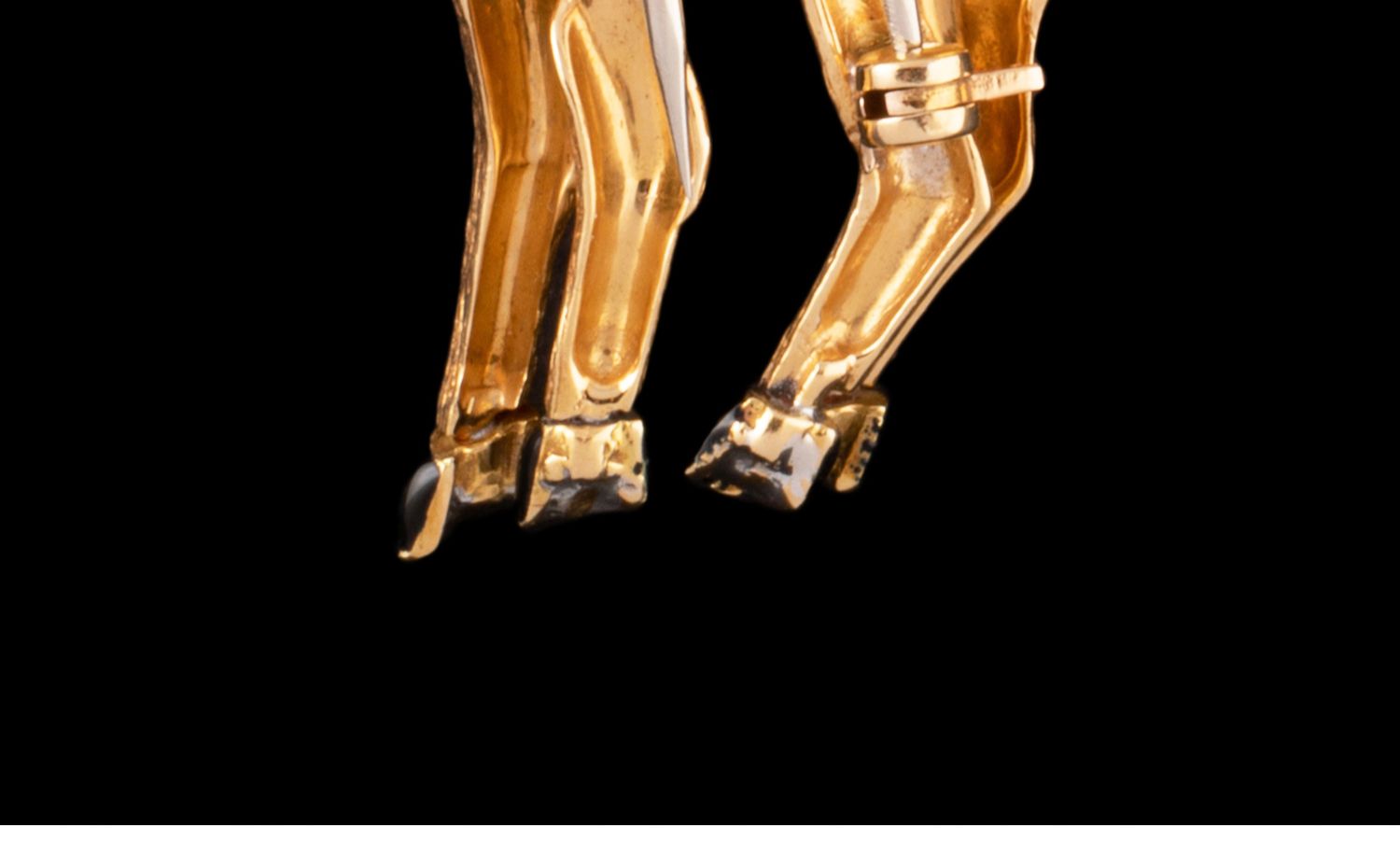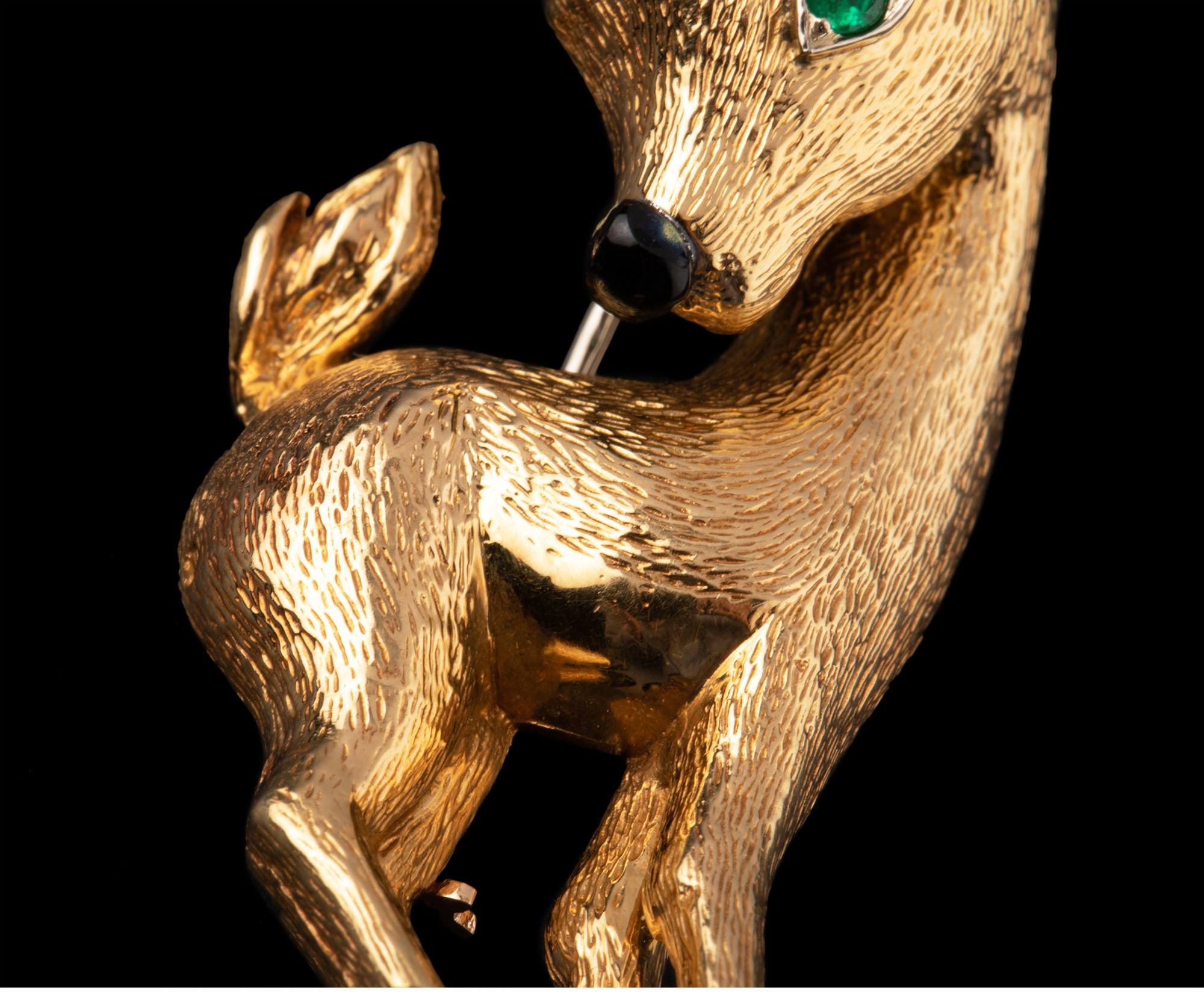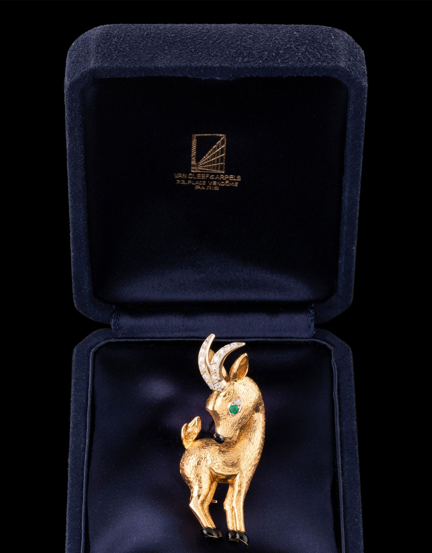 独角鹿西洋古董法国珠宝品牌18k金镶嵌钻石黑珐琅祖母绿羚羊胸针